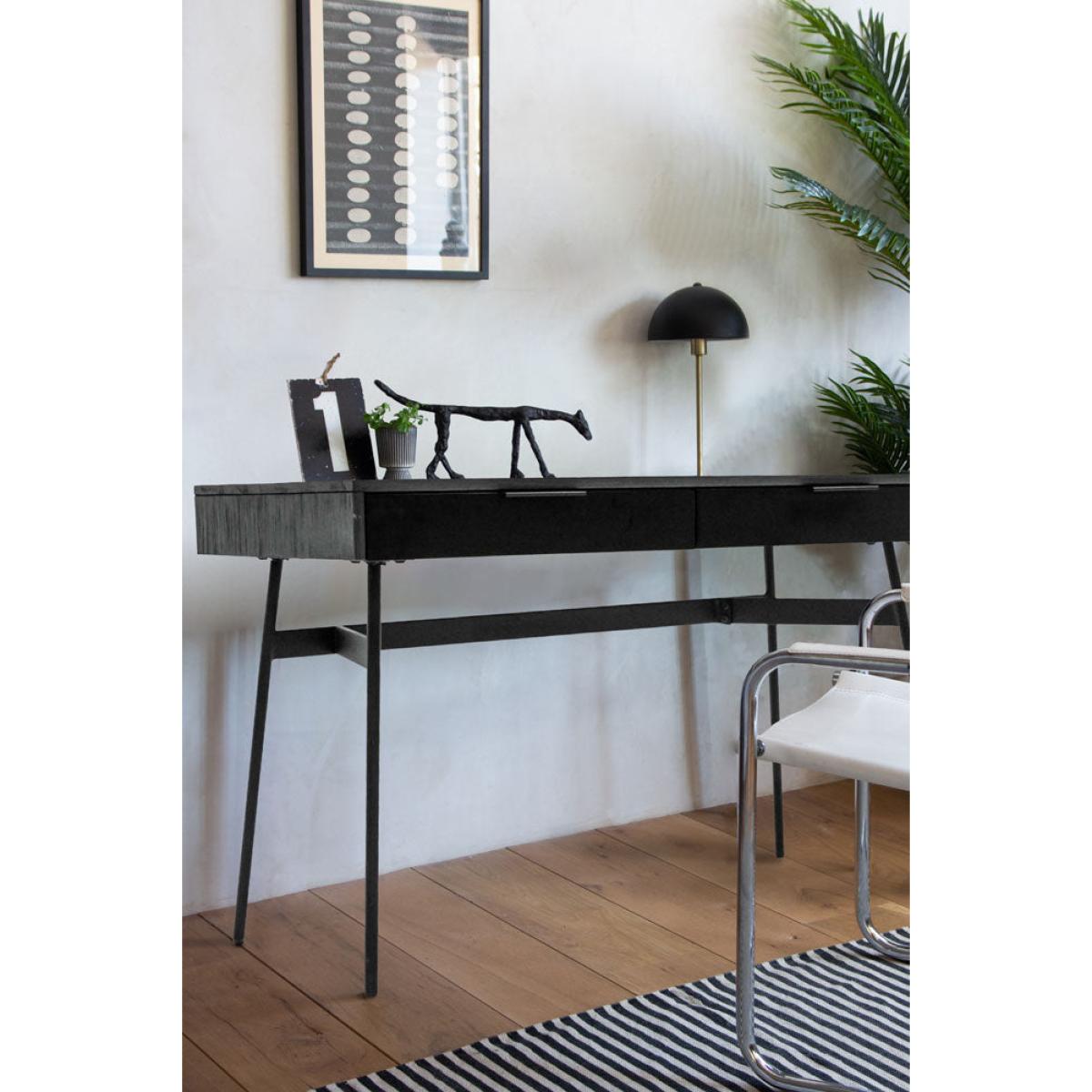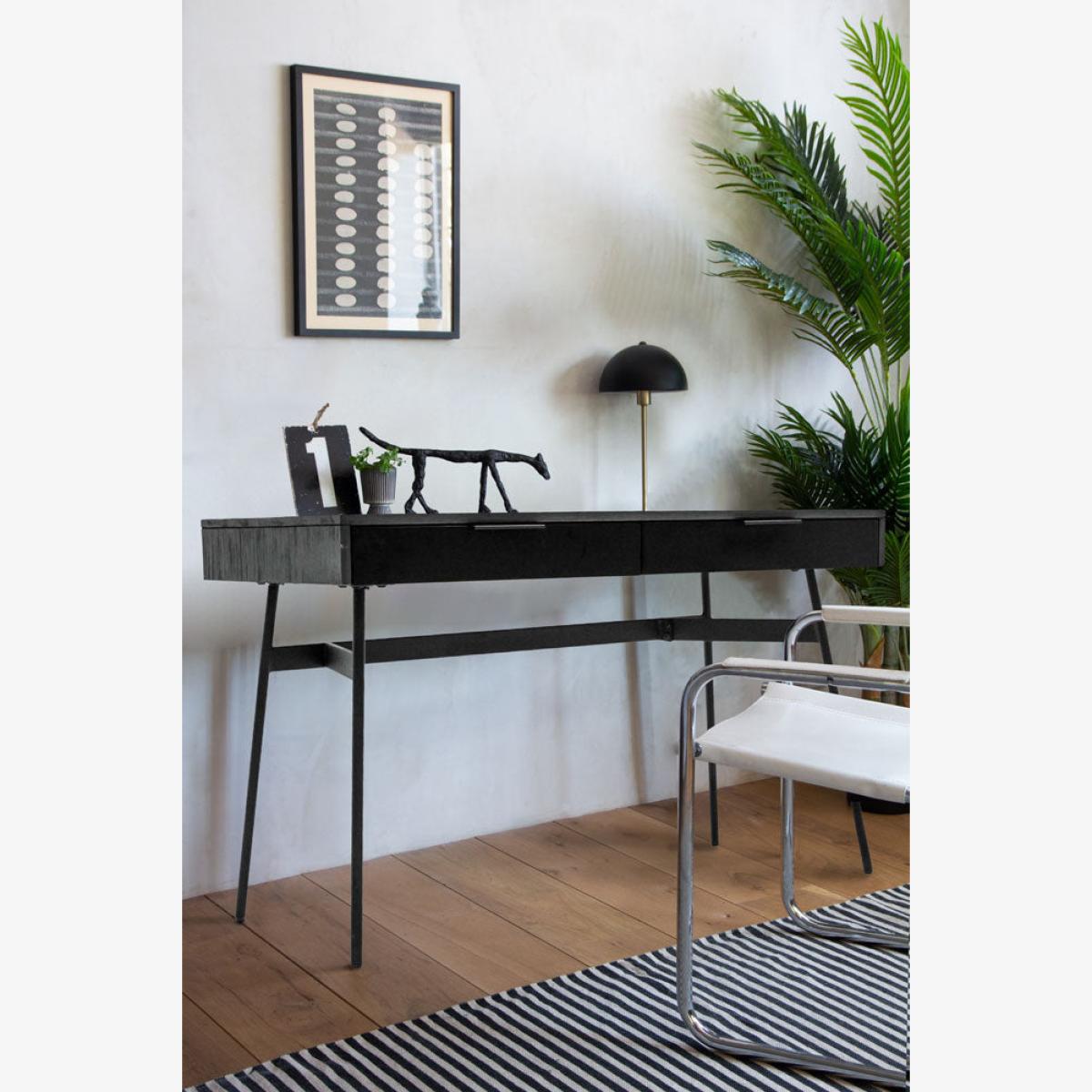 This is a modern home office essential – sleek, smart, yet roomy enough for all your essentials, with double drawer space to spare. The neat design makes it perfect for smaller spaces, and it brings a practical element we love, too. Contemporary powder-coated legs complement the dark-stained acacia wooden frame, in which cable holes are cut to help prevent all your wires getting in a tangle. A sturdy, stylish solution that is timelessly elegant.- Sleek Black Desk With Two Drawers - Material: Acacia wood  - Measures: H77cm x W120cm x D55cm