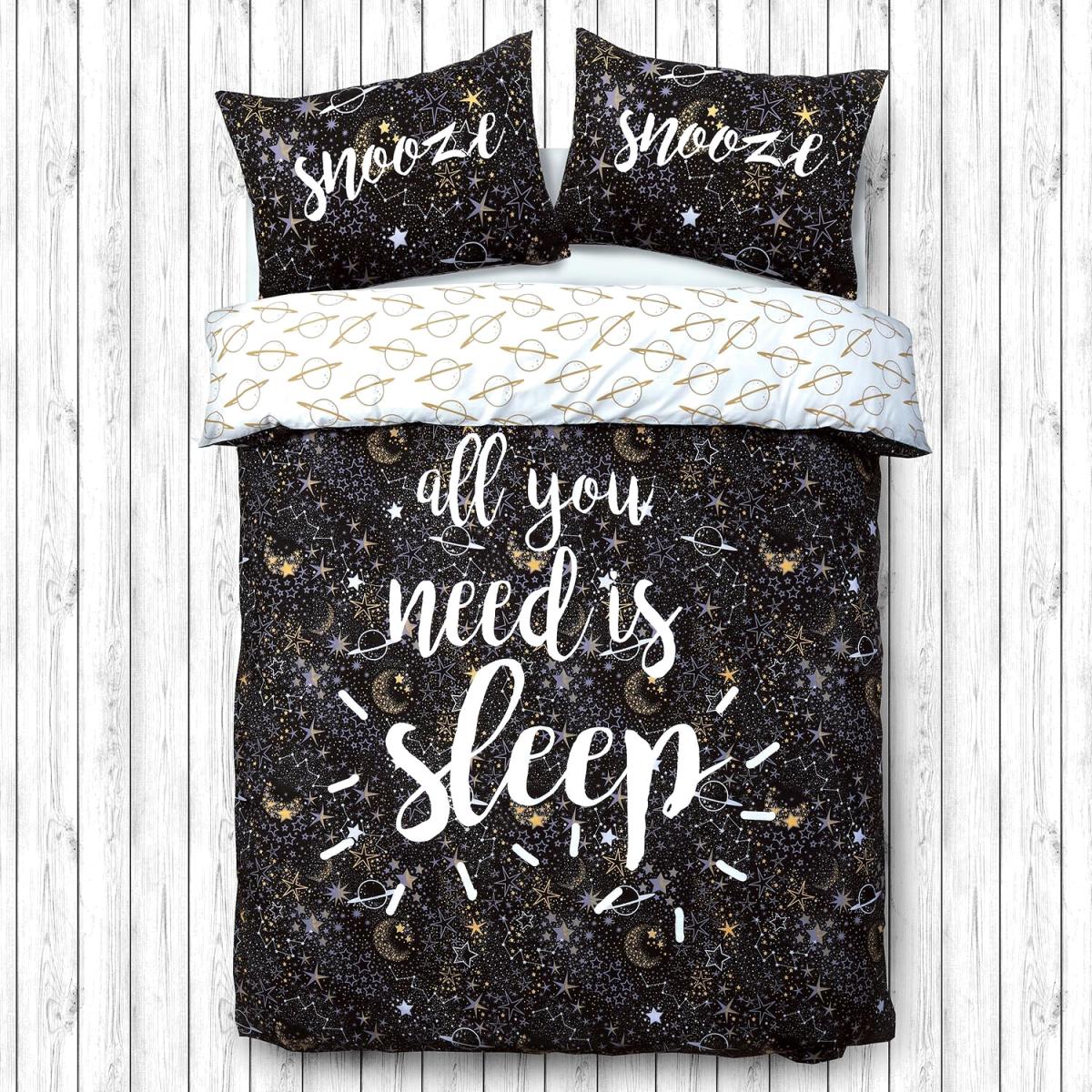 A cool and vibrant design for any contemporary space, this Sleep Slogan Duvet Cover and Pillowcase Set is sure to strike the perfect nighttime tone. Printed with stars and planets and finished with an 'All you need is sleep' slogan and coordinating 'snooze' slogans on the pillowcases, this duvet set adds a unique, galaxy-inspired touch to your bedroom.