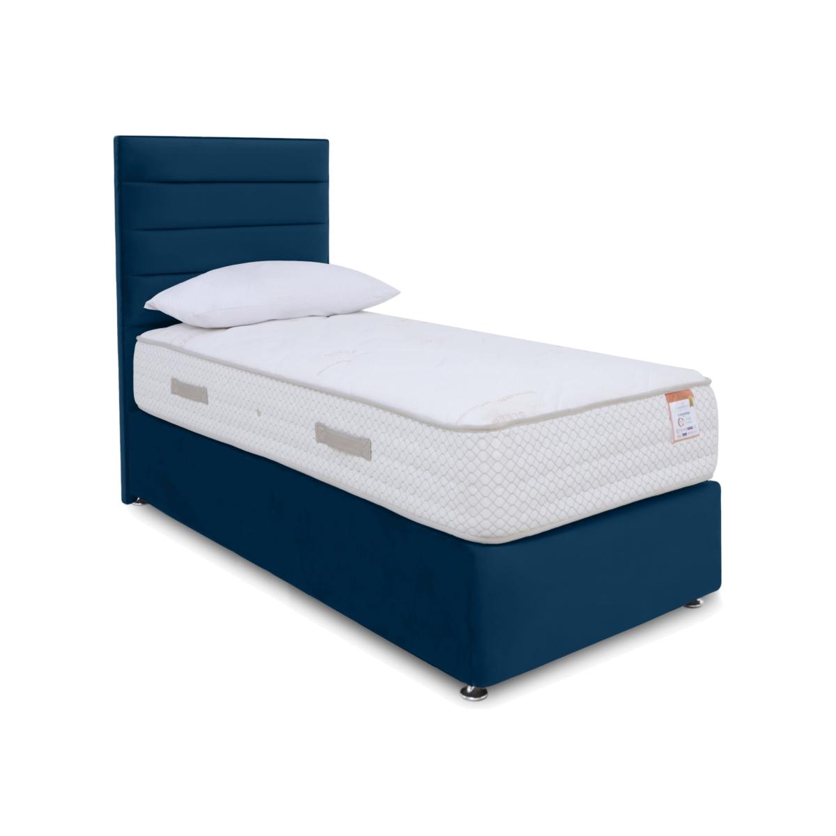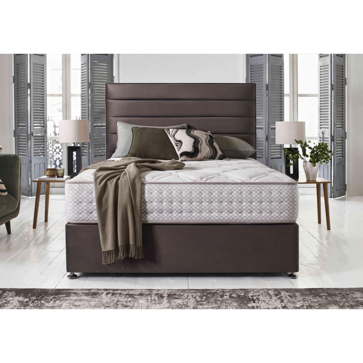 Enjoy advanced mattress comfort with innovative Copper Sleep technology for sleep like never before. As well as AdvantEdge® pocket spring systems which provides total body support across the entire sleep surface, the mattresses in our Sleep Story Copper 2000 range have copper-infused memory foam for cooler and fresher sleep, optimised support and spinal alignment, and even reduced joint swelling and inflammation. The collection also offers a wide choice of beautifully upholstered divan sets with optional drawer or ottoman storage including an electric-powered ottoman divan set. Handcrafted by Highgrove, the great-value Sleep Story Copper 2000 bed and mattress collection is only available at Furniture Village. This innovative divan set includes a copper-infused memory foam mattress with 2000 pocket springs in king size and a beautifully upholstered divan base with optional storage drawers. Why you'll love it The mattress in this divan set features Copper Sleep technology. Sleep innovation at a great-value price. The AdvantEdge® pocket spring system has 2000 springs in king size. Promises total body support across the entire sleep surface and prevents roll together. Unique copper-infused memory foam is activated by body weight and movement. Optimises hip and shoulder support and improves spinal alignment. Helps draw heat away from the body for cooler and more comfortable sleep. Designed to help relieve sore and swollen joints and reduce inflammation. Copper is also anti-bacterial and anti-microbial for cleaner and healthier sleep. Luxuriously soft stretch-fabric cover even has copper woven in. Hypoallergenic. Divan set includes a platform-top base with optional storage drawers. Available in a wide selection of stylish upholstery fabrics. Made in the UK by Highgrove and exclusive to Furniture Village. This divan set is part of Sleep Story Copper 2000 range. Shop the Sleep Sleep Story Copper 2000 range for mattresses, divan sets, electric ottoman beds and more. What you need to know Headboard is an optional extra. Mattress type: Pocket spring. Depth: 30 cm. Weight:Small single 22.5 kg, single 27 kg, small double 36 kg, double 40.5 kg, king 45 kg and super king 54.6 kg. Firmness: Medium. Springs: 2000 pocket springs in king size. Pillow top: No. Fillings: Memory foam. Cover: Stretch cover woven with copper. Requires turning: No. Base type: Platform top with optional storage drawers. Sizes: Small single, single, small double, double, king and super king. Mattress care:Air for 4 hours before using to remove any odour. Indentations caused by settlement of fillings or body weight are normal and are not considered defects. If used on a slatted bed frame, the space between slats must be no wider than 7.5 cm. Spaces wider than this may cause excess dipping of the mattress and invalidate the guarantee. Always use a mattress protector. Rotate regularly. Divan base care: Clean upholstery weekly using a soft brush or vacuum with the curtain attachment. Professional cleaning advised for oil- and grease-based stains. Ordering a small double, double, king or super king size? Your divan base will be supplied in two halves for easier access.