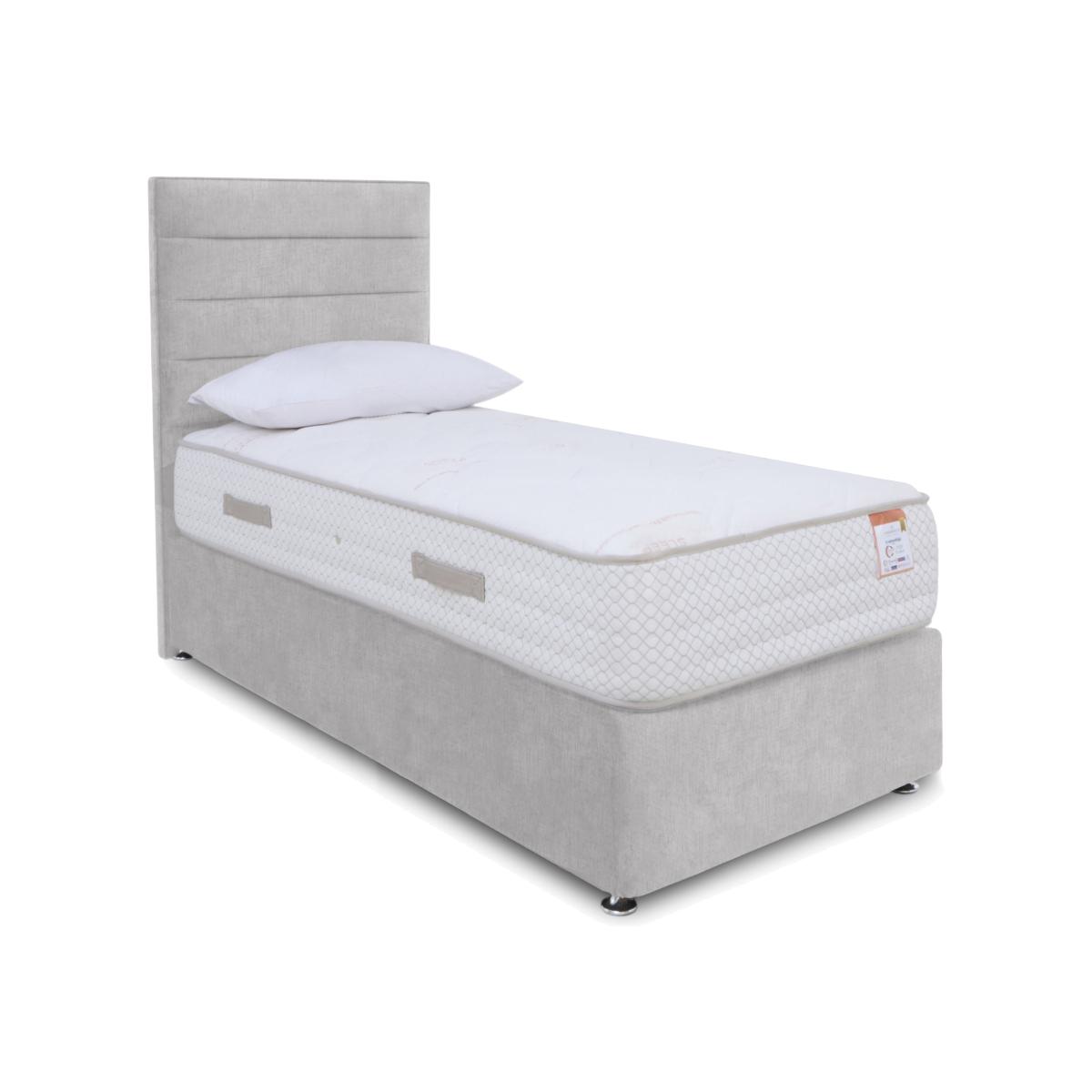 Enjoy advanced mattress comfort with innovative Copper Sleep technology for sleep like never before. As well as AdvantEdge® pocket spring systems which provides total body support across the entire sleep surface, the mattresses in our Sleep Story Copper 2000 range have copper-infused memory foam for cooler and fresher sleep, optimised support and spinal alignment, and even reduced joint swelling and inflammation. The collection also offers a wide choice of beautifully upholstered divan sets with optional drawer or ottoman storage including an electric-powered ottoman divan set. Handcrafted by Highgrove, the great-value Sleep Story Copper 2000 bed and mattress collection is only available at Furniture Village. This innovative divan set includes a copper-infused memory foam mattress with 2000 pocket springs in king size and a beautifully upholstered divan base with optional storage drawers. Why you'll love it The mattress in this divan set features Copper Sleep technology. Sleep innovation at a great-value price. The AdvantEdge® pocket spring system has 2000 springs in king size. Promises total body support across the entire sleep surface and prevents roll together. Unique copper-infused memory foam is activated by body weight and movement. Optimises hip and shoulder support and improves spinal alignment. Helps draw heat away from the body for cooler and more comfortable sleep. Designed to help relieve sore and swollen joints and reduce inflammation. Copper is also anti-bacterial and anti-microbial for cleaner and healthier sleep. Luxuriously soft stretch-fabric cover even has copper woven in. Hypoallergenic. Divan set includes a platform-top base with optional storage drawers. Available in a wide selection of stylish upholstery fabrics. Made in the UK by Highgrove and exclusive to Furniture Village. This divan set is part of Sleep Story Copper 2000 range. Shop the Sleep Sleep Story Copper 2000 range for mattresses, divan sets, electric ottoman beds and more. What you need to know Headboard is an optional extra. Mattress type: Pocket spring. Depth: 30 cm. Weight:Small single 22.5 kg, single 27 kg, small double 36 kg, double 40.5 kg, king 45 kg and super king 54.6 kg. Firmness: Medium. Springs: 2000 pocket springs in king size. Pillow top: No. Fillings: Memory foam. Cover: Stretch cover woven with copper. Requires turning: No. Base type: Platform top with optional storage drawers. Sizes: Small single, single, small double, double, king and super king. Mattress care:Air for 4 hours before using to remove any odour. Indentations caused by settlement of fillings or body weight are normal and are not considered defects. If used on a slatted bed frame, the space between slats must be no wider than 7.5 cm. Spaces wider than this may cause excess dipping of the mattress and invalidate the guarantee. Always use a mattress protector. Rotate regularly. Divan base care: Clean upholstery weekly using a soft brush or vacuum with the curtain attachment. Professional cleaning advised for oil- and grease-based stains. Ordering a small double, double, king or super king size? Your divan base will be supplied in two halves for easier access.