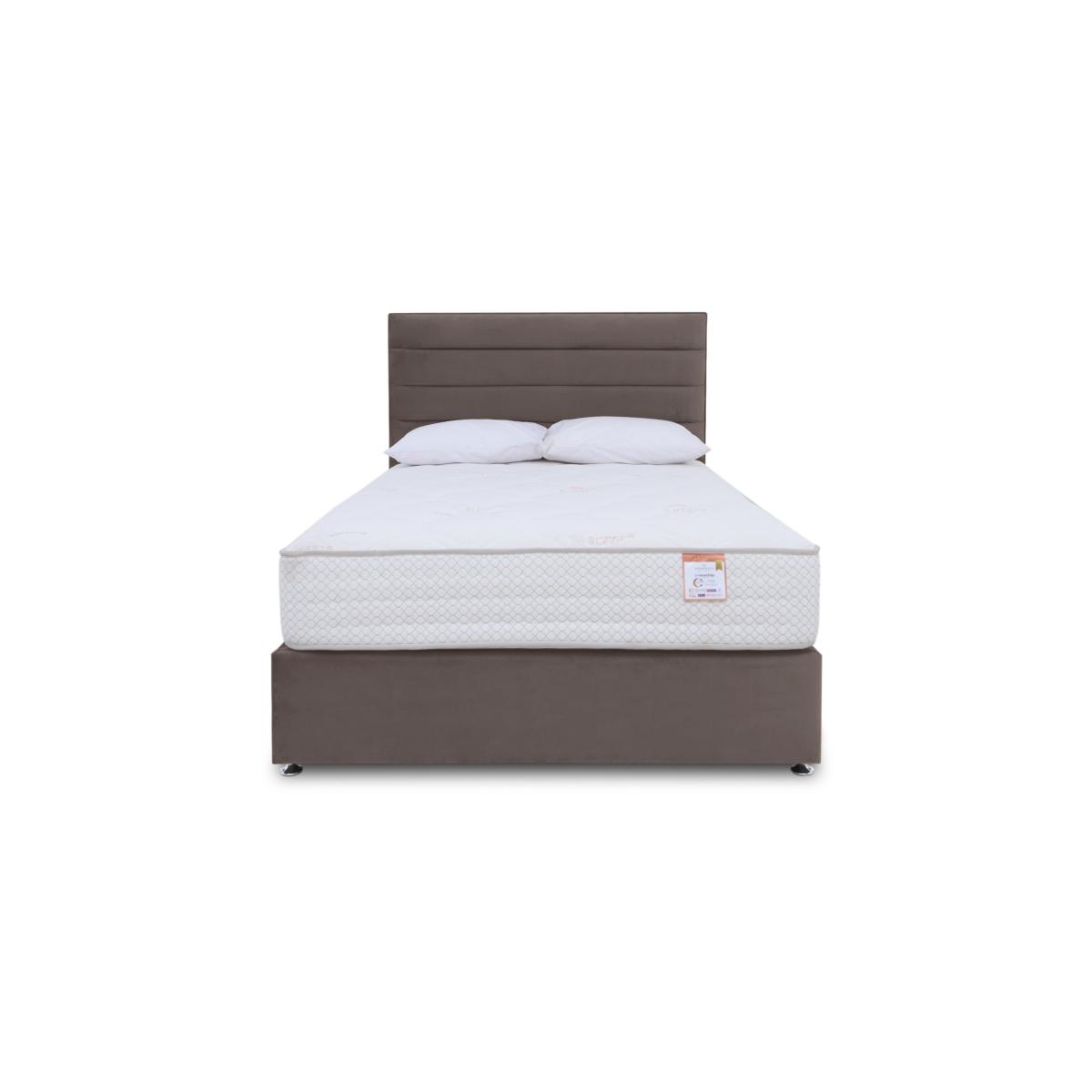 Enjoy advanced mattress comfort with innovative Copper Sleep technology for sleep like never before. As well as AdvantEdge® pocket spring systems which provides total body support across the entire sleep surface, the mattresses in our Sleep Story Copper 2000 range have copper-infused memory foam for cooler and fresher sleep, optimised support and spinal alignment, and even reduced joint swelling and inflammation. The collection also offers a wide choice of beautifully upholstered divan sets with optional drawer or ottoman storage including an electric-powered ottoman divan set. Handcrafted by Highgrove, the great-value Sleep Story Copper 2000 bed and mattress collection is only available at Furniture Village. This innovative divan set includes a copper-infused memory foam mattress with 2000 pocket springs in king size and a beautifully upholstered divan base with optional storage drawers. Why you'll love it The mattress in this divan set features Copper Sleep technology. Sleep innovation at a great-value price. The AdvantEdge® pocket spring system has 2000 springs in king size. Promises total body support across the entire sleep surface and prevents roll together. Unique copper-infused memory foam is activated by body weight and movement. Optimises hip and shoulder support and improves spinal alignment. Helps draw heat away from the body for cooler and more comfortable sleep. Designed to help relieve sore and swollen joints and reduce inflammation. Copper is also anti-bacterial and anti-microbial for cleaner and healthier sleep. Luxuriously soft stretch-fabric cover even has copper woven in. Hypoallergenic. Divan set includes a platform-top base with optional storage drawers. Available in a wide selection of stylish upholstery fabrics. Made in the UK by Highgrove and exclusive to Furniture Village. This divan set is part of Sleep Story Copper 2000 range. Shop the Sleep Sleep Story Copper 2000 range for mattresses, divan sets, electric ottoman beds and more. What you need to know Headboard is an optional extra. Mattress type: Pocket spring. Depth: 30 cm. Weight:Small single 22.5 kg, single 27 kg, small double 36 kg, double 40.5 kg, king 45 kg and super king 54.6 kg. Firmness: Medium. Springs: 2000 pocket springs in king size. Pillow top: No. Fillings: Memory foam. Cover: Stretch cover woven with copper. Requires turning: No. Base type: Platform top with optional storage drawers. Sizes: Small single, single, small double, double, king and super king. Mattress care:Air for 4 hours before using to remove any odour. Indentations caused by settlement of fillings or body weight are normal and are not considered defects. If used on a slatted bed frame, the space between slats must be no wider than 7.5 cm. Spaces wider than this may cause excess dipping of the mattress and invalidate the guarantee. Always use a mattress protector. Rotate regularly. Divan base care: Clean upholstery weekly using a soft brush or vacuum with the curtain attachment. Professional cleaning advised for oil- and grease-based stains. Ordering a small double, double, king or super king size? Your divan base will be supplied in two halves for easier access.