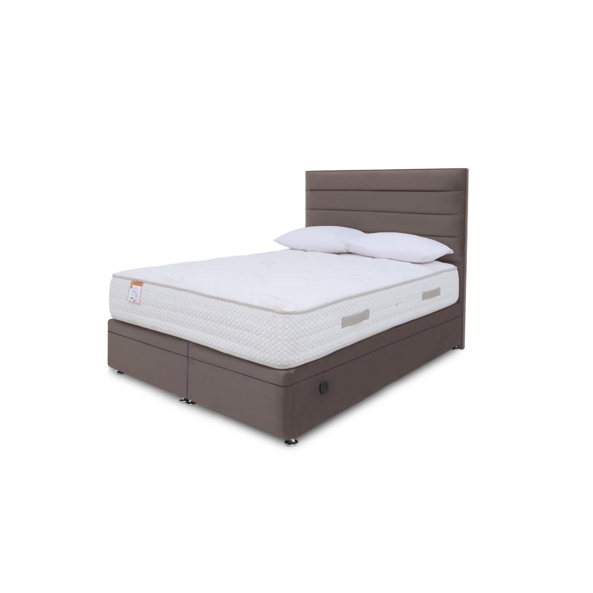 Enjoy advanced mattress comfort with innovative Copper Sleep technology for sleep like never before. As well as AdvantEdge® pocket spring systems which provides total body support across the entire sleep surface, the mattresses in our Sleep Story Copper 2000 range have copper-infused memory foam for cooler and fresher sleep, optimised support and spinal alignment, and even reduced joint swelling and inflammation. The collection also offers a wide choice of beautifully upholstered divan sets with optional drawer or ottoman storage including an electric-powered ottoman divan set. Handcrafted by Highgrove, the great-value Sleep Story Copper 2000 bed and mattress collection is only available at Furniture Village. This electric-powered ottoman divan set makes extra storage extra easy. The innovative copper-infused pocket spring and memory foam mattress offers healthier sleep. Why you'll love it The mattress in this electric ottoman divan set features Copper Sleep technology. Sleep innovation at a great-value price. The AdvantEdge® pocket spring system has 2000 springs in king size. Promises total body support across the entire sleep surface and prevents roll together. Optimises hip and shoulder support and improves spinal alignment. Helps draw heat away from the body for cooler and more comfortable sleep Designed to help relieve sore and swollen joints and reduce inflammation. Copper is also anti-bacterial and anti-microbial for cleaner and healthier sleep. Luxuriously soft stretch-fabric cover even has copper woven in. Hypoallergenic. Divan set includes a platform-top base with spacious end-opening ottoman storage. It’s electric powered for effortless access to the storage compartment. Available in a wide selection of stylish upholstery fabrics. Made in the UK by Highgrove and exclusive to Furniture Village. This electric ottoman divan set is part of the Sleep Story Copper 2000 range. Shop the Sleep Story Copper 2000 range for mattresses, divan sets, electric ottoman beds and more. What you need to know Headboard is an optional extra. Mattress type: Pocket spring. Depth: 30 cm. Weight:Small single 22.5 kg, single 27 kg, small double 36 kg, double 40.5 kg, king 45 kg and super king 54.6 kg. Firmness: Medium. Springs: 2000 pocket springs in king size. Pillow top: No. Fillings: Memory foam. Cover: Stretch cover woven with copper. Requires turning: No. Base type: Platform top with electric-powered end-opening ottoman storage. Sizes: Small single, single, small double, double, king and super king. Mattress care:Air for 4 hours before using to remove any odour. Indentations caused by settlement of fillings or body weight are normal and are not considered defects. If used on a slatted bed frame, the space between slats must be no wider than 7.5 cm. Spaces wider than this may cause excess dipping of the mattress and invalidate the guarantee. Always use a mattress protector. Rotate regularly. Divan base care: Clean upholstery weekly using a soft brush or vacuum with the curtain attachment. Professional cleaning advised for oil- and grease-based stains. Be careful care when opening and closing the ottoman base. The ottoman base is powered by mains electricity. Please ensure that you will be able to connect it to a power source before ordering. Ordering a small double, double, king or super king size? Your divan base will be supplied in two halves for easier access.