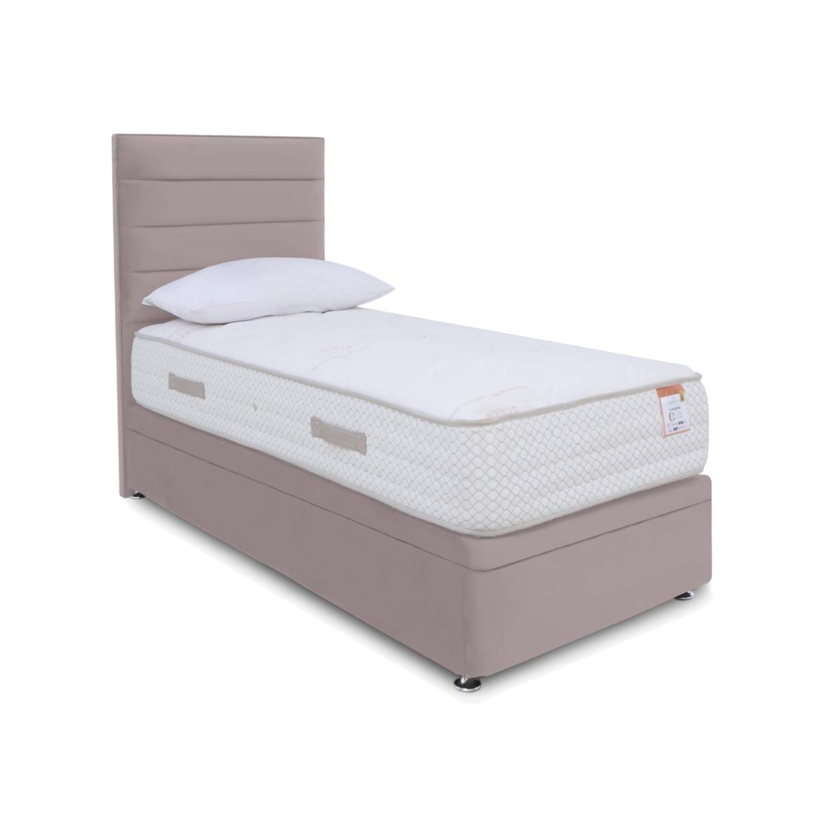Enjoy advanced mattress comfort with innovative Copper Sleep technology for sleep like never before. As well as AdvantEdge® pocket spring systems which provides total body support across the entire sleep surface, the mattresses in our Sleep Story Copper 2000 range have copper-infused memory foam for cooler and fresher sleep, optimised support and spinal alignment, and even reduced joint swelling and inflammation. The collection also offers a wide choice of beautifully upholstered divan sets with optional drawer or ottoman storage including an electric-powered ottoman divan set. Handcrafted by Highgrove, the great-value Sleep Story Copper 2000 bed and mattress collection is only available at Furniture Village. This electric-powered ottoman divan set makes extra storage extra easy. The innovative copper-infused pocket spring and memory foam mattress offers healthier sleep. Why you'll love it The mattress in this electric ottoman divan set features Copper Sleep technology. Sleep innovation at a great-value price. The AdvantEdge® pocket spring system has 2000 springs in king size. Promises total body support across the entire sleep surface and prevents roll together. Optimises hip and shoulder support and improves spinal alignment. Helps draw heat away from the body for cooler and more comfortable sleep Designed to help relieve sore and swollen joints and reduce inflammation. Copper is also anti-bacterial and anti-microbial for cleaner and healthier sleep. Luxuriously soft stretch-fabric cover even has copper woven in. Hypoallergenic. Divan set includes a platform-top base with spacious end-opening ottoman storage. It’s electric powered for effortless access to the storage compartment. Available in a wide selection of stylish upholstery fabrics. Made in the UK by Highgrove and exclusive to Furniture Village. This electric ottoman divan set is part of the Sleep Story Copper 2000 range. Shop the Sleep Story Copper 2000 range for mattresses, divan sets, electric ottoman beds and more. What you need to know Headboard is an optional extra. Mattress type: Pocket spring. Depth: 30 cm. Weight:Small single 22.5 kg, single 27 kg, small double 36 kg, double 40.5 kg, king 45 kg and super king 54.6 kg. Firmness: Medium. Springs: 2000 pocket springs in king size. Pillow top: No. Fillings: Memory foam. Cover: Stretch cover woven with copper. Requires turning: No. Base type: Platform top with electric-powered end-opening ottoman storage. Sizes: Small single, single, small double, double, king and super king. Mattress care:Air for 4 hours before using to remove any odour. Indentations caused by settlement of fillings or body weight are normal and are not considered defects. If used on a slatted bed frame, the space between slats must be no wider than 7.5 cm. Spaces wider than this may cause excess dipping of the mattress and invalidate the guarantee. Always use a mattress protector. Rotate regularly. Divan base care: Clean upholstery weekly using a soft brush or vacuum with the curtain attachment. Professional cleaning advised for oil- and grease-based stains. Be careful care when opening and closing the ottoman base. The ottoman base is powered by mains electricity. Please ensure that you will be able to connect it to a power source before ordering. Ordering a small double, double, king or super king size? Your divan base will be supplied in two halves for easier access.