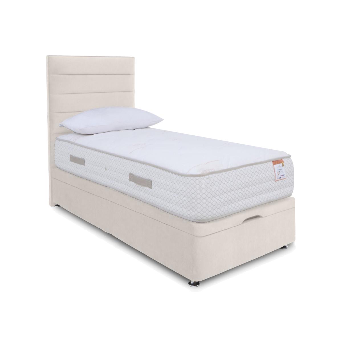 Enjoy advanced mattress comfort with innovative Copper Sleep technology for sleep like never before. As well as AdvantEdge® pocket spring systems which provides total body support across the entire sleep surface, the mattresses in our Sleep Story Copper 2000 range have copper-infused memory foam for cooler and fresher sleep, optimised support and spinal alignment, and even reduced joint swelling and inflammation. The collection also offers a wide choice of beautifully upholstered divan sets with optional drawer or ottoman storage including an electric-powered ottoman divan set. Handcrafted by Highgrove, the great-value Sleep Story Copper 2000 bed and mattress collection is only available at Furniture Village. This fabulous and very well-priced ottoman divan set includes an innovative copper-infused pocket spring mattress as well as a sizeable underbed storage space. Exclusive. Why you'll love it The mattress in this ottoman divan set features Copper Sleep technology. Sleep innovation at a great-value price. The AdvantEdge® pocket spring system has 2000 springs in king size. Promises total body support across the entire sleep surface and prevents roll together. Unique copper-infused memory foam is activated by body weight and movement. Optimises hip and shoulder support and improves spinal alignment. Helps draw heat away from the body for cooler and more comfortable sleep. Designed to help relieve sore and swollen joints and reduce inflammation. Copper is also anti-bacterial and anti-microbial for cleaner and healthier sleep. Luxuriously soft stretch-fabric cover even has copper woven in. Hypoallergenic. Divan set includes a platform-top base with end-opening ottoman storage. Available in a wide selection of stylish upholstery fabrics. Make life even easier – choose the electric-powered version of this ottoman divan set. Made in the UK by Highgrove and exclusive to Furniture Village. This ottoman divan set is part of the Sleep Story Copper 2000 range. Shop the Sleep Story Copper 2000 range for mattresses, divan sets, electric ottoman beds and more. What you need to know Headboard is an optional extra. Mattress type: Pocket spring. Depth: 30 cm. Weight:Small single 22.5 kg, single 27 kg, small double 36 kg, double 40.5 kg, king 45 kg and super king 54.6 kg. Firmness: Medium. Springs: 2000 pocket springs in king size. Pillow top: No. Fillings: Memory foam. Cover: Stretch cover woven with copper. Requires turning: No. Base type: Platform top with end-opening ottoman storage. Sizes: Small single, single, small double, double, king and super king. Mattress care:Air for 4 hours before using to remove any odour. Indentations caused by settlement of fillings or body weight are normal and are not considered defects. If used on a slatted bed frame, the space between slats must be no wider than 7.5 cm. Spaces wider than this may cause excess dipping of the mattress and invalidate the guarantee. Always use a mattress protector. Rotate regularly. Divan base care: Clean upholstery weekly using a soft brush or vacuum with the curtain attachment. Professional cleaning advised for oil- and grease-based stains. Be careful care when opening and closing the ottoman base. Ordering a small double, double, king or super king size? Your divan base will be supplied in two halves for easier access.