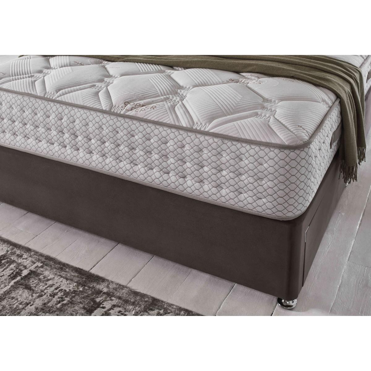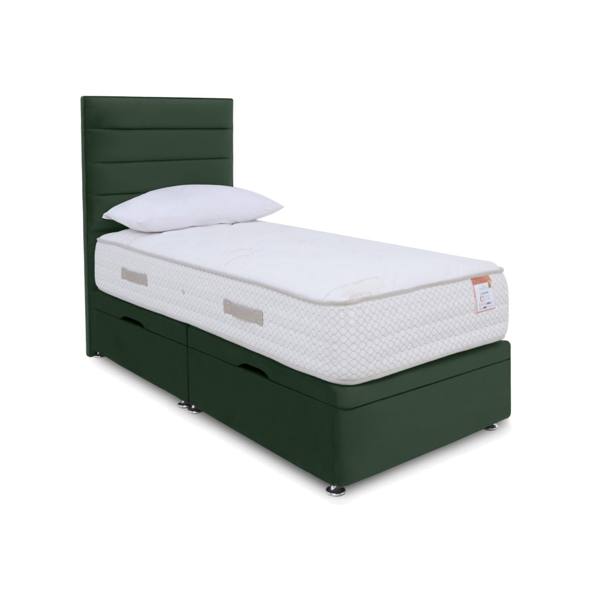 Enjoy advanced mattress comfort with innovative Copper Sleep technology for sleep like never before. As well as AdvantEdge® pocket spring systems which provides total body support across the entire sleep surface, the mattresses in our Sleep Story Copper 2000 range have copper-infused memory foam for cooler and fresher sleep, optimised support and spinal alignment, and even reduced joint swelling and inflammation. The collection also offers a wide choice of beautifully upholstered divan sets with optional drawer or ottoman storage including an electric-powered ottoman divan set. Handcrafted by Highgrove, the great-value Sleep Story Copper 2000 bed and mattress collection is only available at Furniture Village. Designed for smaller bedrooms, this ergonomic side-opening ottoman divan set features a truly innovative copper-infused mattress for healthier sleep. Why you'll love it The mattress in this ottoman divan set features Copper Sleep technology. Sleep innovation at a great-value price. The AdvantEdge® pocket spring system has 2000 springs in king size. Promises total body support across the entire sleep surface and prevents roll together. Optimises hip and shoulder support and improves spinal alignment. Helps draw heat away from the body for cooler and more comfortable sleep. Designed to help relieve sore and swollen joints and reduce inflammation. Copper is also anti-bacterial and anti-microbial for cleaner and healthier sleep. Luxuriously soft stretch-fabric cover even has copper woven in. Hypoallergenic. Divan set includes a platform-top base with space-saving side-opening ottoman storage. Available in a wide selection of stylish upholstery fabrics. Made in the UK by Highgrove and exclusive to Furniture Village. This ottoman divan set is part of the Sleep Story Copper 2000 range. Shop the Sleep Story Copper 2000 range for mattresses, divan sets, electric ottoman beds and more. What you need to know Headboard is an optional extra. Mattress type: Pocket spring. Depth: 30 cm. Weight:Small single 22.5 kg, single 27 kg, small double 36 kg, double 40.5 kg, king 45 kg and super king 54.6 kg. Firmness: Medium. Springs: 2000 pocket springs in king size. Pillow top: No. Fillings: Memory foam. Cover: Stretch cover woven with copper. Requires turning: No. Base type: Platform top with side-opening ottoman storage. Sizes: Small single, single, small double, double, king and super king. Mattress care:Air for 4 hours before using to remove any odour. Indentations caused by settlement of fillings or body weight are normal and are not considered defects. If used on a slatted bed frame, the space between slats must be no wider than 7.5 cm. Spaces wider than this may cause excess dipping of the mattress and invalidate the guarantee. Always use a mattress protector. Rotate regularly. Divan base care: Clean upholstery weekly using a soft brush or vacuum with the curtain attachment. Professional cleaning advised for oil- and grease-based stains. Be careful care when opening and closing the ottoman base. Ordering a small double, double, king or super king size? Your divan base will be supplied in two halves for easier access.