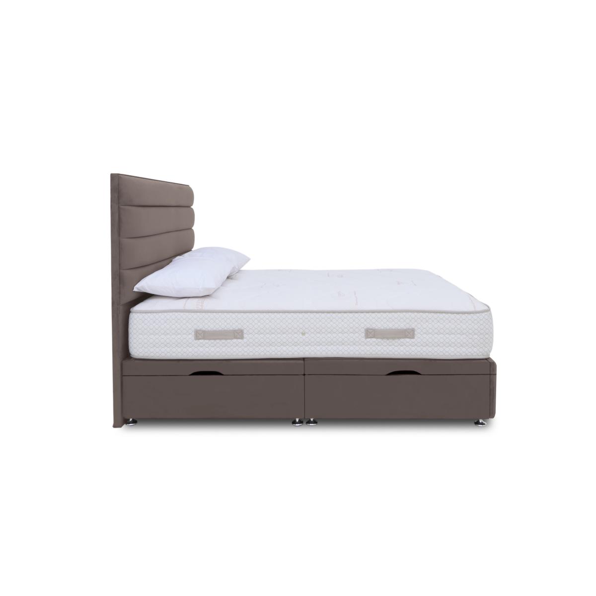 Enjoy advanced mattress comfort with innovative Copper Sleep technology for sleep like never before. As well as AdvantEdge® pocket spring systems which provides total body support across the entire sleep surface, the mattresses in our Sleep Story Copper 2000 range have copper-infused memory foam for cooler and fresher sleep, optimised support and spinal alignment, and even reduced joint swelling and inflammation. The collection also offers a wide choice of beautifully upholstered divan sets with optional drawer or ottoman storage including an electric-powered ottoman divan set. Handcrafted by Highgrove, the great-value Sleep Story Copper 2000 bed and mattress collection is only available at Furniture Village. Designed for smaller bedrooms, this ergonomic side-opening ottoman divan set features a truly innovative copper-infused mattress for healthier sleep. Why you'll love it The mattress in this ottoman divan set features Copper Sleep technology. Sleep innovation at a great-value price. The AdvantEdge® pocket spring system has 2000 springs in king size. Promises total body support across the entire sleep surface and prevents roll together. Optimises hip and shoulder support and improves spinal alignment. Helps draw heat away from the body for cooler and more comfortable sleep. Designed to help relieve sore and swollen joints and reduce inflammation. Copper is also anti-bacterial and anti-microbial for cleaner and healthier sleep. Luxuriously soft stretch-fabric cover even has copper woven in. Hypoallergenic. Divan set includes a platform-top base with space-saving side-opening ottoman storage. Available in a wide selection of stylish upholstery fabrics. Made in the UK by Highgrove and exclusive to Furniture Village. This ottoman divan set is part of the Sleep Story Copper 2000 range. Shop the Sleep Story Copper 2000 range for mattresses, divan sets, electric ottoman beds and more. What you need to know Headboard is an optional extra. Mattress type: Pocket spring. Depth: 30 cm. Weight:Small single 22.5 kg, single 27 kg, small double 36 kg, double 40.5 kg, king 45 kg and super king 54.6 kg. Firmness: Medium. Springs: 2000 pocket springs in king size. Pillow top: No. Fillings: Memory foam. Cover: Stretch cover woven with copper. Requires turning: No. Base type: Platform top with side-opening ottoman storage. Sizes: Small single, single, small double, double, king and super king. Mattress care:Air for 4 hours before using to remove any odour. Indentations caused by settlement of fillings or body weight are normal and are not considered defects. If used on a slatted bed frame, the space between slats must be no wider than 7.5 cm. Spaces wider than this may cause excess dipping of the mattress and invalidate the guarantee. Always use a mattress protector. Rotate regularly. Divan base care: Clean upholstery weekly using a soft brush or vacuum with the curtain attachment. Professional cleaning advised for oil- and grease-based stains. Be careful care when opening and closing the ottoman base. Ordering a small double, double, king or super king size? Your divan base will be supplied in two halves for easier access.