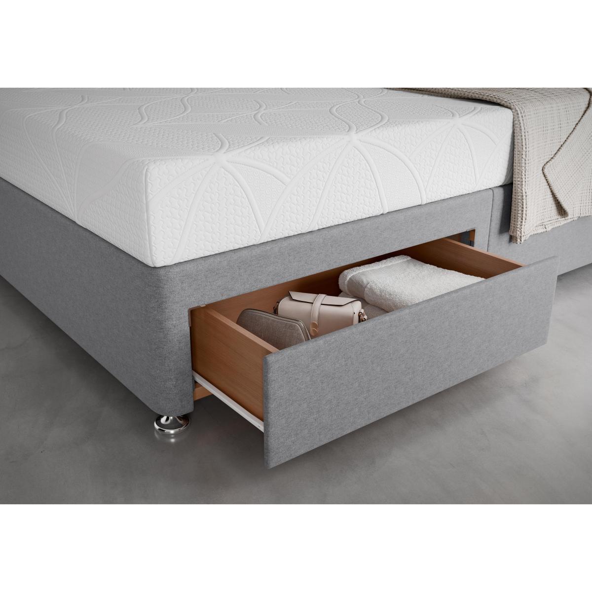 The Sleep Story Cool Gel 2000 divan set combines an innovative, cooling memory foam and gel mattress with a very stylish divan base with a choice of drawer storage. Headboard shown available separately. Why you'll love it. Sublimely comfortable, supportive and cooling. Pressure relieving, responsive memory foam. Firmer feel, great support for your back. A 3.8cm layer of cooling gel draws heat away from your body. So you sleep on a fresh, cooling surface. A ventilated border promotes airflow. Easy care, non-turn mattress. You only need to rotate it occasionally. Contemporary divan base in a wide choice of colours. With no drawers or drawer storage in a choice of configurations. A Furniture Village exclusive. What you need to know. Mattress type: Gel memory foam. Depth: 20cm. Firmness: Firm feel. Springs: No. Pillow top: No. Mattress delivered rolled to reduce delivery footprint. Fillings: Memory foam topped with 3.8cm gel. Borders: Ventilated.li>. Edge to edge support: Yes. Cover: Knitted. Requires turning: No. Sizes: Single, double, king, super king. Drawer configurations available: 2 drawer, 4 drawer, 2+2 drawer. Double, king and super king divan bases are delivered in two pieces for ease of delivery. Mattress care: Please allow mattress to fully recover before use. It may have a faint odour which will dissipate after airing for 4 hours. Due to the pressure relieving properties of the material it may take some time before you become accustomed to the level of comfort and support. Rotate regularly. We recommend the use of a mattress protector.