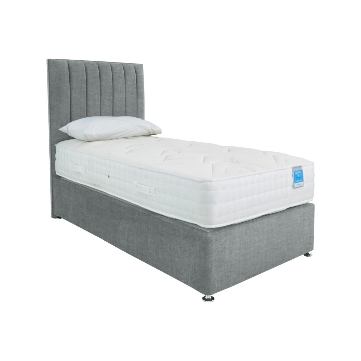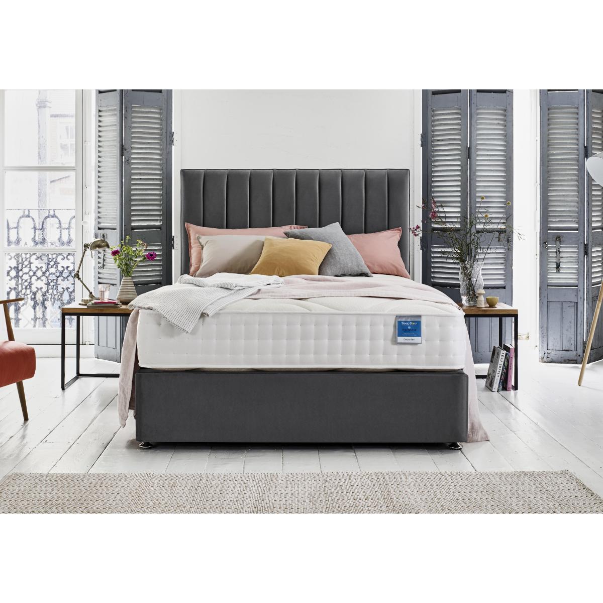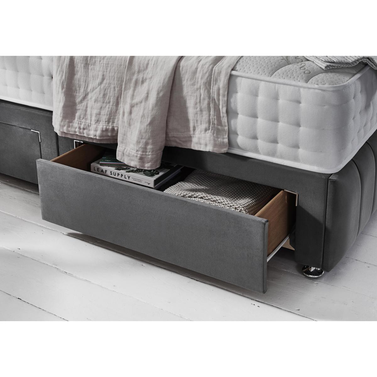 Extra firm pocket spring mattress plus extra stylish divan base. Made by Highgrove for Furniture Village, this Sleep Story divan set is yours at a great-value price. Short on storage space? Opt for built-in drawers. Why you'll love it. High-quality extra-firm mattress and divan base at an amazing price. Mattress offers extra support for a better night’s sleep. With 1000 supportive pocket springs in king size. Ultra-soft cashmere blend mattress cover. Hypoallergenic. Platform-top base comes with your choice of storage drawer arrangement. Choose from a wide selection of upholstery fabrics. Made in the UK by Highgrove and exclusive to Furniture Village. The Sleep Story Deluxe Firm range includes a mattress and ottoman divan sets. What you need to know. Headboard is an optional extra. Mattress type: Pocket spring and reflex foam. Depth: 25.5 cm. Firmness: Extra firm. Springs: 1000 pocket springs in king size. Pillow top: No. Fillings: 5 cm reflex foam. Cover: Cashmere blend. Requires turning: Yes. Base type: Platform top with optional drawer storage. Sizes: Small single, single, small double, double, king and super king. Mattress care: Air for 4 hours before using to remove any odour. Allow at least 4 hours for springs to settle and for mattress to attain its full size. Indentations caused by settlement of fillings or body weight are normal and are not considered defects. If used on a slatted bed frame, the space between slats must be no wider than 7.5 cm. Spaces wider than this may cause excess dipping of the mattress and invalidate the guarantee. Always use a mattress protector. Rotate regularly. Divan base care: Clean upholstery weekly using a soft brush or vacuum with the curtain attachment. Professional cleaning advised for oil- and grease-based stains. Please note: Divan base is supplied in two halves for small double, double, king and super king sizes.