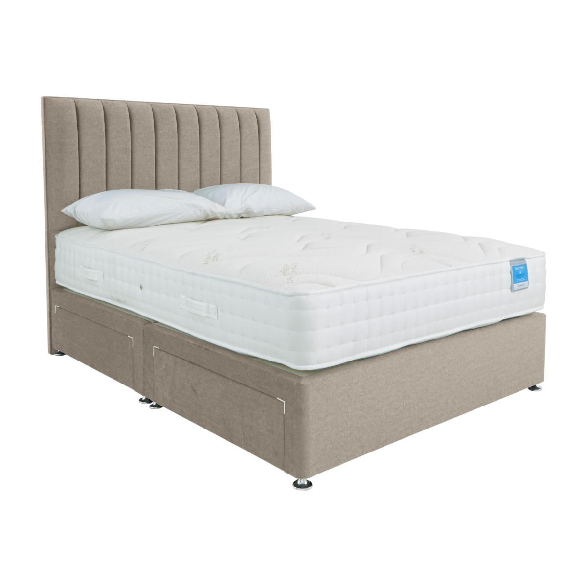 Extra firm pocket spring mattress plus extra stylish divan base. Made by Highgrove for Furniture Village, this Sleep Story divan set is yours at a great-value price. Short on storage space? Opt for built-in drawers. Why you'll love it High-quality extra-firm mattress and divan base at an amazing price. Mattress offers extra support for a better night’s sleep. With 1000 supportive pocket springs in king size. Ultra-soft cashmere blend mattress cover. Hypoallergenic. Platform-top base comes with your choice of storage drawer arrangement. Choose from a wide selection of upholstery fabrics. Made in the UK by Highgrove and exclusive to Furniture Village. The Sleep Story Deluxe Firm range includes a mattress and ottoman divan sets. What you need to know Headboard is an optional extra. Mattress type: Pocket spring and reflex foam. Depth: 25.5 cm. Firmness: Extra firm. Springs: 1000 pocket springs in king size. Pillow top: No. Fillings: 5 cm reflex foam. Cover:Cashmere blend. Requires turning: Yes. Base type: Platform top with optional drawer storage. Sizes: Small single, single, small double, double, king and super king. Mattress care:Air for 4 hours before using to remove any odour. Allow at least 4 hours for springs to settle and for mattress to attain its full size. Indentations caused by settlement of fillings or body weight are normal and are not considered defects. If used on a slatted bed frame, the space between slats must be no wider than 7.5 cm. Spaces wider than this may cause excess dipping of the mattress and invalidate the guarantee. Always use a mattress protector. Rotate regularly. Divan base care: Clean upholstery weekly using a soft brush or vacuum with the curtain attachment. Professional cleaning advised for oil- and grease-based stains. Please note: Divan base is supplied in two halves for small double, double, king and super king sizes.