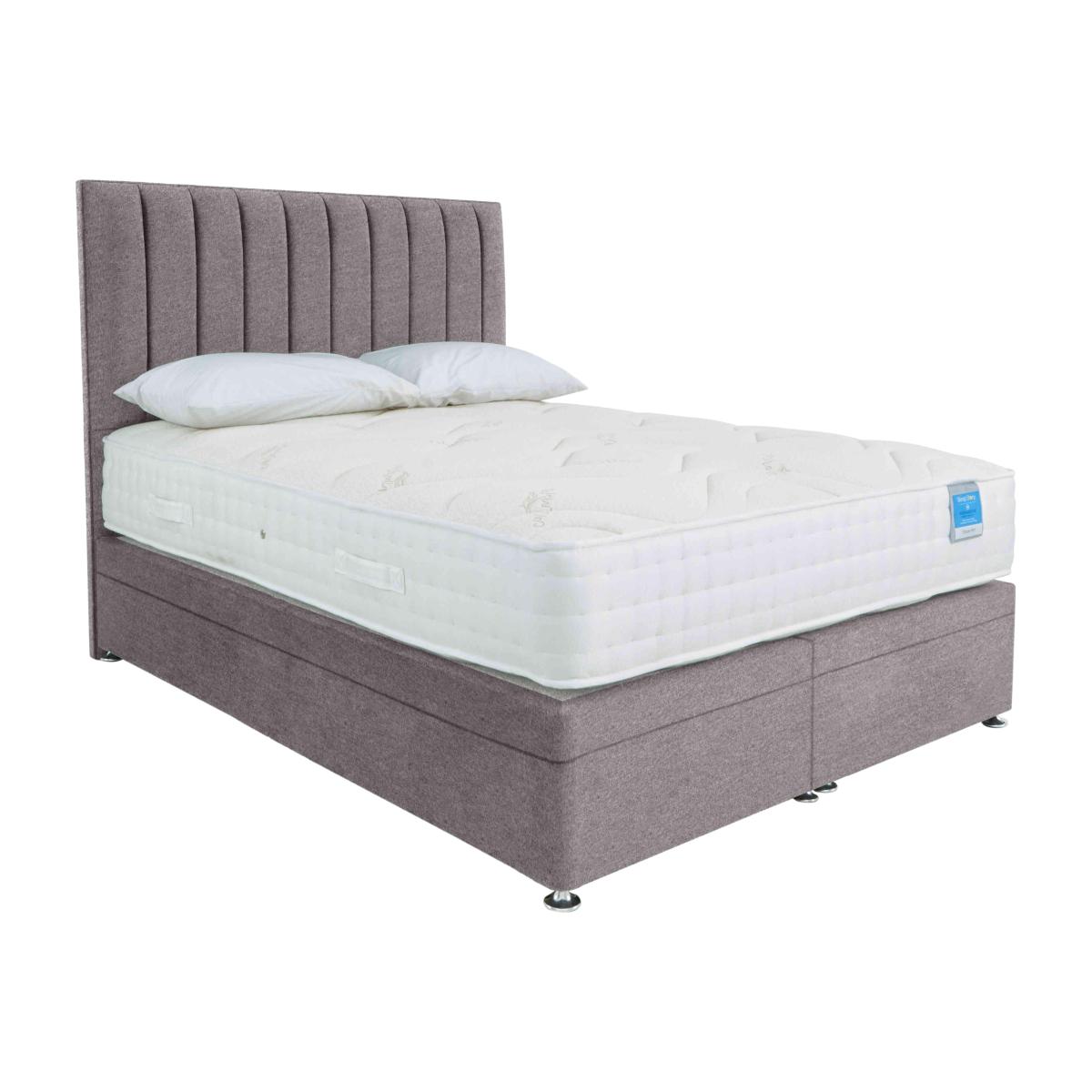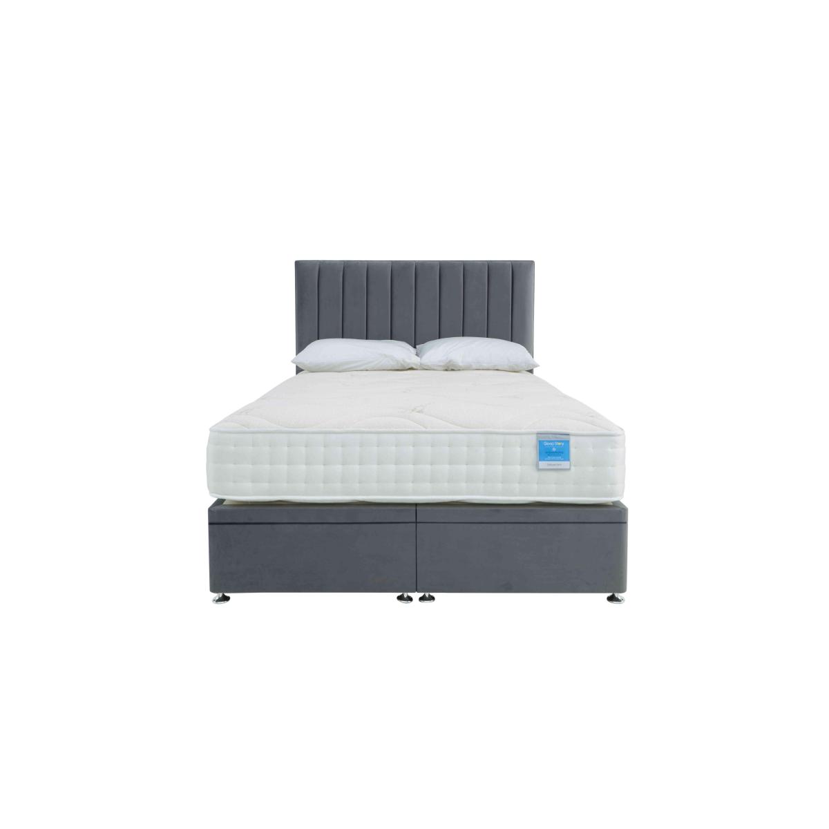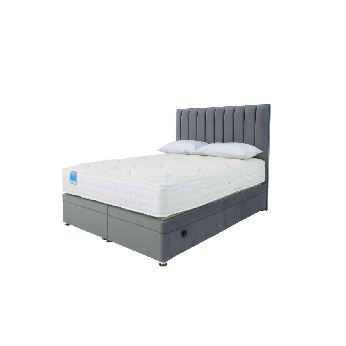 This Sleep Story power ottoman divan set has it all – an extra-firm mattress and an extra-easy electric powered ottoman base. By Highgrove for Furniture Village. Why you'll love it Easier bedroom storage meets extra-firm mattress comfort in this power ottoman divan set. Style, comfort and effortless storage at a great-value price. Mattress offers extra support for a better night’s sleep. With 1000 supportive pocket springs in king size. Ultra-soft cashmere blend mattress cover. Hypoallergenic. Power ottoman divan base means roomy storage – with no lifting required. Child lock feature makes the electric mechanism as safe as it is simple. Platform-top style for excellent mattress support. Choose from a wide selection of stylish upholstery fabrics. Made in the UK by Highgrove and exclusive to Furniture Village. Only available online. This power ottoman divan set is part of the Sleep Story Deluxe Firm range. What you need to know Headboard is an optional extra. Mattress type: Pocket spring and reflex foam. Depth: 25.5 cm. Firmness: Extra firm. Springs: 1000 pocket springs in king size. Pillow top: No. Fillings: 5 cm reflex foam. Cover: Cashmere blend. Requires turning: Yes. Base type: Platform top with electric-powered end-opening ottoman storage base. Sizes: Small single, single, small double, double, king and super king. Mattress care:Air for 4 hours before using to remove any odour. Indentations caused by settlement of fillings or body weight are normal and are not considered defects. If used on a slatted bed frame, the space between slats must be no wider than 7.5 cm. Spaces wider than this may cause excess dipping of the mattress and invalidate the guarantee. Always use a mattress protector. Rotate regularly. Divan base care: Clean upholstery weekly using a soft brush or vacuum with the curtain attachment. Professional cleaning advised for oil- and grease-based stains. Be careful care when opening and closing the ottoman base. The ottoman base is powered by mains electricity. Please ensure that you will be able to connect it to a power source before ordering. Ordering a small double, double, king or super king size? Your divan base will be supplied in two halves for easier access.