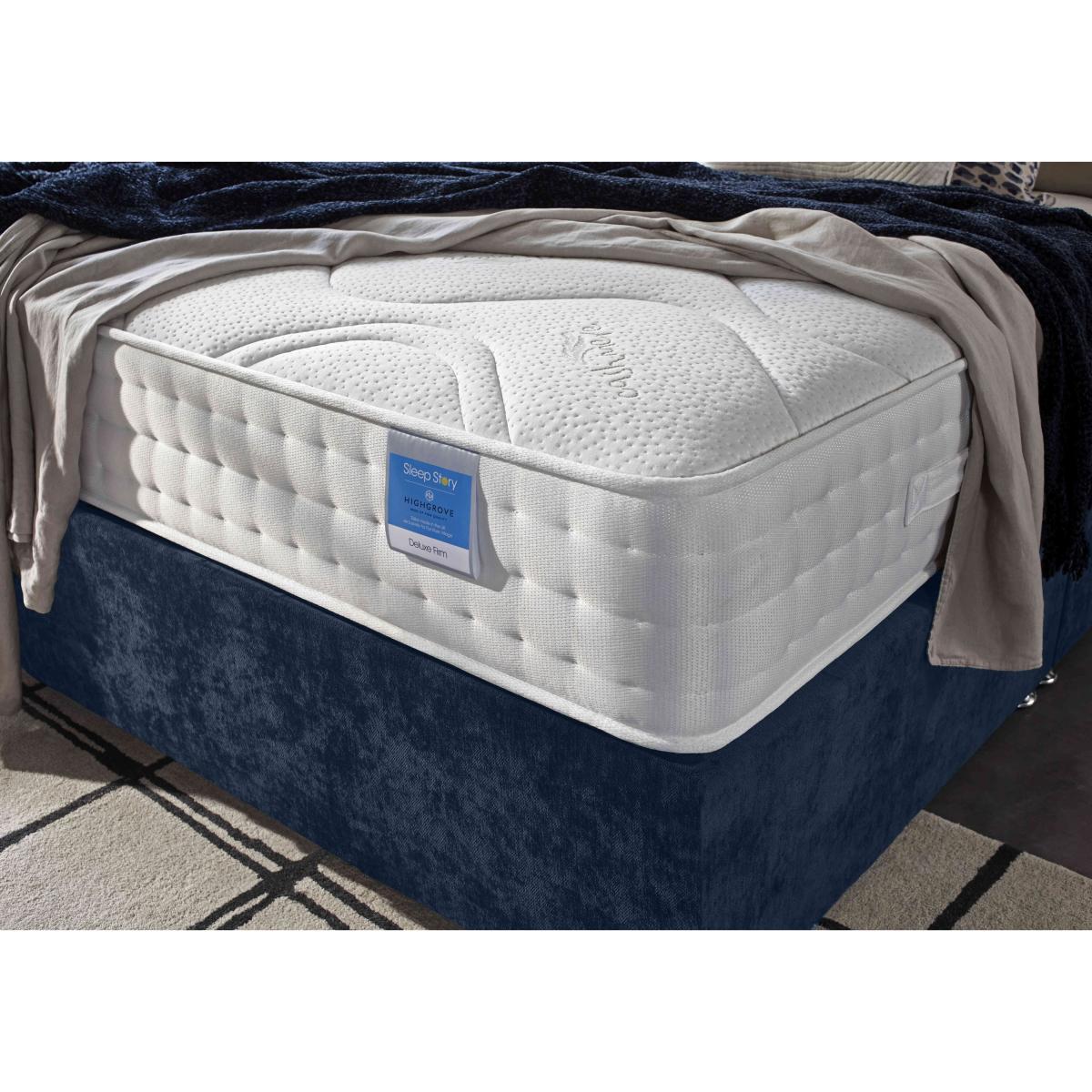If you sleep better on an extra firm mattress, then this is the divan set for you. The stylish base has side-opening ottoman storage, ideal for smaller bedrooms. Made by Highgrove and only at Furniture Village. Why you'll love it High-quality extra-firm mattress and ottoman divan base at an amazing price. Mattress offers extra support for a better night’s sleep. With 1000 supportive pocket springs in king size. Ultra-soft cashmere blend mattress cover. Hypoallergenic. Platform-top base has space-saving side-opening ottoman storage. Choose from a wide selection of upholstery fabrics. Made in the UK by Highgrove and exclusive to Furniture Village. The Sleep Story Deluxe Firm range includes a mattress and ottoman divan sets. What you need to know Headboard is an optional extra. Mattress type: Pocket spring and reflex foam. Depth: 25.5 cm. Firmness: Extra firm. Springs: 1000 pocket springs in king size. Pillow top: No. Fillings: 5 cm reflex foam. Cover:Cashmere blend. Requires turning: Yes. Base type: Platform top with side-opening ottoman storage. Sizes: Small single, single, small double, double, king and super king. Mattress care:Air for 4 hours before using to remove any odour. Allow at least 4 hours for springs to settle and for mattress to attain its full size. Indentations caused by settlement of fillings or body weight are normal and are not considered defects. If used on a slatted bed frame, the space between slats must be no wider than 7.5 cm. Spaces wider than this may cause excess dipping of the mattress and invalidate the guarantee. Always use a mattress protector. Rotate regularly. Divan base care: Clean upholstery weekly using a soft brush or vacuum with the curtain attachment. Professional cleaning advised for oil- and grease-based stains. Please note: Divan base is supplied in two halves for small double, double, king and super king sizes.