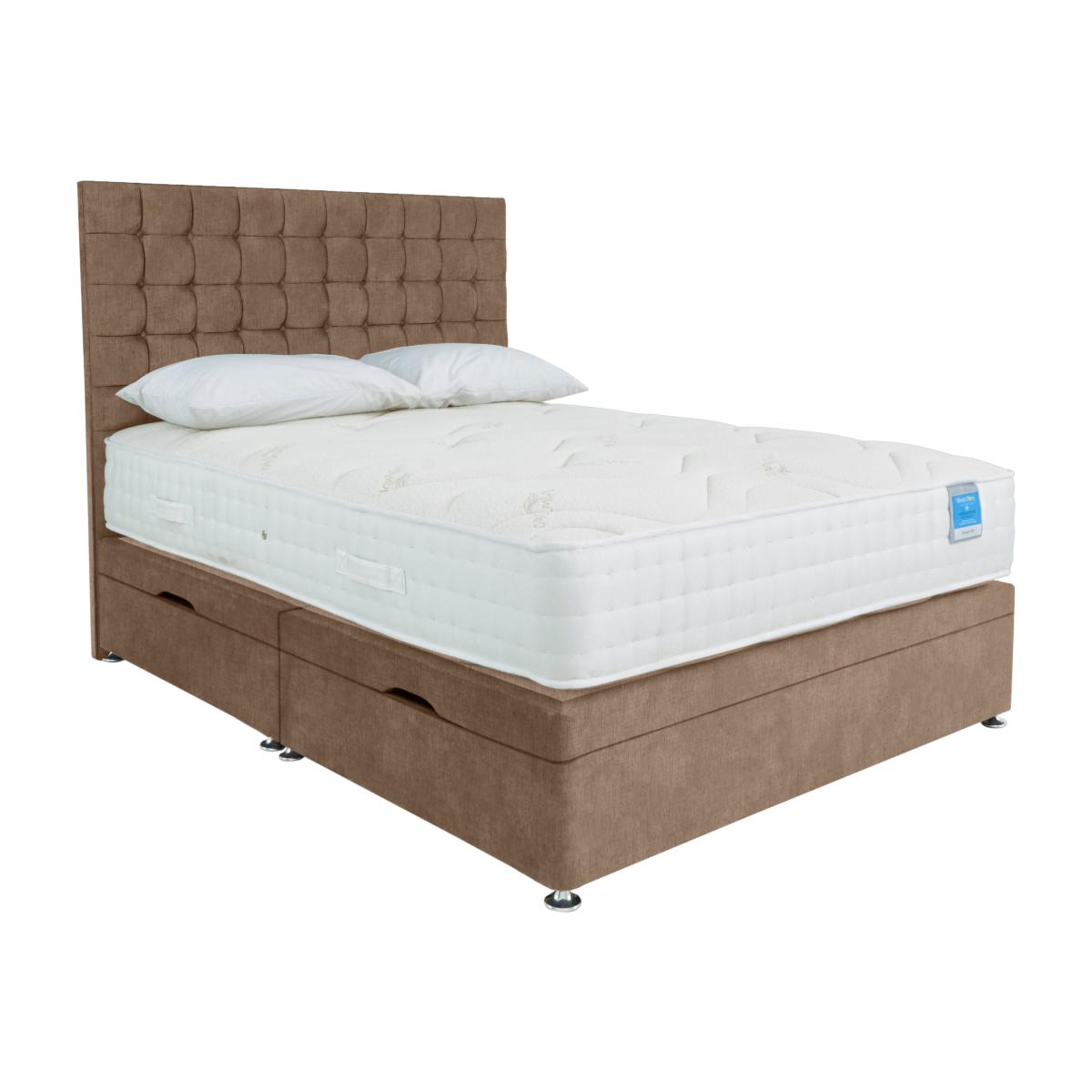 If you sleep better on an extra firm mattress, then this is the divan set for you. The stylish base has side-opening ottoman storage, ideal for smaller bedrooms. Made by Highgrove and only at Furniture Village. Why you'll love it High-quality extra-firm mattress and ottoman divan base at an amazing price. Mattress offers extra support for a better night’s sleep. With 1000 supportive pocket springs in king size. Ultra-soft cashmere blend mattress cover. Hypoallergenic. Platform-top base has space-saving side-opening ottoman storage. Choose from a wide selection of upholstery fabrics. Made in the UK by Highgrove and exclusive to Furniture Village. The Sleep Story Deluxe Firm range includes a mattress and ottoman divan sets. What you need to know Headboard is an optional extra. Mattress type: Pocket spring and reflex foam. Depth: 25.5 cm. Firmness: Extra firm. Springs: 1000 pocket springs in king size. Pillow top: No. Fillings: 5 cm reflex foam. Cover:Cashmere blend. Requires turning: Yes. Base type: Platform top with side-opening ottoman storage. Sizes: Small single, single, small double, double, king and super king. Mattress care:Air for 4 hours before using to remove any odour. Allow at least 4 hours for springs to settle and for mattress to attain its full size. Indentations caused by settlement of fillings or body weight are normal and are not considered defects. If used on a slatted bed frame, the space between slats must be no wider than 7.5 cm. Spaces wider than this may cause excess dipping of the mattress and invalidate the guarantee. Always use a mattress protector. Rotate regularly. Divan base care: Clean upholstery weekly using a soft brush or vacuum with the curtain attachment. Professional cleaning advised for oil- and grease-based stains. Please note: Divan base is supplied in two halves for small double, double, king and super king sizes.