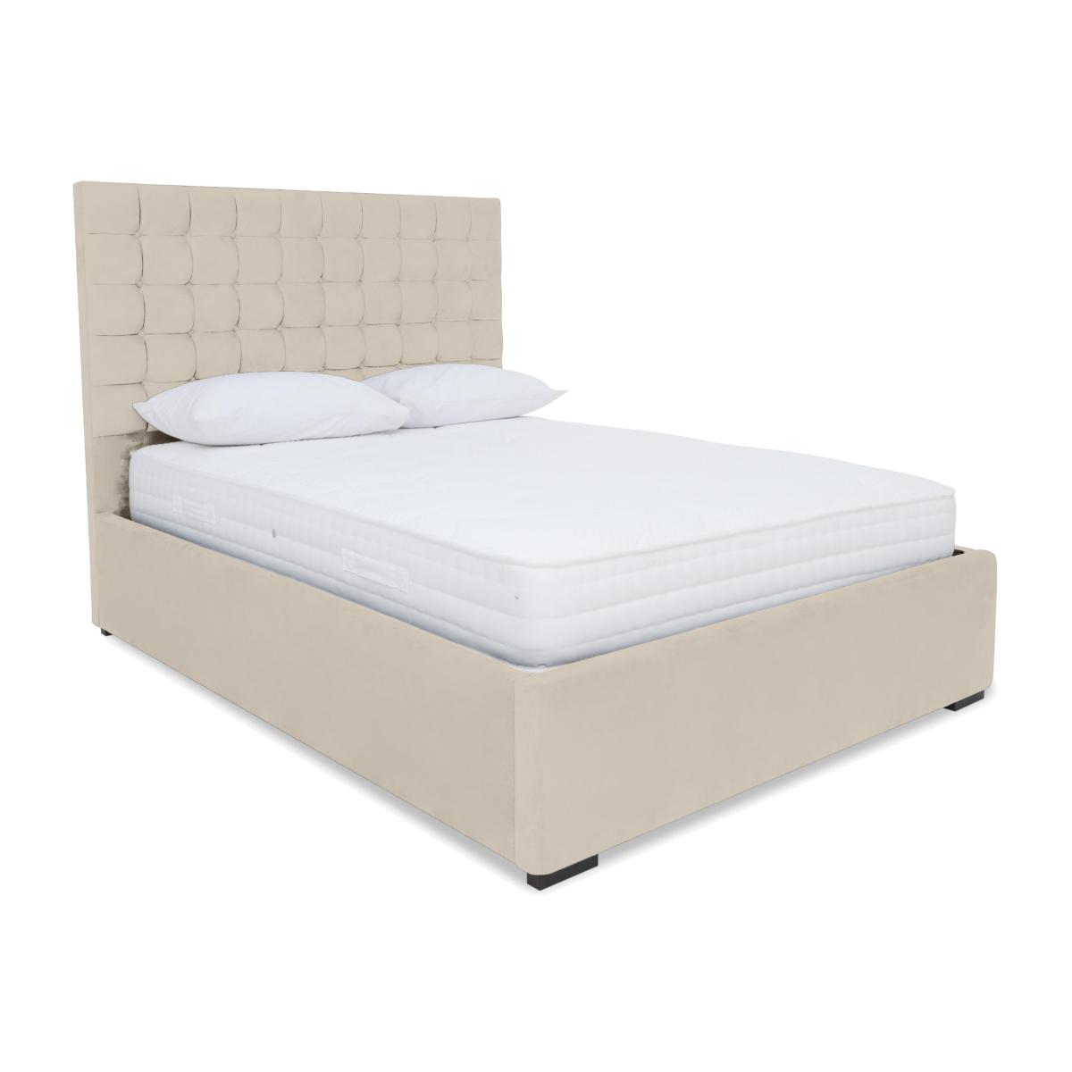 Our great-value Sleep Story Dice collection makes light work of transforming any bedroom into a haven of contemporary luxury. With its signature style motif – modern geometric buttoning – this collection includes electric and manual ottoman storage bed frames, headboards and even a footboard all of which are available in a choice of upholstery fabrics. Looking to update an existing divan bed? A Dice headboard and footboard will instantly elevate its look. And if you need extra storage, a Dice ottoman bed frame makes it easy to stow away bedding and pillows. The Sleep Story Dice collection is handcrafted in the UK by Highgrove and is exclusively available at Furniture Village. Contemporary luxury style meets spacious storage in this fabulous electric ottoman bed frame that’s so easy to open and close. Only at Furniture Village. Why you'll love it Make life easier and your bedroom more stylish with this electric ottoman bed frame. Contemporary luxury plus impressive extra storage at an exceptional price. The ottoman lift mechanism is electric powered so accessing the storage space is effortless. Bold geometric headboard with sumptuous cushioning. High-quality fabric upholstery in a wide choice of lovely colours. Sturdy wooden slatted mattress support. In small double, double, king and super king bed sizes. Handmade in the UK by Highgrove. Exclusively available at Furniture Village. This electric ottoman bed frame is part of our Sleep Story collection. What you need to know Mattress sold separately. Mattress base is composed of 28 wood slats in king size. This ottoman bed frame opens at the end. Maximum mattress weight is 80 kg for all sizes. Please keep hands clear of the mechanism when opening and closing the ottoman. Do not sit on the foot end of this ottoman bed frame when opening. Clean regularly using a soft brush or vacuum with the curtain attachment. Deal with any spills promptly. Professional cleaning advised for oil- and grease-based stains. Some fabrics can show wear on areas of more use or in direct sunlight. Flattening and shading of heavy wear areas on pile fabrics like velvet is unavoidable. Be sure to brush pile fabrics only in the direction of the pile. Please read our upholstery care guide for more advice.