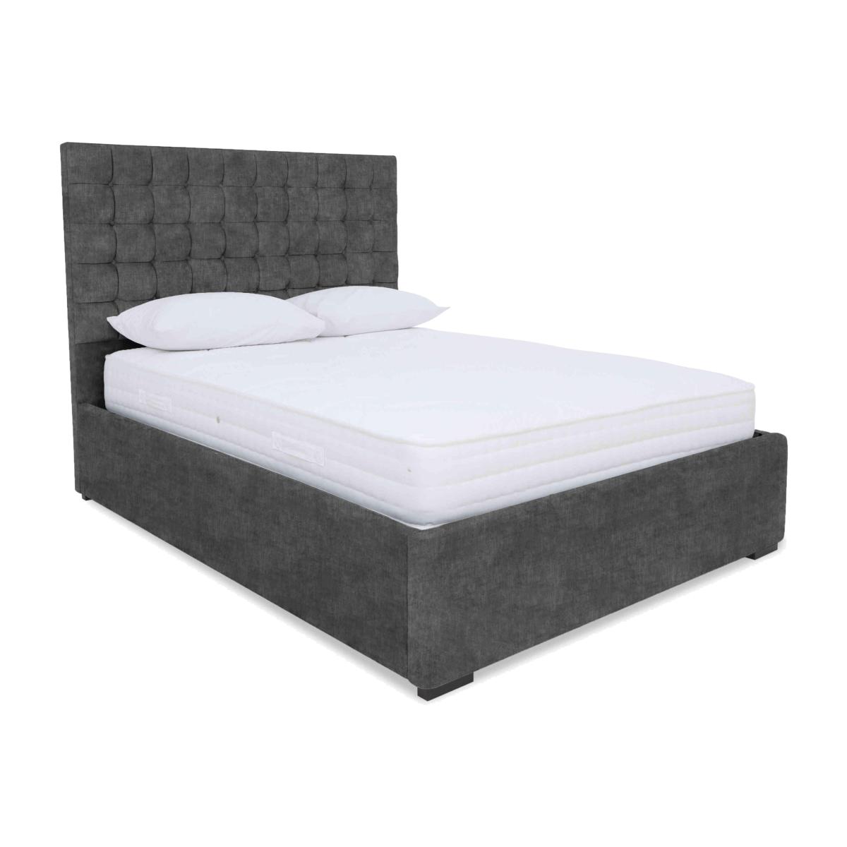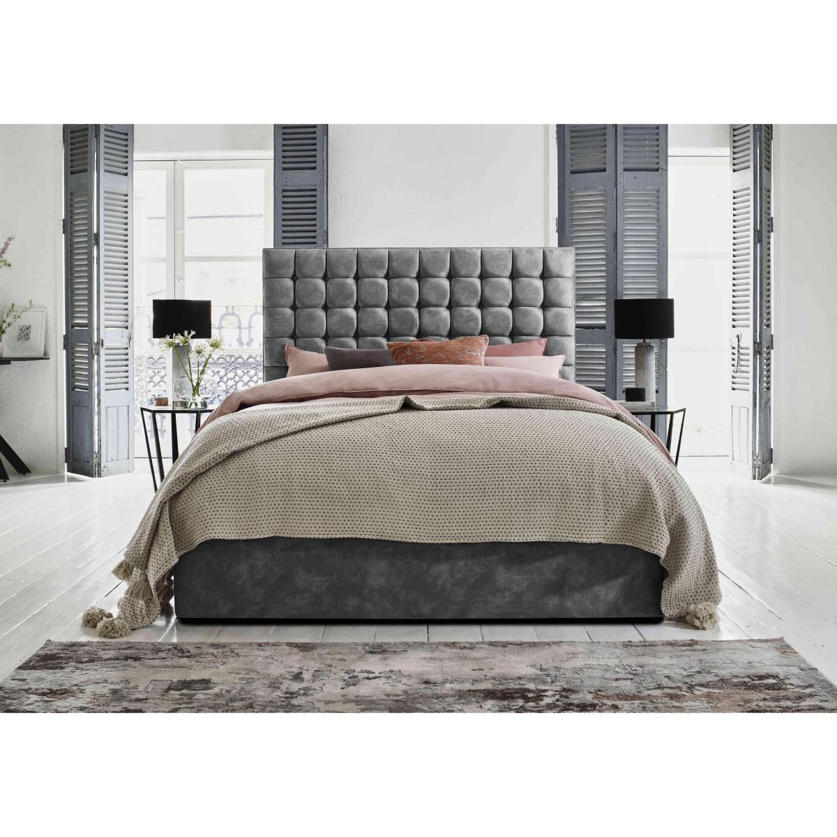 This fabulous ottoman bed frame with its very striking geometric headboard will instantly bring style and storage to your bedroom. A luxury ottoman bed frame at a great-value price. Why you'll love it Update your bedroom look – and storage – with this ottoman bed frame. Luxury style, impressive storage and exceptional value for money. Bold and contemporary geometric headboard. Sumptuously comfortable cushioning. Very spacious ottoman storage base with wooden slatted mattress support. Wood feet. High-quality fabric upholstery in a wide choice of lovely colours. Handmade in the UK by Highgrove. Exclusively available at Furniture Village. This end-opening ottoman bed frame is part of our Sleep Story collection. What you need to know Mattress sold separately. Ottoman opens at the end. In small double, double, king and super king sizes. Please keep hands clear of the mechanism when opening and closing. Clean regularly using a soft brush or vacuum with the curtain attachment. Deal with any spills promptly. Professional cleaning advised for oil- and grease-based stains. Some fabrics can show wear on areas of more use or in direct sunlight. Flattening and shading of heavy wear areas on pile fabrics like velvet is unavoidable. Be sure to brush pile fabrics only in the direction of the pile. Please read our upholstery care guide for more advice.