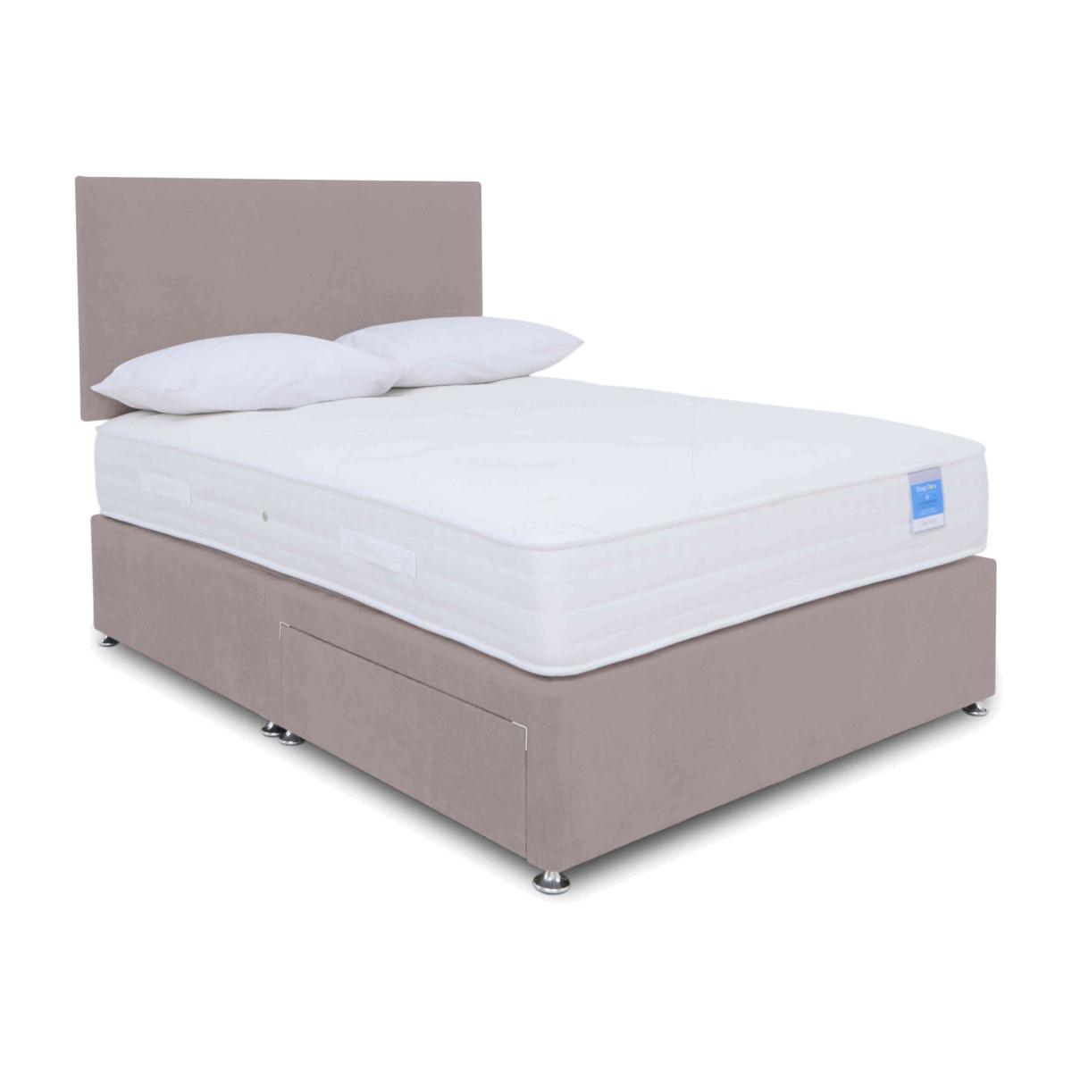 With the beds and mattresses in the Sleep Story Ergosense range, you’ll experience total comfort and support. The medium-feel mattresses in the collection have 1000 individually pocketed springs in king size that ensure correct spinal alignment while you sleep while layers of medical-grade Ergosense foam provide body-responsive comfort. The range also includes a wide choice of divan sets with beautifully upholstered divan bases that come with space-saving drawer and ottoman storage options including an electric-powered ottoman divan base. The great-value Sleep Story Ergosense range is made in Britain by Highgrove exclusively for Furniture Village. Comfort, style and value – it’s all yours with this fabulous budget-friendly divan set from Sleep Story. Along with medium-feel support, the mattress has a responsive Ergosense foam layer. Why you'll love it Divan set includes a luxurious tufted mattress with a high-performance foam layer. Tradition meets technology at a great-value price. The ultra-sensitive Ergosense foam layer reacts immediately to body weight and shape. Relieves pressure and improves blood circulation. Helps to minimise restless sleep for more refreshed days. AdvantEdge® pocket spring system has 1000 springs in king size. It’s designed to offer total body support across the entire sleep surface. Ensures correct spinal alignment for better quality of sleep. DynamicEdge active side support maximises the sleep surface and prevents roll off. Breathable stretch fabric cover. Hypoallergenic. Platform-top base with a choice of optional storage drawers. Available in a wide selection of stylish upholstery fabrics. Made in the UK by Highgrove and exclusive to Furniture Village. This divan set is part of the Sleep Story Ergosense range. Shop the Sleep Story Ergosense range for mattresses, divan sets, electric ottoman beds and more. What you need to know Headboard is an optional extra. Mattress type: Pocket spring. Depth: 25 cm. Weight:Small single 16.5 kg, single 19.8 kg, small double 26.4 kg, double 29.7 kg, king 33 kg and super king 39.6 kg. Firmness: Medium. Springs: 1000 pocket springs in king size. Pillow top: No. Fillings: Medical-grade foam and polyester Cover:Stretch fabric cover. Requires turning: Yes. Base type: Platform top with optional drawer storage. Sizes: Small single, single, small double, double, king and super king. Mattress care:Air for 4 hours before using to remove any odour. Allow at least 4 hours for springs to settle and for mattress to attain its full size. Indentations caused by settlement of fillings or body weight are normal and are not considered defects. If used on a slatted bed frame, the space between slats must be no wider than 7.5 cm. Spaces wider than this may cause excess dipping of the mattress and invalidate the guarantee. Always use a mattress protector. Rotate regularly. Divan base care: Clean upholstery weekly using a soft brush or vacuum with the curtain attachment. Professional cleaning advised for oil- and grease-based stains. Ordering a small double, double, king or super king size? Your divan base will be supplied in two halves for easier access.
