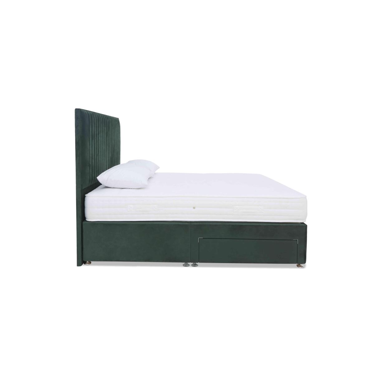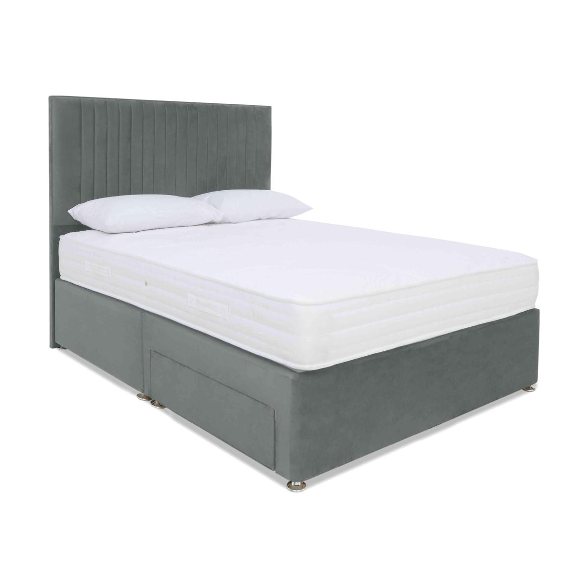 Firm-feel mattress comfort now comes with advanced cooling technology. The cooling gel fillings and Cooltouch mattress covers of our Sleep Story Firm Gel collection mean that you can enjoy the firm-support pocket spring and foam feel that you love with the welcome assurance that you won’t overheat at night. And, to make things even easier, we’ve paired these fabulous mattresses with a wide choice of divan base options including ones with built-in storage drawers and underbed storage. The range even includes two power ottoman bases so you can enjoy spacious and ergonomically designed storage with absolutely no heavy lifting. Made by Highgrove, the Sleep Story Firm Gel collection is only available at Furniture Village. If you’re a fan of a firm mattress – especially one that’s designed to keep you cool – we think you’ll love this divan set with optional storage drawers. In a wide choice of fabrics, only at Furniture Village. Why you'll love it Comfort meets style – we’ve paired this firm gel mattress with a luxe divan base. Firm mattress support meets stylish divan storage at a great-value price. Mattress has advanced gel fillings to help regulate body temperature for undisturbed sleep. 1000 pocket springs in king size for head to toe firm support. Special Cooltouch mattress cover for totally refreshing sleep. Platform-top base ensures excellent mattress support. Increase your bedroom storage by adding your choice of built-in drawers. Upholstered in a wide choice of stylish and sophisticated fabrics. Available in every standard bed size. Made in the UK by Highgrove and exclusive to Furniture Village. This divan set is part of the Sleep Story Firm Gel range. What you need to know Headboard is an optional extra. Mattress type: Pocket spring and gel foam. Depth: 23 cm. Firmness: Firm. Springs: 1000 pocket springs in king size. Pillow top: No. Fillings: Cooling gel foam. Cover: Cooltouch fabric. Requires turning: No. Base type: Platform top with optional storage drawers. Sizes: Small single, single, small double, double, king and super king. Mattress care:Air for 4 hours before using to remove any odour. Indentations caused by settlement of fillings or body weight are normal and are not considered defects. If used on a slatted bed frame, the space between slats must be no wider than 7.5 cm. Spaces wider than this may cause excess dipping of the mattress and invalidate the guarantee. Always use a mattress protector. Rotate regularly. Divan base care: Clean upholstery weekly using a soft brush or vacuum with the curtain attachment. Professional cleaning advised for oil- and grease-based stains. Ordering a small double, double, king or super king size? Your divan base will be supplied in two halves for easier access.