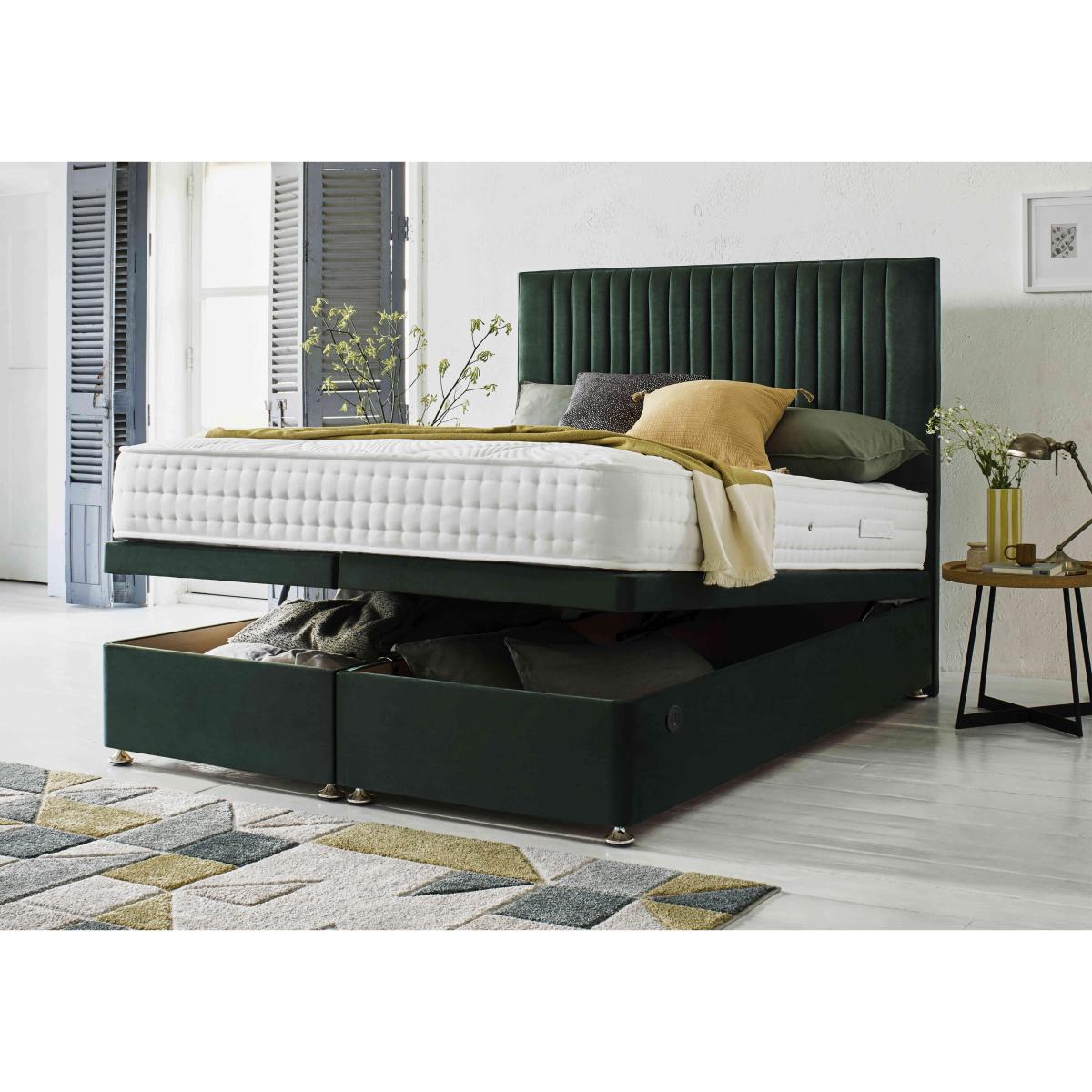 Firm-feel mattress comfort now comes with advanced cooling technology. The cooling gel fillings and Cooltouch mattress covers of our Sleep Story Firm Gel collection mean that you can enjoy the firm-support pocket spring and foam feel that you love with the welcome assurance that you won’t overheat at night. And, to make things even easier, we’ve paired these fabulous mattresses with a wide choice of divan base options including ones with built-in storage drawers and underbed storage. The range even includes two power ottoman bases so you can enjoy spacious and ergonomically designed storage with absolutely no heavy lifting. Made by Highgrove, the Sleep Story Firm Gel collection is only available at Furniture Village. Enjoy firm mattress support, the comfort of cooling gel fillings and easy electric-powered ottoman storage in this fabulous ottoman divan set. Only at Furniture Village. Why you'll love it Power end ottoman divan set with firm gel mattress is a winner all round. Firm mattress support meets effortless divan storage at a great-value price. Mattress has advanced gel fillings to help regulate body temperature for undisturbed sleep. 1000 pocket springs in king size for head to toe firm support. Special Cooltouch mattress cover for totally refreshing sleep. End-opening ottoman divan base is electric powered for storage with ease. Electric cut-out system makes this a super-safe choice. Platform-top style ensures excellent mattress support. Upholstered in a wide choice of stylish and sophisticated fabrics. Available in every standard bed size. Made in the UK by Highgrove and exclusive to Furniture Village. This power end ottoman divan set is part of the Sleep Story Firm Gel range. What you need to know Headboard is an optional extra. Mattress type: Pocket spring and gel foam. Depth: 23 cm. Firmness: Firm. Springs: 1000 pocket springs in king size. Pillow top: No. Fillings: Cooling gel foam. Cover: Cooltouch fabric. Requires turning: No. Base type: Platform top with electric-powered end-opening ottoman storage. Sizes: Small single, single, small double, double, king and super king. Mattress care:Air for 4 hours before using to remove any odour. Indentations caused by settlement of fillings or body weight are normal and are not considered defects. If used on a slatted bed frame, the space between slats must be no wider than 7.5 cm. Spaces wider than this may cause excess dipping of the mattress and invalidate the guarantee. Always use a mattress protector. Rotate regularly. Divan base care: Clean upholstery weekly using a soft brush or vacuum with the curtain attachment. Professional cleaning advised for oil- and grease-based stains. Be careful care when opening and closing the ottoman base. The ottoman base is powered by mains electricity. Please ensure that you will be able to connect it to a power source before ordering. Ordering a small double, double, king or super king size? Your divan base will be supplied in two halves for easier access.