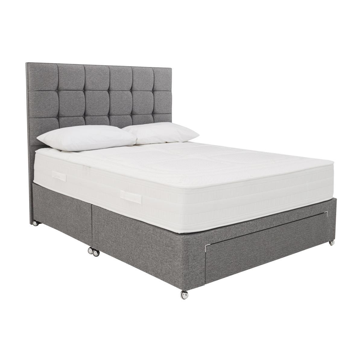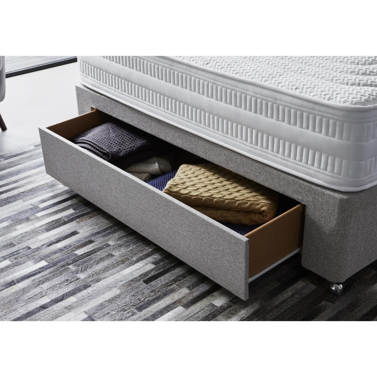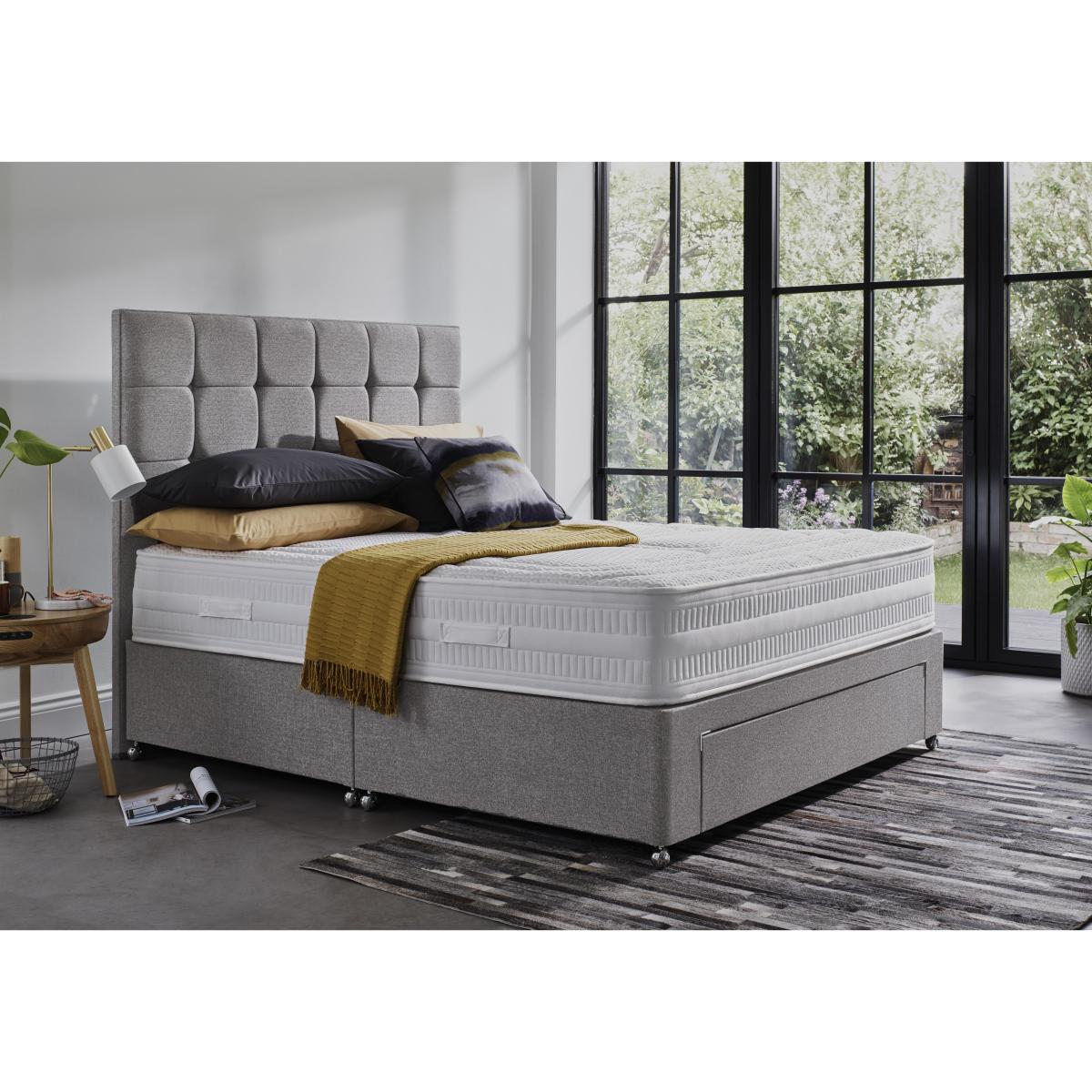 There’s something for everyone in the Sleep Story range, made in Britain and exclusive to Furniture Village. Whether your ideal mattress is traditional and tufted, pillow topped and pocket sprung, or microquilted and foam layered, you’ll find the promise of a wonderfully comfortable night’s sleep waiting for you right here. Pair your perfect mattress with a beautifully-upholstered, platform-top or sprung divan base, choose the spacious built-in storage that works for you – optional drawers, end-lift ottoman or side-lift ottoman – and complete the look with a stylish headboard. With a wide choice of traditionally handcrafted mattresses – including convenient roll up mattresses – storage divans and designer headboards, the incredible-value Sleep Story collection is tailor-made in the UK, just for you. Headboard is an optional extra. Mattress has layers of zoned gel and pocket springs. Beautiful divan base with optional drawers or ottoman storage. British made and exclusive to Furniture Village. Combining cushioning gel with responsive pocket springs, the mattress in the Sleep Story Gel Hybrid 1500 divan set promises a level of comfort like no other. And as it’s combined with a fabulous divan base with your choice of drawers or roomy ottoman compartment, all your bedroom storage problems will be solved, too. The mattress’s gel layer is zoned for customised comfort, while the layer of 1500 pocket springs in king size provides excellent support. Between the two, you’ll find cushioning foam. This hypoallergenic medium feel mattress is 27 cm in depth, is fully encapsulated for edge to edge support, and has a cooling stretch fabric cover. The platform-top divan base has your choice of optional storage drawers or ottoman compartment, and is beautifully upholstered in fabric. Handcrafted in Britain, the Sleep Story Gel Hybrid 1500 divan set comes with a 10 year warranty, and is part of the Sleep Story collection. The Sleep Story Gel Hybrid 1500 range is only available at Furniture Village. Did you know?. The mattress should be aired for four hours after delivery to freshen and remove any aroma from storage. It may take time for your mattress to attain its full size once the springs have settled to the correct position. This is due to the mattress being upright during transit. Settlement of fillings and indentations caused by body weight compressing the fillings are natural and not considered defects. This can be minimised by regular rotating.