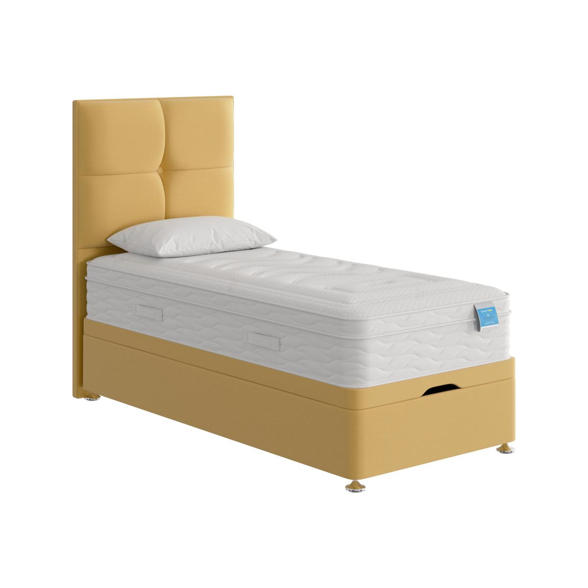 Imagine drifting off to sleep on a beautifully crafted pocket spring mattress layered with natural fillings of cashmere, cotton, wool and silk. The medium-feel Sleep Story Natural Luxury Hybrid mattress combines perfect support with the sumptuous cushioning of natural materials – and it’s hypoallergenic too. Made especially for Furniture Village by Highgrove, the collection includes mattresses in every size from small single to super king as well as a wide choice of divan sets with built-in drawer and ottoman storage upholstered in gorgeous fabrics. The excellent-value Sleep Story Natural Luxury Hybrid range is only available at Furniture Village. Here’s a divan set that ticks all the boxes. The hybrid pocket spring and gel foam mattress is both supportive and cooling, and the ottoman divan base is stylish and practical. A great-value price, too. Why you'll love it. Great-value ottoman divan set with pocket spring and gel foam mattress. Mattress offers a relaxing combination of support plus softness. With 1400 pocket springs in king size for pressure-relief and spinal alignment. Gel foam layer provides cushioning comfort without heat build-up. Hypoallergenic. Platform-top base has a useful end-opening ottoman storage compartment. Wide selection of on-trend upholstery fabrics. Made in the UK by Highgrove and exclusive to Furniture Village. The Sleep Story Gel Plus Hybrid range includes a mattress and ottoman divan sets. What you need to know. Headboard is an optional extra. Mattress type: Pocket spring and gel foam. Depth: 25.5 cm. Firmness: Medium. Springs: 1400 pocket springs in king size. Pillow top: No. Fillings: 7.5 cm gel, 18 cm fibre. Cover: Micro Tencel and polyester. Requires turning: No. Base type: Platform top with end-opening ottoman storage. Sizes: Small single, single, small double, double, king and super king. Mattress care: Air for 4 hours before using to remove any odour. Allow at least 4 hours for springs to settle and for mattress to attain its full size. Indentations caused by settlement of fillings or body weight are normal and are not considered defects. If used on a slatted bed frame, the space between slats must be no wider than 7.5 cm. Spaces wider than this may cause excess dipping of the mattress and invalidate the guarantee. Always use a mattress protector. Rotate regularly. Divan base care: Clean upholstery weekly using a soft brush or vacuum with the curtain attachment. Professional cleaning advised for oil- and grease-based stains. Please note: Divan base is supplied in two halves for small double, double, king and super king sizes.