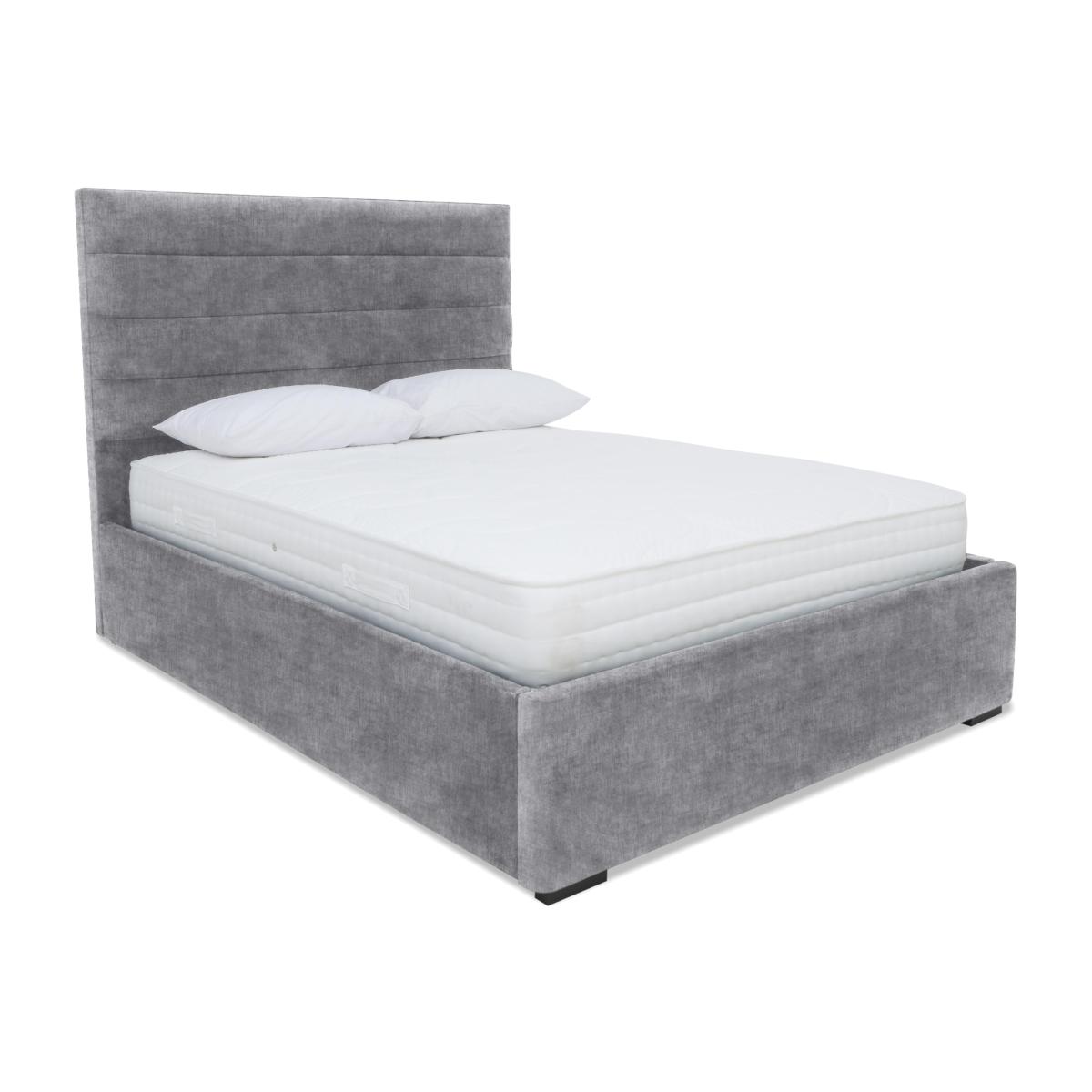 I’d call this the Horizon ottoman bed in Lace Dolphin, and what I really like is its neat, channel-stitched headboard combined with the electric lift storage - Ideal for a tidy, modern bedroom. The muted dove-grey velvet works equally well in Scandi-inspired schemes with pale woods and washed linens, or in a more contemporary setting paired with black-metal lamps and geometric cushions. For styling, keep your bedside surfaces clear to let the headboard’s texture stand out: a slim table lamp and a small potted plant are all you need. Choose crisp white or soft-grey bedding to complement the upholstery, then layer in a single accent colour - for example a muted teal or dusty pink throw - to give the space a focal point without cluttering the look.