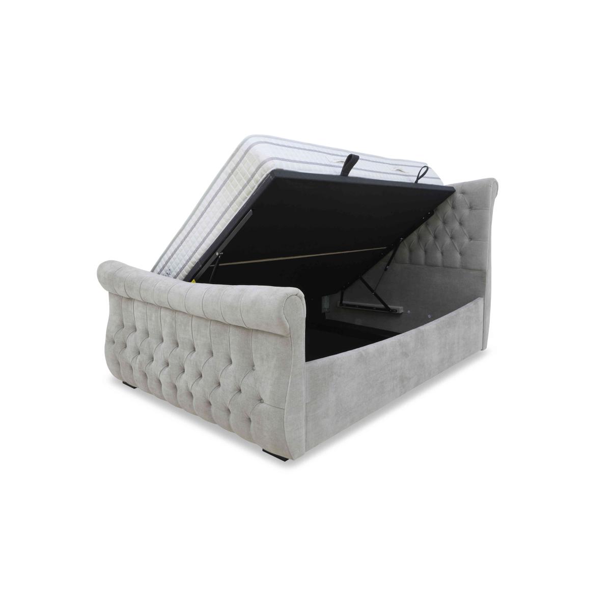 Always wanted a sleigh bed? This one is gorgeous and, with side-opening ottoman storage, is perfect for a smaller bedroom. Please note: the ottoman opens on the right-hand side of the bed frame. Why you'll love it This beautiful sleigh-style ottoman bed frame is designed to fit any bedroom. Gorgeous scrolled headboard and foot end. Ergonomic design means it's shorter from end to end than other sleigh beds. Sumptuously cushioned and beautifully upholstered. Lavish buttoning adds to the luxe look. Side-opening ottoman storage compartment is ideal for narrower bedrooms. Ottoman lifts up on the left-hand side as you face the headboard. In a huge selection of upholstery fabrics and colours. Wide choice of sizes – single, small double, double, king and super king bed sizes. This Highgrove ottoman bed frame is a Furniture Village exclusive. What you need to know Mattress sold separately. This ottoman bed frame opens at the side. Maximum mattress weight is 80 kg for all sizes. Please keep hands clear of the mechanism when opening and closing the ottoman. Do not sit on this ottoman bed frame when opening. Clean regularly using a soft brush or vacuum with the curtain attachment. Deal with any spills promptly. Professional cleaning advised for oil- and grease-based stains. Some fabrics can show wear on areas of more use or in direct sunlight. Flattening and shading of heavy wear areas on pile fabrics like velvet is unavoidable. Be sure to brush pile fabrics only in the direction of the pile. Please read our upholstery care guide for more advice. Item code: LANCOT60R-007
