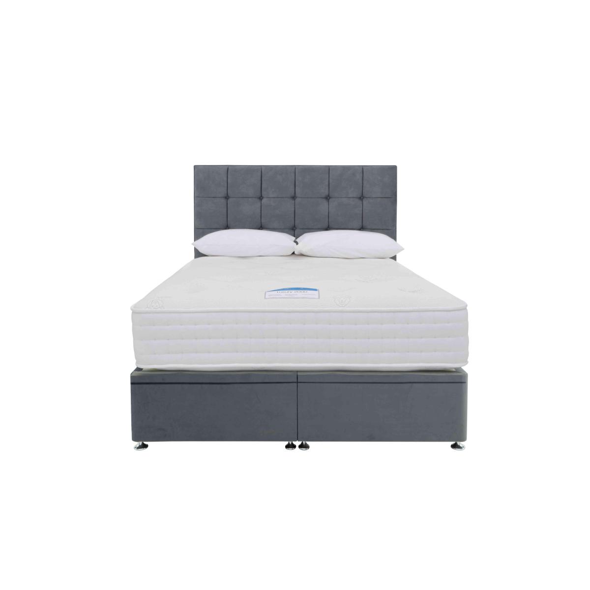 The Sleep Story by Highgrove Luxury 2000 range delivers luxury comfort at an impressively affordable price. Inside the hypoallergenic mattress is a luxurious blend of natural wool, cotton, silk and cashmere for sumptuous comfort and 2000 pocket springs for total body support. This design encourages correct spinal alignment and relieves pressure, so it’s ideal for those looking for more support from their mattress. For additional comfort, the mattress is finished with a super-soft and breathable Tencel™ cover which keeps you cool and comfortable through the night. A range of divan bases are available in a selection of contemporary colours and come with a variety of space-saving storage options. Expertly handcrafted in the UK exclusively for Furniture Village. This incredible value ottoman divan set gives you that luxury mattress feel plus an electric-powered ottoman storage base for easy access and space-saving storage. Why you'll love it This electric-powered ottoman divan set includes a very luxurious mattress. Style, comfort and effortless storage at a great-value price. Pocket spring mattress has natural fillings for support with a touch of softness. 2000 individually pocketed springs in king size provide excellent pressure relief. Sumptuous layers of wool, cotton, silk and cashmere. Hypoallergenic. Power ottoman divan base means roomy storage – with no lifting required. Child lock feature makes the electric mechanism as safe as it is simple. Platform-top style for excellent mattress support. Choose from a wide selection of stylish upholstery fabrics. Made in the UK by Highgrove and exclusive to Furniture Village. Only available online. This power ottoman divan set is part of the Sleep Story Luxury 2000 range. What you need to know Headboard is an optional extra. Mattress type: Pocket spring and natural fillings. Depth: 28 cm. Firmness: Medium. Springs: 2000 pocket springs in king size. Pillow top: No. Fillings: Wool, cotton, silk and cashmere. Cover: Breathable Tencel. Requires turning: No. Base type: Platform top with electric-powered end-opening ottoman storage base. Sizes: Small single, single, small double, double, king and super king. Mattress care:Air for 4 hours before using to remove any odour. Indentations caused by settlement of fillings or body weight are normal and are not considered defects. If used on a slatted bed frame, the space between slats must be no wider than 7.5 cm. Spaces wider than this may cause excess dipping of the mattress and invalidate the guarantee. Always use a mattress protector. Rotate regularly. Divan base care: Clean upholstery weekly using a soft brush or vacuum with the curtain attachment. Professional cleaning advised for oil- and grease-based stains. Be careful care when opening and closing the ottoman base. The ottoman base is powered by mains electricity. Please ensure that you will be able to connect it to a power source before ordering. Ordering a small double, double, king or super king size? Your divan base will be supplied in two halves for easier access.