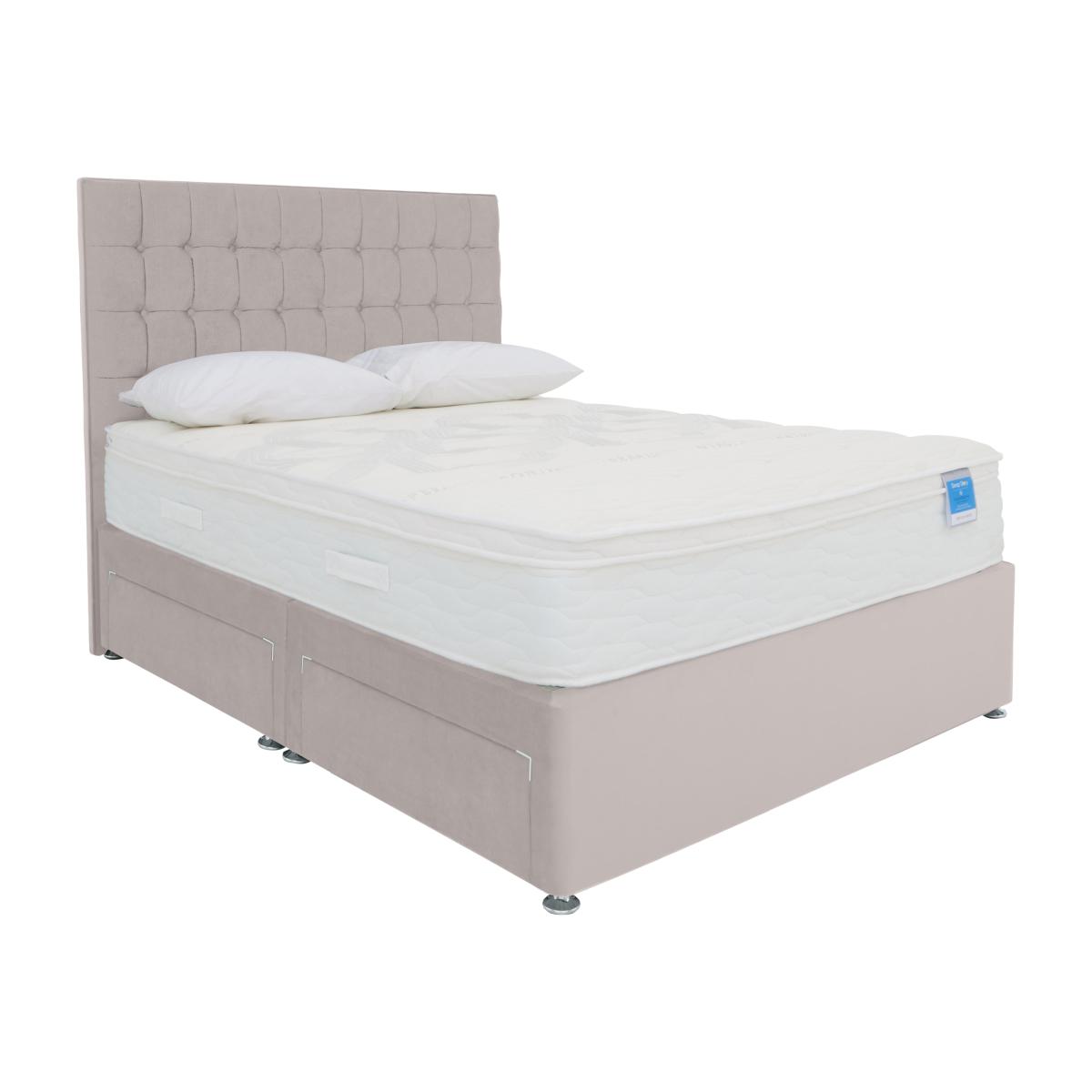 Crafted in the UK by Highgrove, the Sleep Story Memory Hybrid mattress and divan set range delivers on comfort, style, choice – and value. The collection’s mattresses cleverly combine pocket spring support with memory foam layers for the ultimate in comfort, and its stylish divan bases are upholstered in a wide choice of high-quality fabrics. The range is extensive – mattresses and beds come in every size from small single to super king, and divan sets have a wide selection of drawer and ottoman storage options. The Sleep Story Memory Hybrid range is only available at Furniture Village so you can be assured of great quality at a great price. We promise you’ll sleep well on this stylish Sleep Story divan set with optional storage drawers. The pocket spring and memory foam mattress is so very comfortable, and the great-value price is just as relaxing. Why you'll love it. Fantastic-value divan set with pocket spring and memory foam mattress. Mattress offers the perfect combination of comfort and support. With 1400 pocket springs in king size for pressure-relieving support. Memory foam layer provides cushioning comfort. Hypoallergenic and with a chemical-free fabric cover. Platform-top base with a variety of optional storage drawers. Wide choice of fashionable upholstery fabrics. Made in the UK by Highgrove and exclusive to Furniture Village. The Sleep Story Memory Hybrid range includes a mattress and ottoman divan sets. What you need to know. Headboard is an optional extra. Mattress type: Pocket spring and memory foam. Depth: 25.5 cm. Firmness: Medium. Springs: 1400 pocket springs in king size. Pillow top: No. Fillings: 18 cm memory foam, 2.5 cm hard reflex, 18 cm fibre. Cover: Chemical-free polyester. Requires turning: No. Base type: Platform top with optional drawer storage. Sizes: Small single, single, small double, double, king and super king. Mattress care: Air for 4 hours before using to remove any odour. Allow at least 4 hours for springs to settle and for mattress to attain its full size. Indentations caused by settlement of fillings or body weight are normal and are not considered defects. If used on a slatted bed frame, the space between slats must be no wider than 7.5 cm. Spaces wider than this may cause excess dipping of the mattress and invalidate the guarantee. Always use a mattress protector. Rotate regularly. Divan base care: Clean upholstery weekly using a soft brush or vacuum with the curtain attachment. Professional cleaning advised for oil- and grease-based stains. Please note: Divan base is supplied in two halves for small double, double, king and super king sizes.