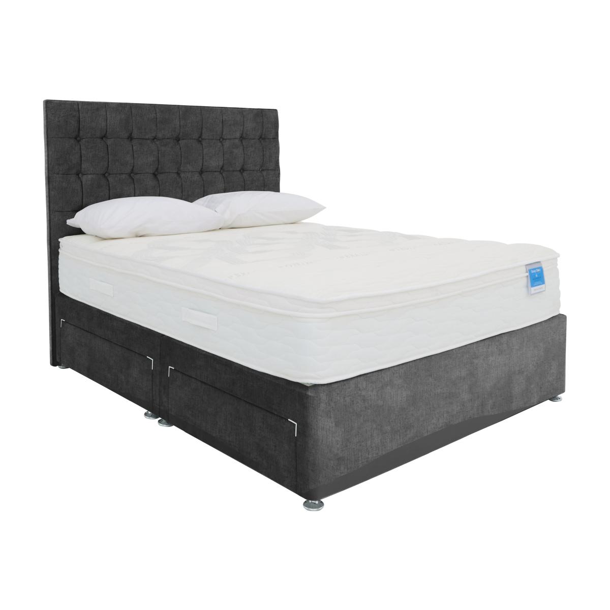 Crafted in the UK by Highgrove, the Sleep Story Memory Hybrid mattress and divan set range delivers on comfort, style, choice – and value. The collection’s mattresses cleverly combine pocket spring support with memory foam layers for the ultimate in comfort, and its stylish divan bases are upholstered in a wide choice of high-quality fabrics. The range is extensive – mattresses and beds come in every size from small single to super king, and divan sets have a wide selection of drawer and ottoman storage options. The Sleep Story Memory Hybrid range is only available at Furniture Village so you can be assured of great quality at a great price. We promise you’ll sleep well on this stylish Sleep Story divan set with optional storage drawers. The pocket spring and memory foam mattress is so very comfortable, and the great-value price is just as relaxing. Why you'll love it. Fantastic-value divan set with pocket spring and memory foam mattress. Mattress offers the perfect combination of comfort and support. With 1400 pocket springs in king size for pressure-relieving support. Memory foam layer provides cushioning comfort. Hypoallergenic and with a chemical-free fabric cover. Platform-top base with a variety of optional storage drawers. Wide choice of fashionable upholstery fabrics. Made in the UK by Highgrove and exclusive to Furniture Village. The Sleep Story Memory Hybrid range includes a mattress and ottoman divan sets. What you need to know. Headboard is an optional extra. Mattress type: Pocket spring and memory foam. Depth: 25.5 cm. Firmness: Medium. Springs: 1400 pocket springs in king size. Pillow top: No. Fillings: 18 cm memory foam, 2.5 cm hard reflex, 18 cm fibre. Cover: Chemical-free polyester. Requires turning: No. Base type: Platform top with optional drawer storage. Sizes: Small single, single, small double, double, king and super king. Mattress care: Air for 4 hours before using to remove any odour. Allow at least 4 hours for springs to settle and for mattress to attain its full size. Indentations caused by settlement of fillings or body weight are normal and are not considered defects. If used on a slatted bed frame, the space between slats must be no wider than 7.5 cm. Spaces wider than this may cause excess dipping of the mattress and invalidate the guarantee. Always use a mattress protector. Rotate regularly. Divan base care: Clean upholstery weekly using a soft brush or vacuum with the curtain attachment. Professional cleaning advised for oil- and grease-based stains. Please note: Divan base is supplied in two halves for small double, double, king and super king sizes.