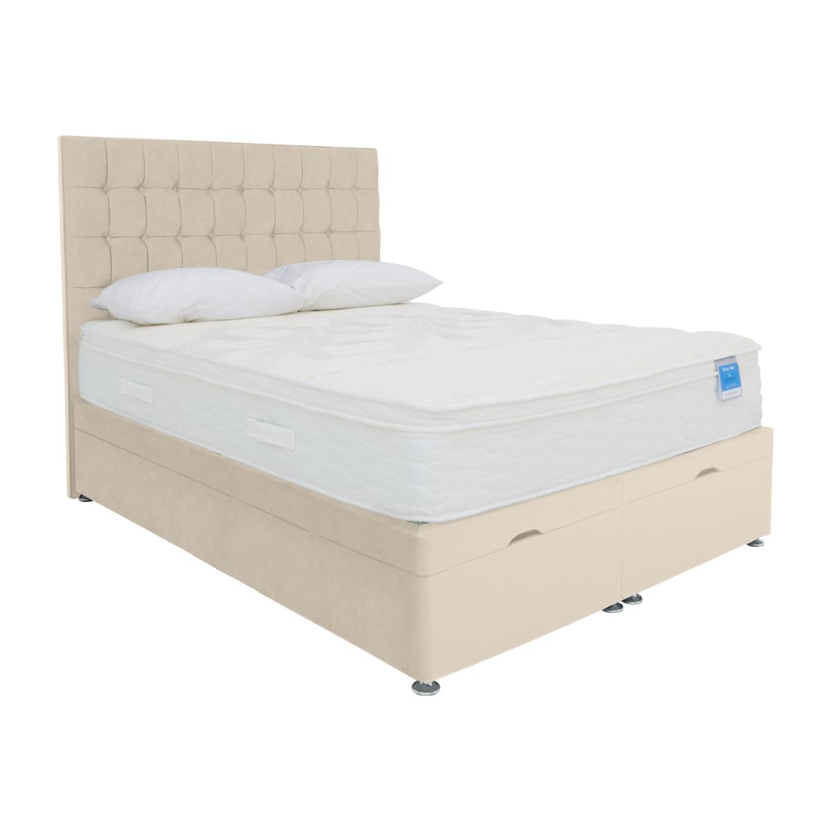 Crafted in the UK by Highgrove, the Sleep Story Memory Hybrid mattress and divan set range delivers on comfort, style, choice – and value. The collection’s mattresses cleverly combine pocket spring support with memory foam layers for the ultimate in comfort, and its stylish divan bases are upholstered in a wide choice of high-quality fabrics. The range is extensive – mattresses and beds come in every size from small single to super king, and divan sets have a wide selection of drawer and ottoman storage options. The Sleep Story Memory Hybrid range is only available at Furniture Village so you can be assured of great quality at a great price. Look forward to better sleep on this ultra-comfy pocket spring and memory foam mattress. And keep your bedroom neat and tidy thanks to the roomy ottoman storage space concealed within the stylish divan base. Why you'll love it. Fantastic-value ottoman divan base with pocket spring and memory foam mattress. Mattress offers the perfect combination of comfort and support. With 1400 pocket springs in king size for pressure-relieving support. Memory foam layer provides cushioning comfort. Hypoallergenic and with a chemical-free fabric cover. Platform-top base has spacious end-opening ottoman storage. Wide choice of fashionable upholstery fabrics. Made in the UK by Highgrove and exclusive to Furniture Village. The Sleep Story Memory Hybrid range includes a mattress and divan sets with drawers. What you need to know. Headboard is an optional extra. Mattress type: Pocket spring and memory foam. Depth: 25.5 cm. Firmness: Medium. Springs: 1400 pocket springs in king size. Pillow top: No. Fillings: 18 cm memory foam, 2.5 cm hard reflex, 18 cm fibre. Cover: Chemical-free polyester. Requires turning: No. Base type: Platform top with end-opening ottoman storage. Sizes: Small single, single, small double, double, king and super king. Mattress care: Air for 4 hours before using to remove any odour. Allow at least 4 hours for springs to settle and for mattress to attain its full size. Indentations caused by settlement of fillings or body weight are normal and are not considered defects. If used on a slatted bed frame, the space between slats must be no wider than 7.5 cm. Spaces wider than this may cause excess dipping of the mattress and invalidate the guarantee. Always use a mattress protector. Rotate regularly. Divan base care: Clean upholstery weekly using a soft brush or vacuum with the curtain attachment. Professional cleaning advised for oil- and grease-based stains. Take care when opening and closing ottoman. Please note: Divan base is supplied in two halves for small double, double, king and super king sizes.