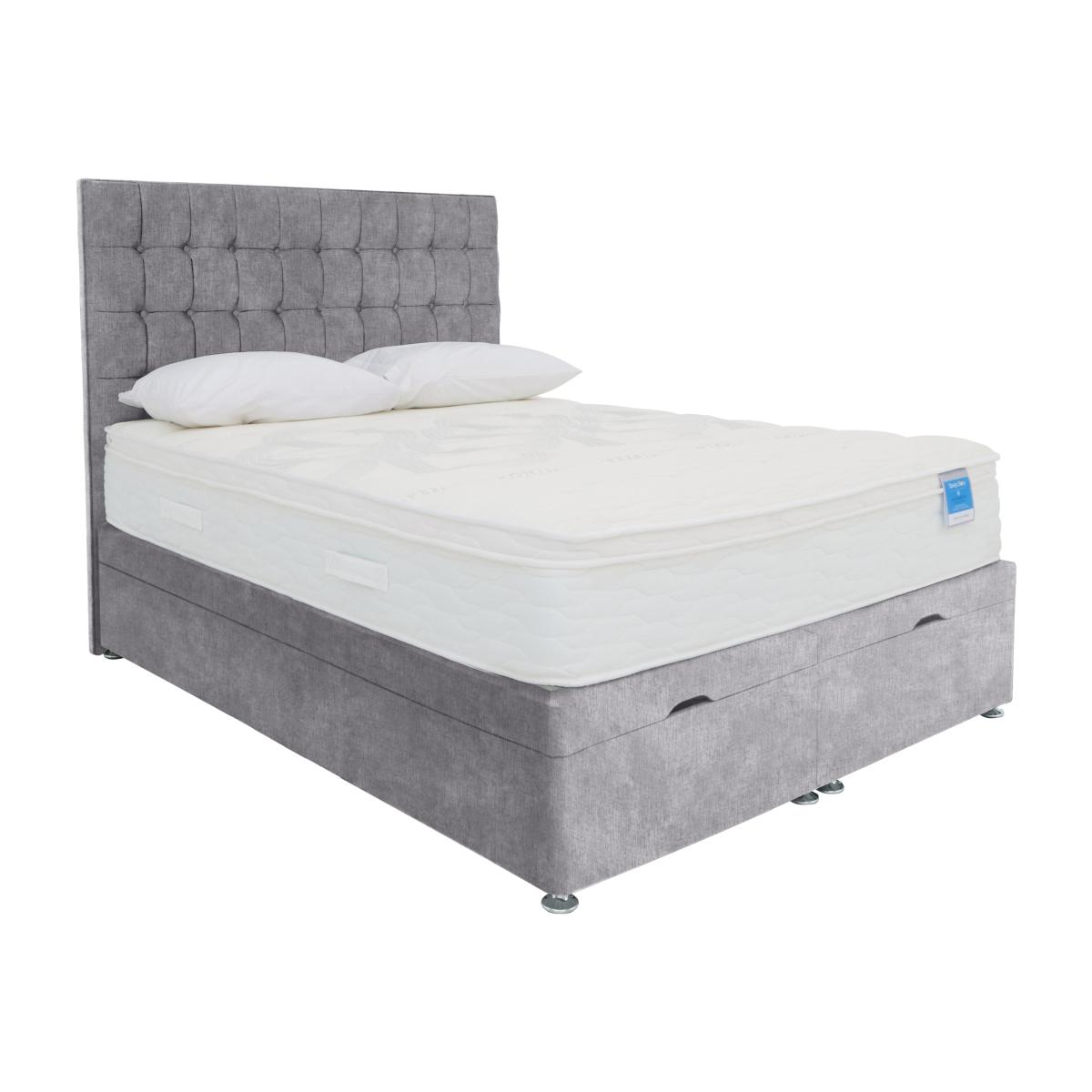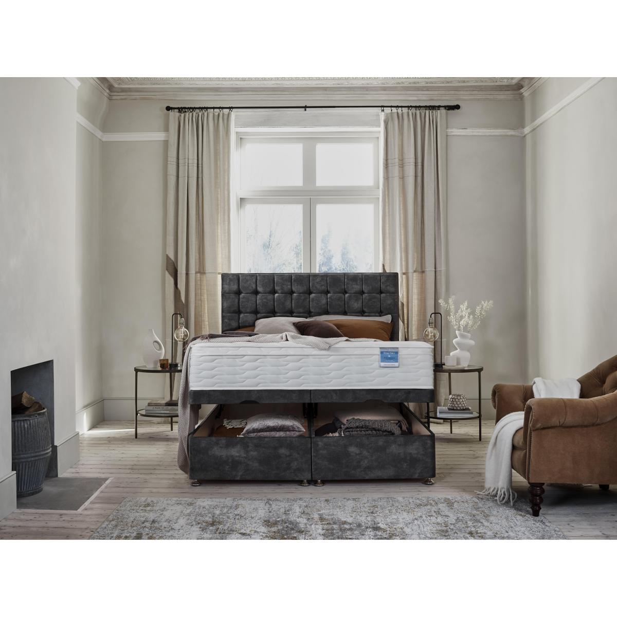 Crafted in the UK by Highgrove, the Sleep Story Memory Hybrid mattress and divan set range delivers on comfort, style, choice – and value. The collection’s mattresses cleverly combine pocket spring support with memory foam layers for the ultimate in comfort, and its stylish divan bases are upholstered in a wide choice of high-quality fabrics. The range is extensive – mattresses and beds come in every size from small single to super king, and divan sets have a wide selection of drawer and ottoman storage options. The Sleep Story Memory Hybrid range is only available at Furniture Village so you can be assured of great quality at a great price. Look forward to better sleep on this ultra-comfy pocket spring and memory foam mattress. And keep your bedroom neat and tidy thanks to the roomy ottoman storage space concealed within the stylish divan base. Why you'll love it Fantastic-value ottoman divan base with pocket spring and memory foam mattress. Mattress offers the perfect combination of comfort and support. With 1400 pocket springs in king size for pressure-relieving support. Memory foam layer provides cushioning comfort. Hypoallergenic and with a chemical-free fabric cover. Platform-top base has spacious end-opening ottoman storage. Wide choice of fashionable upholstery fabrics. Made in the UK by Highgrove and exclusive to Furniture Village. The Sleep Story Memory Hybrid range includes a mattress and divan sets with drawers. What you need to know Headboard is an optional extra. Mattress type: Pocket spring and memory foam. Depth: 25.5 cm. Firmness: Medium. Springs: 1400 pocket springs in king size. Pillow top: No. Fillings: 18 cm memory foam, 2.5 cm hard reflex, 18 cm fibre. Cover: Chemical-free polyester. Requires turning: No. Base type: Platform top with end-opening ottoman storage. Sizes: Small single, single, small double, double, king and super king. Mattress care:Air for 4 hours before using to remove any odour. Allow at least 4 hours for springs to settle and for mattress to attain its full size. Indentations caused by settlement of fillings or body weight are normal and are not considered defects. If used on a slatted bed frame, the space between slats must be no wider than 7.5 cm. Spaces wider than this may cause excess dipping of the mattress and invalidate the guarantee. Always use a mattress protector. Rotate regularly. Divan base care: Clean upholstery weekly using a soft brush or vacuum with the curtain attachment. Professional cleaning advised for oil- and grease-based stains. Take care when opening and closing ottoman. Please note: Divan base is supplied in two halves for small double, double, king and super king sizes.