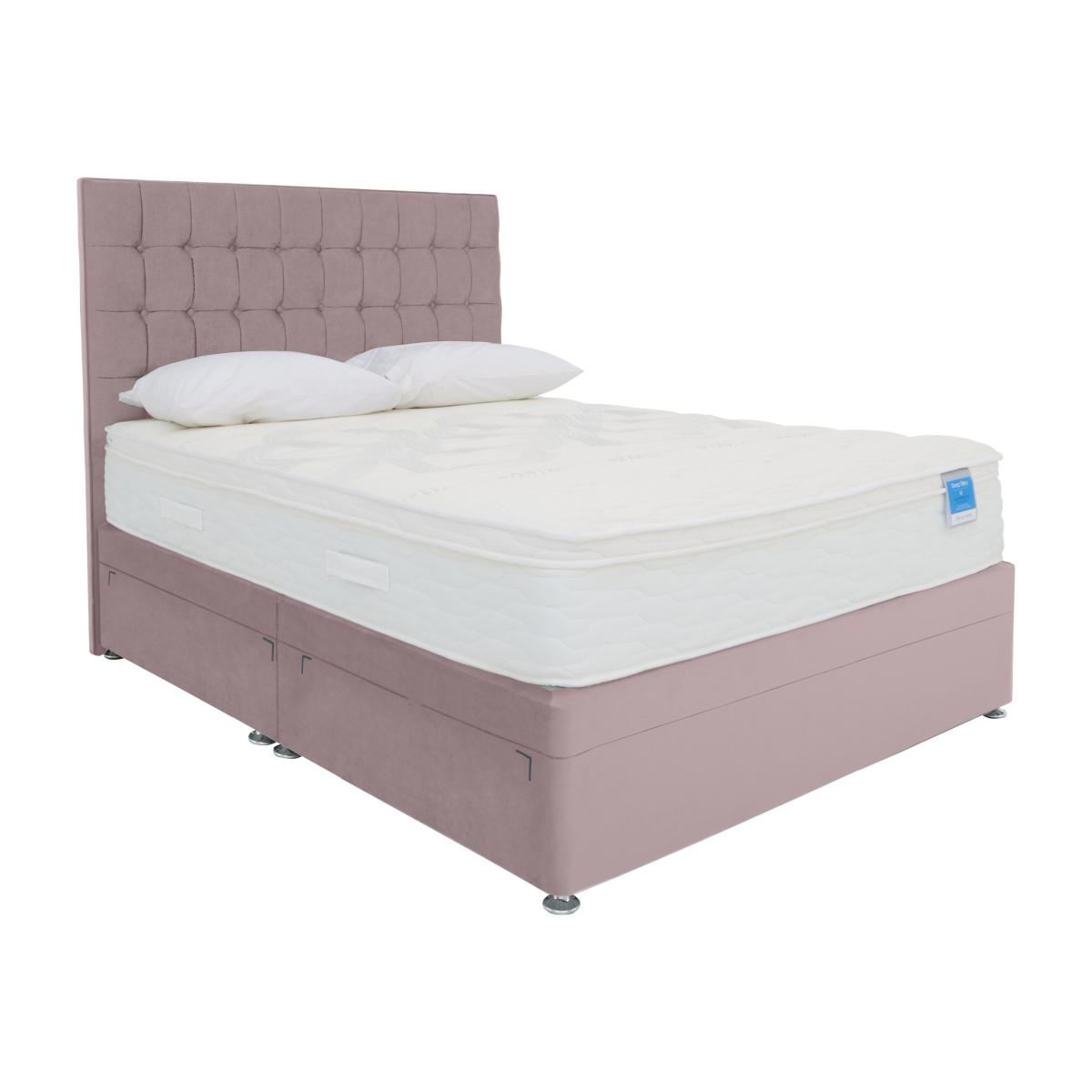 Crafted in the UK by Highgrove, the Sleep Story Memory Hybrid mattress and divan set range delivers on comfort, style, choice – and value. The collection’s mattresses cleverly combine pocket spring support with memory foam layers for the ultimate in comfort, and its stylish divan bases are upholstered in a wide choice of high-quality fabrics. The range is extensive – mattresses and beds come in every size from small single to super king, and divan sets have a wide selection of drawer and ottoman storage options. The Sleep Story Memory Hybrid range is only available at Furniture Village so you can be assured of great quality at a great price. An extra comfortable pocket spring and memory foam mattress plus extra storage in the divan base – this Sleep Story divan set has it all, and at a great price too. The side-opening ottoman base is a real space saver. Why you'll love it. Fantastic-value ottoman divan base with pocket spring and memory foam mattress. Mattress offers the perfect combination of comfort and support. With 1400 pocket springs in king size for pressure-relieving support. Memory foam layer provides cushioning comfort. Hypoallergenic and with a chemical-free fabric cover. Platform-top base has spacious side-opening ottoman storage. Wide choice of fashionable upholstery fabrics. Made in the UK by Highgrove and exclusive to Furniture Village. The Sleep Story Memory Hybrid range includes a mattress and divan sets with drawers. What you need to know. Headboard is an optional extra. Mattress type: Pocket spring and memory foam. Depth: 25.5 cm. Firmness: Medium. Springs: 1400 pocket springs in king size. Pillow top: No. Fillings: 18 cm memory foam, 2.5 cm hard reflex, 18 cm fibre. Cover: Chemical-free polyester. Requires turning: No. Base type: Platform top with side-opening ottoman storage. Sizes: Small single, single, small double, double, king and super king. Mattress care: Air for 4 hours before using to remove any odour. Allow at least 4 hours for springs to settle and for mattress to attain its full size. Indentations caused by settlement of fillings or body weight are normal and are not considered defects. If used on a slatted bed frame, the space between slats must be no wider than 7.5 cm. Spaces wider than this may cause excess dipping of the mattress and invalidate the guarantee. Always use a mattress protector. Rotate regularly. Divan base care: Clean upholstery weekly using a soft brush or vacuum with the curtain attachment. Professional cleaning advised for oil- and grease-based stains. Take care when opening and closing ottoman. Please note: Divan base is supplied in two halves for small double, double, king and super king sizes.
