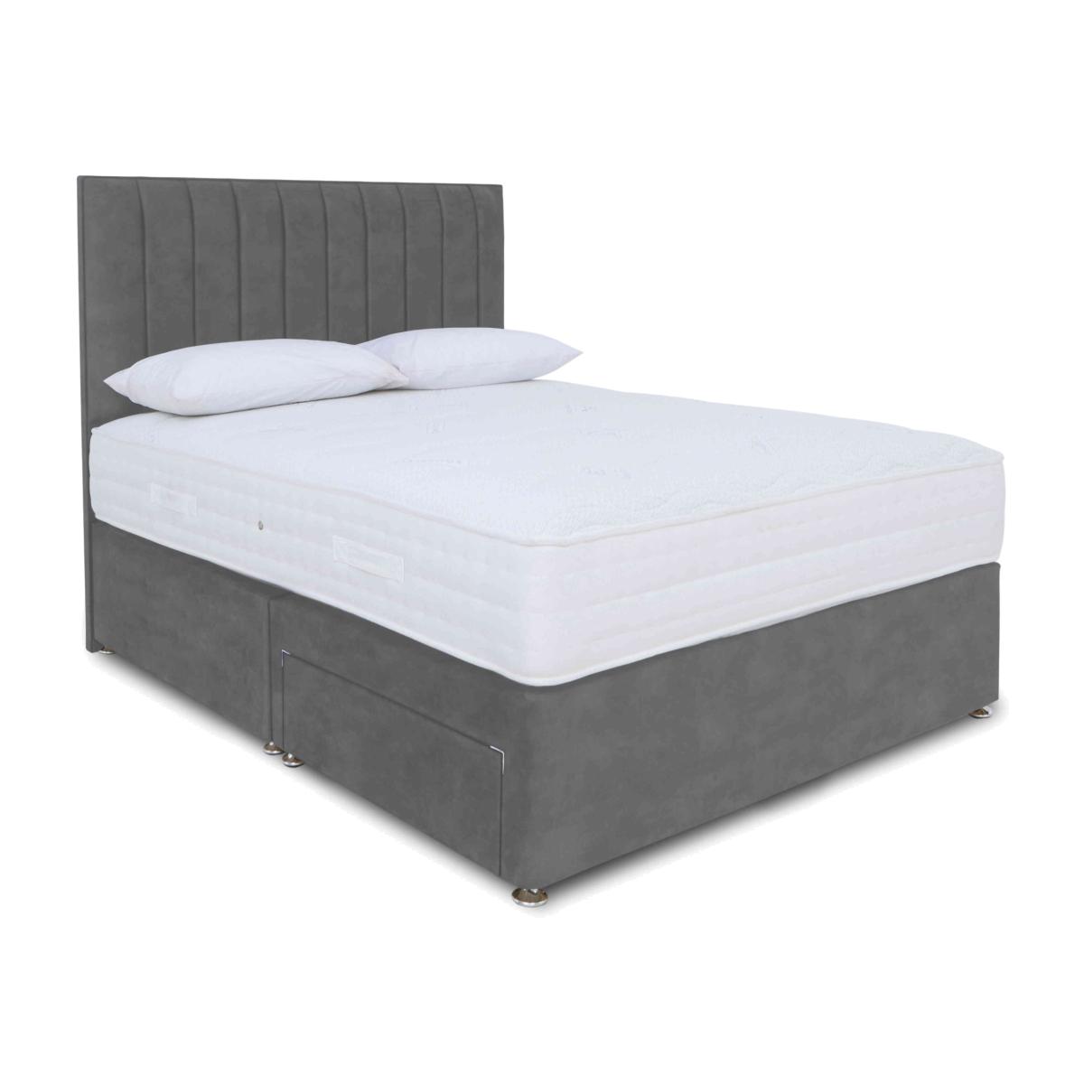 You’ll sleep well on this stylish Sleep Story divan set with optional storage drawers. The pocket spring and memory foam mattress is so very comfortable, and the great-value price is just as relaxing. Why you'll love it Divan set with pocket spring and memory foam mattress promises all round better sleep. Get the best of both worlds at a great-value price. AdvantEdge® pocket spring system has 1000 springs in king size. It’s designed to offer total body support across the entire sleep surface. Ensures correct spinal alignment for better quality of sleep. Layer of cushioning memory foam conforms to your body’s shape and weight. Improves pressure relief and reduces aches and pains. Breathable micro-quilted knitted stretch cover made with Tencel®. Hypoallergenic. Divan set includes a platform-top base with optional storage drawers. Available in a wide selection of stylish upholstery fabrics. Made in the UK by Highgrove and exclusive to Furniture Village. This divan set is part of the Sleep Story Memory Pocket range. Shop the Sleep Story Memory Pocket range for mattresses, divan sets, electric ottoman beds and more. What you need to know Headboard is an optional extra. Mattress type: Hybrid. Depth: 25 cm. Weight:Small single 15.6 kg, single 18.72 kg, small double 24.96 kg, double 28.08 kg, king 31.2 kg and super king 37.4 kg. Firmness: Medium. Springs: 1000 pocket springs in king size. Pillow top: No. Fillings: Memory foam. Cover: Tencel® knitted stretch cover. Requires turning: No. Base type: Platform top with optional storage drawers. Sizes: Small single, single, small double, double, king and super king. Mattress care:Air for 4 hours before using to remove any odour. Indentations caused by settlement of fillings or body weight are normal and are not considered defects. If used on a slatted bed frame, the space between slats must be no wider than 7.5 cm. Spaces wider than this may cause excess dipping of the mattress and invalidate the guarantee. Always use a mattress protector. Rotate regularly. Divan base care: Clean upholstery weekly using a soft brush or vacuum with the curtain attachment. Professional cleaning advised for oil- and grease-based stains. Ordering a small double, double, king or super king size? Your divan base will be supplied in two halves for easier access.