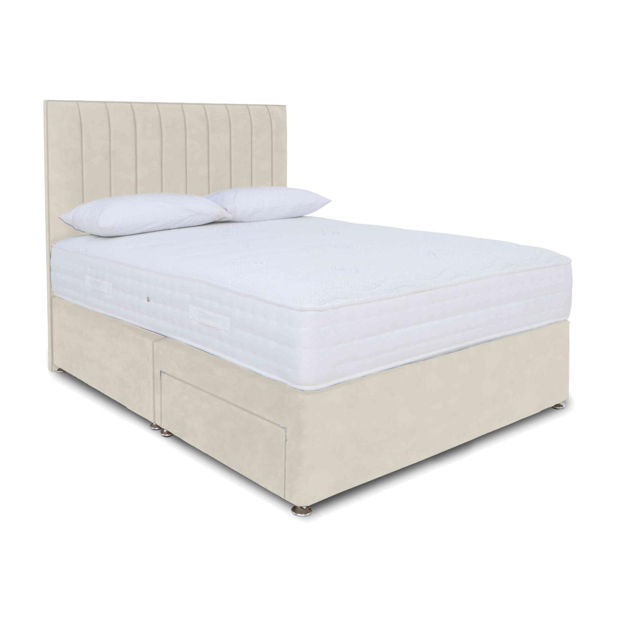 You’ll sleep well on this stylish Sleep Story divan set with optional storage drawers. The pocket spring and memory foam mattress is so very comfortable, and the great-value price is just as relaxing. Why you'll love it Divan set with pocket spring and memory foam mattress promises all round better sleep. Get the best of both worlds at a great-value price. AdvantEdge® pocket spring system has 1000 springs in king size. It’s designed to offer total body support across the entire sleep surface. Ensures correct spinal alignment for better quality of sleep. Layer of cushioning memory foam conforms to your body’s shape and weight. Improves pressure relief and reduces aches and pains. Breathable micro-quilted knitted stretch cover made with Tencel®. Hypoallergenic. Divan set includes a platform-top base with optional storage drawers. Available in a wide selection of stylish upholstery fabrics. Made in the UK by Highgrove and exclusive to Furniture Village. This divan set is part of the Sleep Story Memory Pocket range. Shop the Sleep Story Memory Pocket range for mattresses, divan sets, electric ottoman beds and more. What you need to know Headboard is an optional extra. Mattress type: Hybrid. Depth: 25 cm. Weight:Small single 15.6 kg, single 18.72 kg, small double 24.96 kg, double 28.08 kg, king 31.2 kg and super king 37.4 kg. Firmness: Medium. Springs: 1000 pocket springs in king size. Pillow top: No. Fillings: Memory foam. Cover: Tencel® knitted stretch cover. Requires turning: No. Base type: Platform top with optional storage drawers. Sizes: Small single, single, small double, double, king and super king. Mattress care:Air for 4 hours before using to remove any odour. Indentations caused by settlement of fillings or body weight are normal and are not considered defects. If used on a slatted bed frame, the space between slats must be no wider than 7.5 cm. Spaces wider than this may cause excess dipping of the mattress and invalidate the guarantee. Always use a mattress protector. Rotate regularly. Divan base care: Clean upholstery weekly using a soft brush or vacuum with the curtain attachment. Professional cleaning advised for oil- and grease-based stains. Ordering a small double, double, king or super king size? Your divan base will be supplied in two halves for easier access.