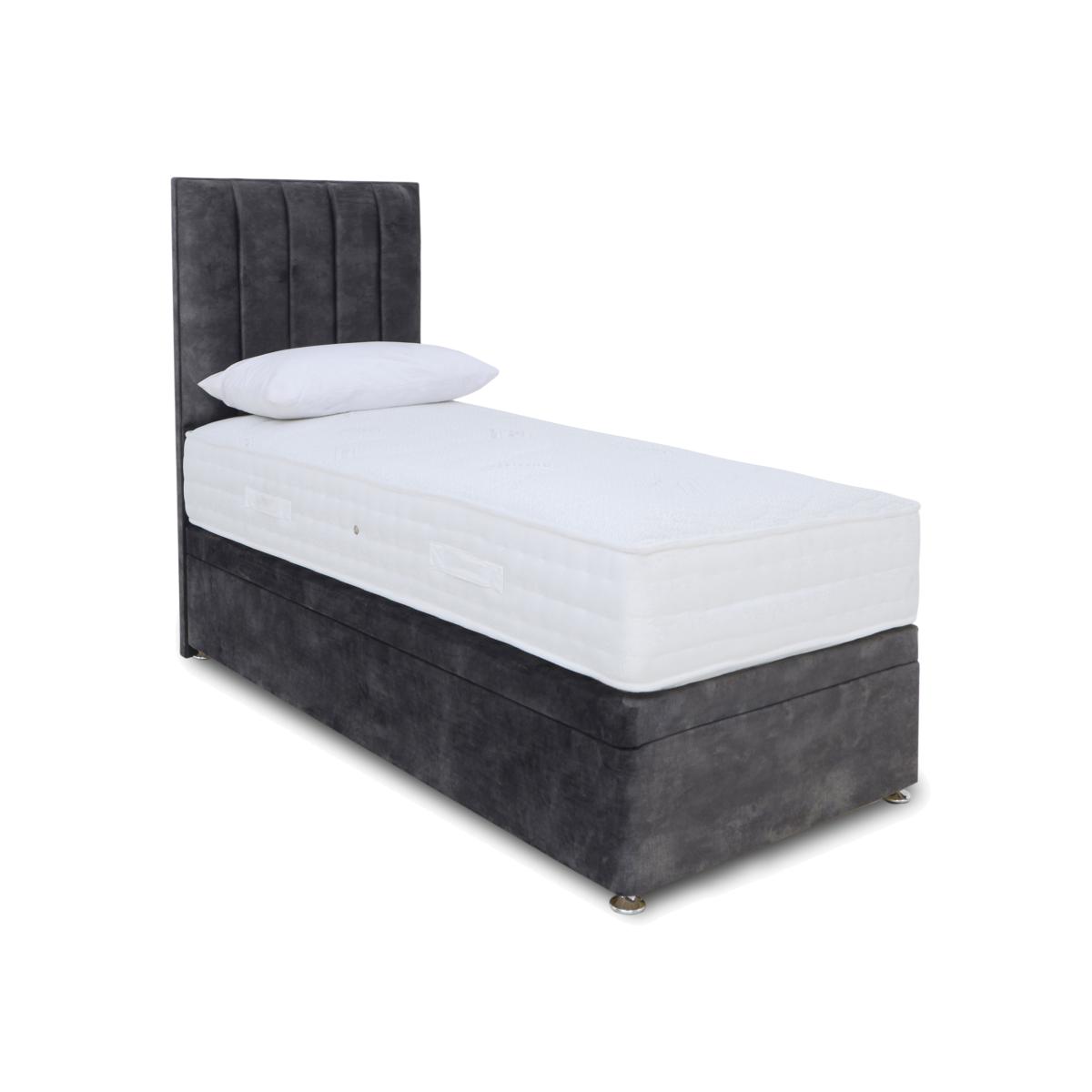 The electric-lift mechanism makes using this divan set’s large ottoman storage space so easy. And you’ll love the super-comfy pocket spring and memory foam matress. Why you'll love it Electric ottoman divan set with pocket spring and memory foam mattress promises all round better sleep. Get the best of both worlds at a great-value price. AdvantEdge® pocket spring system has 1000 springs in king size. It’s designed to offer total body support across the entire sleep surface. Ensures correct spinal alignment for better quality of sleep. Layer of cushioning memory foam conforms to your body’s shape and weight. Improves pressure relief and reduces aches and pains. Breathable micro-quilted knitted stretch cover made with Tencel®. Hypoallergenic. Divan set includes a platform-top base with spacious end-opening ottoman storage. It’s electric powered for effortless access to the storage compartment. Available in a wide selection of stylish upholstery fabrics. Made in the UK by Highgrove and exclusive to Furniture Village. This electric ottoman divan set is part of the Sleep Story Memory Pocket range. Shop the Sleep Story Memory Pocket range for mattresses, divan sets, electric ottoman beds and more. What you need to know Headboard is an optional extra. Mattress type: Hybrid. Depth: 25 cm. Weight:Small single 15.6 kg, single 18.72 kg, small double 24.96 kg, double 28.08 kg, king 31.2 kg and super king 37.4 kg. Firmness: Medium. Springs: 1000 pocket springs in king size. Pillow top: No. Fillings: Memory foam. Cover: Tencel® knitted stretch cover. Requires turning: No. Base type: Platform top with electric-powered end-opening ottoman storage. Sizes: Small single, single, small double, double, king and super king. Mattress care:Air for 4 hours before using to remove any odour. Indentations caused by settlement of fillings or body weight are normal and are not considered defects. If used on a slatted bed frame, the space between slats must be no wider than 7.5 cm. Spaces wider than this may cause excess dipping of the mattress and invalidate the guarantee. Always use a mattress protector. Rotate regularly. Divan base care: Clean upholstery weekly using a soft brush or vacuum with the curtain attachment. Professional cleaning advised for oil- and grease-based stains. Be careful care when opening and closing the ottoman base. The ottoman base is powered by mains electricity. Please ensure that you will be able to connect it to a power source before ordering. Ordering a small double, double, king or super king size? Your divan base will be supplied in two halves for easier access.