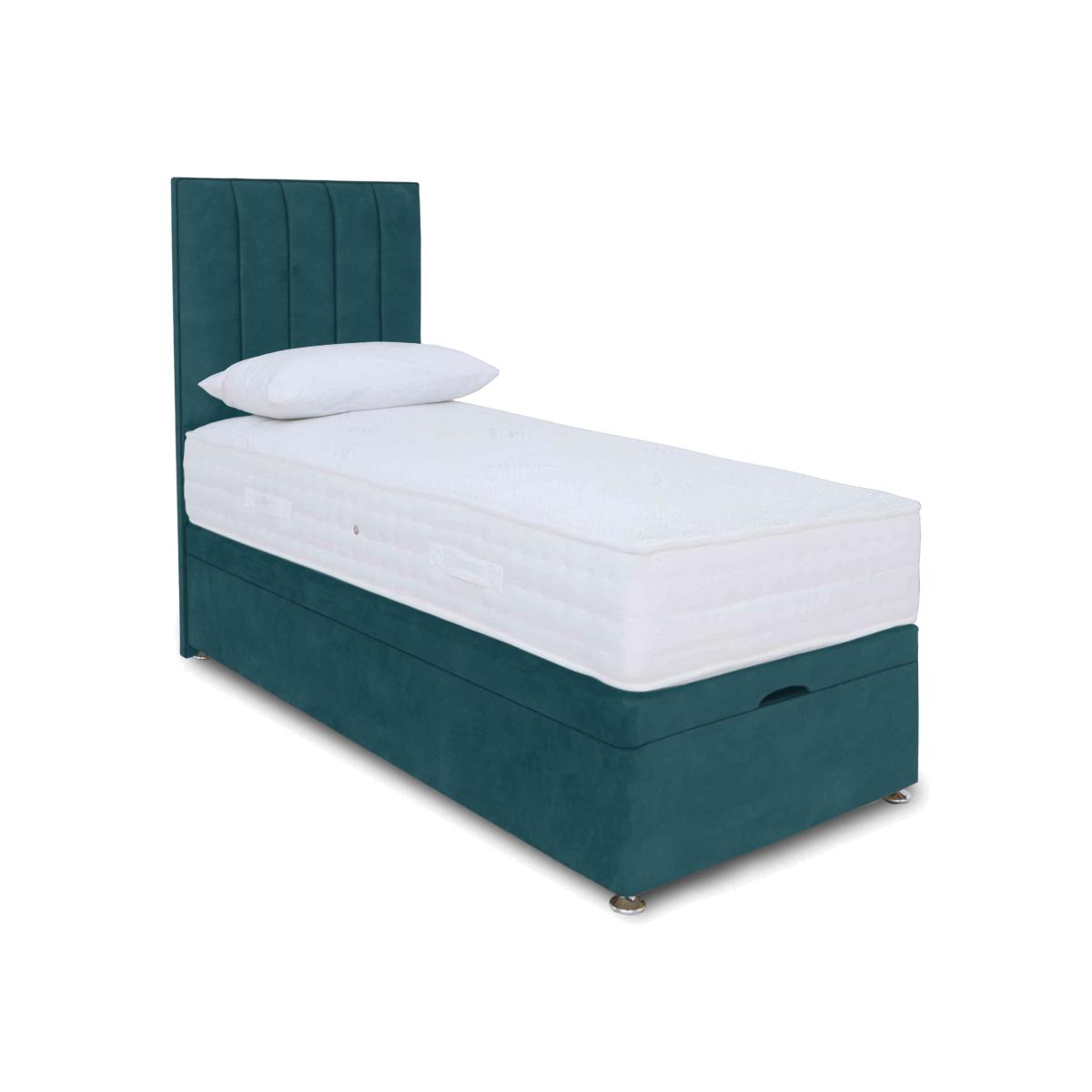 Look forward to better sleep on this ultra-comfy pocket spring and memory foam mattress. And keep your bedroom neat and tidy with the divan base’s roomy ottoman storage space. Why you'll love it Ottoman divan set with pocket spring and memory foam mattress promises all round better sleep. Get the best of both worlds at a great-value price. AdvantEdge® pocket spring system has 1000 springs in king size. It’s designed to offer total body support across the entire sleep surface. Ensures correct spinal alignment for better quality of sleep. Layer of cushioning memory foam conforms to your body’s shape and weight. Improves pressure relief and reduces aches and pains. Breathable micro-quilted knitted stretch cover made with Tencel®. Hypoallergenic. Divan set includes a platform-top base with end-opening ottoman storage. Available in a wide selection of stylish upholstery fabrics. Make life even easier – choose the electric-powered version of this ottoman divan set. Made in the UK by Highgrove and exclusive to Furniture Village. This ottoman divan set is part of the Sleep Story Memory Pocket range. Shop the Sleep Story Memory Pocket range for mattresses, divan sets, electric ottoman beds and more. What you need to know Headboard is an optional extra. Mattress type: Hybrid. Depth: 25 cm. Weight:Small single 15.6 kg, single 18.72 kg, small double 24.96 kg, double 28.08 kg, king 31.2 kg and super king 37.4 kg. Firmness: Medium. Springs: 1000 pocket springs in king size. Pillow top: No. Fillings: Memory foam. Cover: Tencel® knitted stretch cover. Requires turning: No. Base type: Platform top with end-opening ottoman storage. Sizes: Small single, single, small double, double, king and super king. Mattress care:Air for 4 hours before using to remove any odour. Indentations caused by settlement of fillings or body weight are normal and are not considered defects. If used on a slatted bed frame, the space between slats must be no wider than 7.5 cm. Spaces wider than this may cause excess dipping of the mattress and invalidate the guarantee. Always use a mattress protector. Rotate regularly. Divan base care: Clean upholstery weekly using a soft brush or vacuum with the curtain attachment. Professional cleaning advised for oil- and grease-based stains. Be careful care when opening and closing the ottoman base. Ordering a small double, double, king or super king size? Your divan base will be supplied in two halves for easier access.