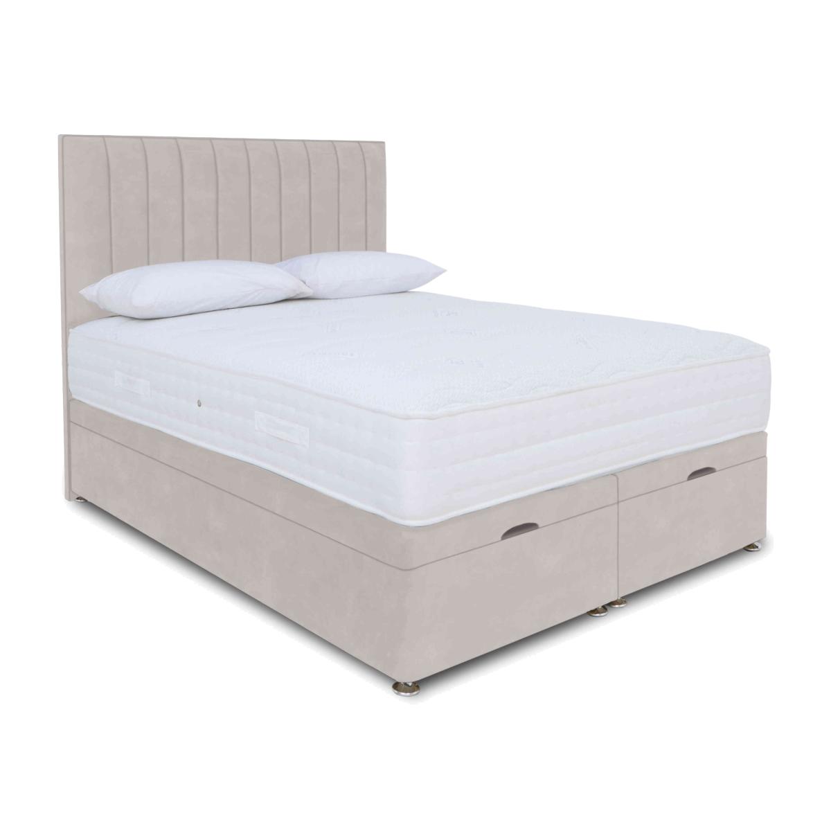 Look forward to better sleep on this ultra-comfy pocket spring and memory foam mattress. And keep your bedroom neat and tidy with the divan base’s roomy ottoman storage space. Why you'll love it Ottoman divan set with pocket spring and memory foam mattress promises all round better sleep. Get the best of both worlds at a great-value price. AdvantEdge® pocket spring system has 1000 springs in king size. It’s designed to offer total body support across the entire sleep surface. Ensures correct spinal alignment for better quality of sleep. Layer of cushioning memory foam conforms to your body’s shape and weight. Improves pressure relief and reduces aches and pains. Breathable micro-quilted knitted stretch cover made with Tencel®. Hypoallergenic. Divan set includes a platform-top base with end-opening ottoman storage. Available in a wide selection of stylish upholstery fabrics. Make life even easier – choose the electric-powered version of this ottoman divan set. Made in the UK by Highgrove and exclusive to Furniture Village. This ottoman divan set is part of the Sleep Story Memory Pocket range. Shop the Sleep Story Memory Pocket range for mattresses, divan sets, electric ottoman beds and more. What you need to know Headboard is an optional extra. Mattress type: Hybrid. Depth: 25 cm. Weight:Small single 15.6 kg, single 18.72 kg, small double 24.96 kg, double 28.08 kg, king 31.2 kg and super king 37.4 kg. Firmness: Medium. Springs: 1000 pocket springs in king size. Pillow top: No. Fillings: Memory foam. Cover: Tencel® knitted stretch cover. Requires turning: No. Base type: Platform top with end-opening ottoman storage. Sizes: Small single, single, small double, double, king and super king. Mattress care:Air for 4 hours before using to remove any odour. Indentations caused by settlement of fillings or body weight are normal and are not considered defects. If used on a slatted bed frame, the space between slats must be no wider than 7.5 cm. Spaces wider than this may cause excess dipping of the mattress and invalidate the guarantee. Always use a mattress protector. Rotate regularly. Divan base care: Clean upholstery weekly using a soft brush or vacuum with the curtain attachment. Professional cleaning advised for oil- and grease-based stains. Be careful care when opening and closing the ottoman base. Ordering a small double, double, king or super king size? Your divan base will be supplied in two halves for easier access.