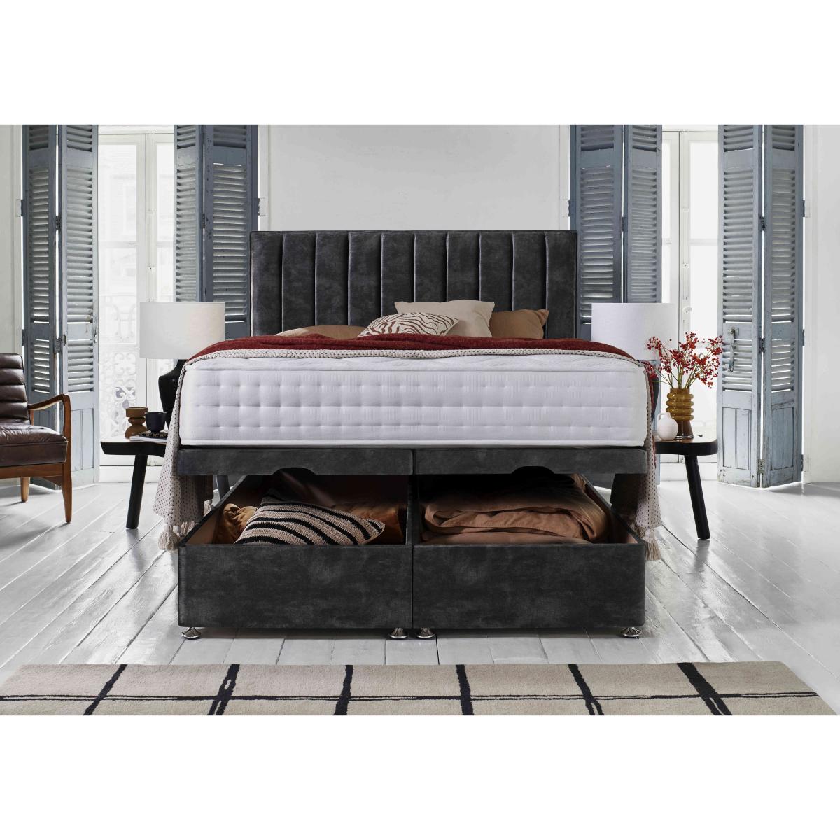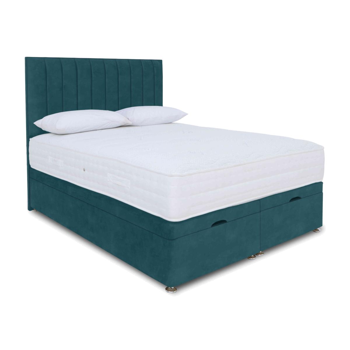 Look forward to better sleep on this ultra-comfy pocket spring and memory foam mattress. And keep your bedroom neat and tidy with the divan base’s roomy ottoman storage space. Why you'll love it Ottoman divan set with pocket spring and memory foam mattress promises all round better sleep. Get the best of both worlds at a great-value price. AdvantEdge® pocket spring system has 1000 springs in king size. It’s designed to offer total body support across the entire sleep surface. Ensures correct spinal alignment for better quality of sleep. Layer of cushioning memory foam conforms to your body’s shape and weight. Improves pressure relief and reduces aches and pains. Breathable micro-quilted knitted stretch cover made with Tencel®. Hypoallergenic. Divan set includes a platform-top base with end-opening ottoman storage. Available in a wide selection of stylish upholstery fabrics. Make life even easier – choose the electric-powered version of this ottoman divan set. Made in the UK by Highgrove and exclusive to Furniture Village. This ottoman divan set is part of the Sleep Story Memory Pocket range. Shop the Sleep Story Memory Pocket range for mattresses, divan sets, electric ottoman beds and more. What you need to know Headboard is an optional extra. Mattress type: Hybrid. Depth: 25 cm. Weight:Small single 15.6 kg, single 18.72 kg, small double 24.96 kg, double 28.08 kg, king 31.2 kg and super king 37.4 kg. Firmness: Medium. Springs: 1000 pocket springs in king size. Pillow top: No. Fillings: Memory foam. Cover: Tencel® knitted stretch cover. Requires turning: No. Base type: Platform top with end-opening ottoman storage. Sizes: Small single, single, small double, double, king and super king. Mattress care:Air for 4 hours before using to remove any odour. Indentations caused by settlement of fillings or body weight are normal and are not considered defects. If used on a slatted bed frame, the space between slats must be no wider than 7.5 cm. Spaces wider than this may cause excess dipping of the mattress and invalidate the guarantee. Always use a mattress protector. Rotate regularly. Divan base care: Clean upholstery weekly using a soft brush or vacuum with the curtain attachment. Professional cleaning advised for oil- and grease-based stains. Be careful care when opening and closing the ottoman base. Ordering a small double, double, king or super king size? Your divan base will be supplied in two halves for easier access.