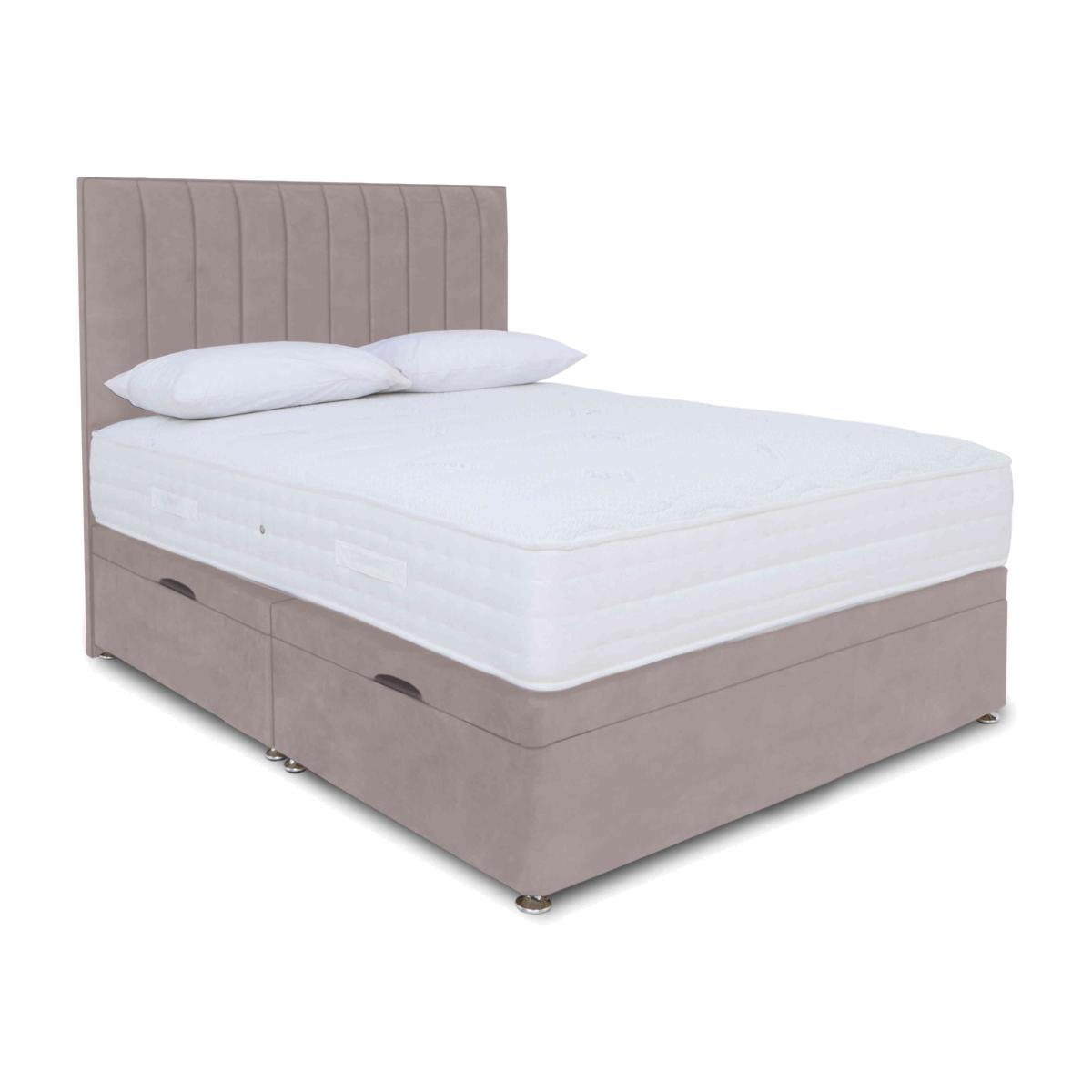 An extra comfortable pocket spring and memory foam mattress plus extra storage in the divan base – this Sleep Story divan set has it all, and at a great price too. Why you'll love it Ottoman divan set with pocket spring and memory foam mattress promises all round better sleep. Get the best of both worlds at a great-value price. AdvantEdge® pocket spring system has 1000 springs in king size. It’s designed to offer total body support across the entire sleep surface. Ensures correct spinal alignment for better quality of sleep. Layer of cushioning memory foam conforms to your body’s shape and weight. Improves pressure relief and reduces aches and pains. Breathable micro-quilted knitted stretch cover made with Tencel®. Hypoallergenic. Divan set includes a platform-top base with space-saving side-opening ottoman storage. Available in a wide selection of stylish upholstery fabrics. Made in the UK by Highgrove and exclusive to Furniture Village. This ottoman divan set is part of the Sleep Story Memory Pocket range. Shop the Sleep Story Memory Pocket range for mattresses, divan sets, electric ottoman beds and more. What you need to know Headboard is an optional extra. Mattress type: Hybrid. Depth: 25 cm. Weight:Small single 15.6 kg, single 18.72 kg, small double 24.96 kg, double 28.08 kg, king 31.2 kg and super king 37.4 kg. Firmness: Medium. Springs: 1000 pocket springs in king size. Pillow top: No. Fillings: Memory foam. Cover: Tencel® knitted stretch cover. Requires turning: No. Base type: Platform top with side-opening ottoman storage. Sizes: Small single, single, small double, double, king and super king. Mattress care:Air for 4 hours before using to remove any odour. Indentations caused by settlement of fillings or body weight are normal and are not considered defects. If used on a slatted bed frame, the space between slats must be no wider than 7.5 cm. Spaces wider than this may cause excess dipping of the mattress and invalidate the guarantee. Always use a mattress protector. Rotate regularly. Divan base care: Clean upholstery weekly using a soft brush or vacuum with the curtain attachment. Professional cleaning advised for oil- and grease-based stains. Be careful care when opening and closing the ottoman base. Ordering a small double, double, king or super king size? Your divan base will be supplied in two halves for easier access.