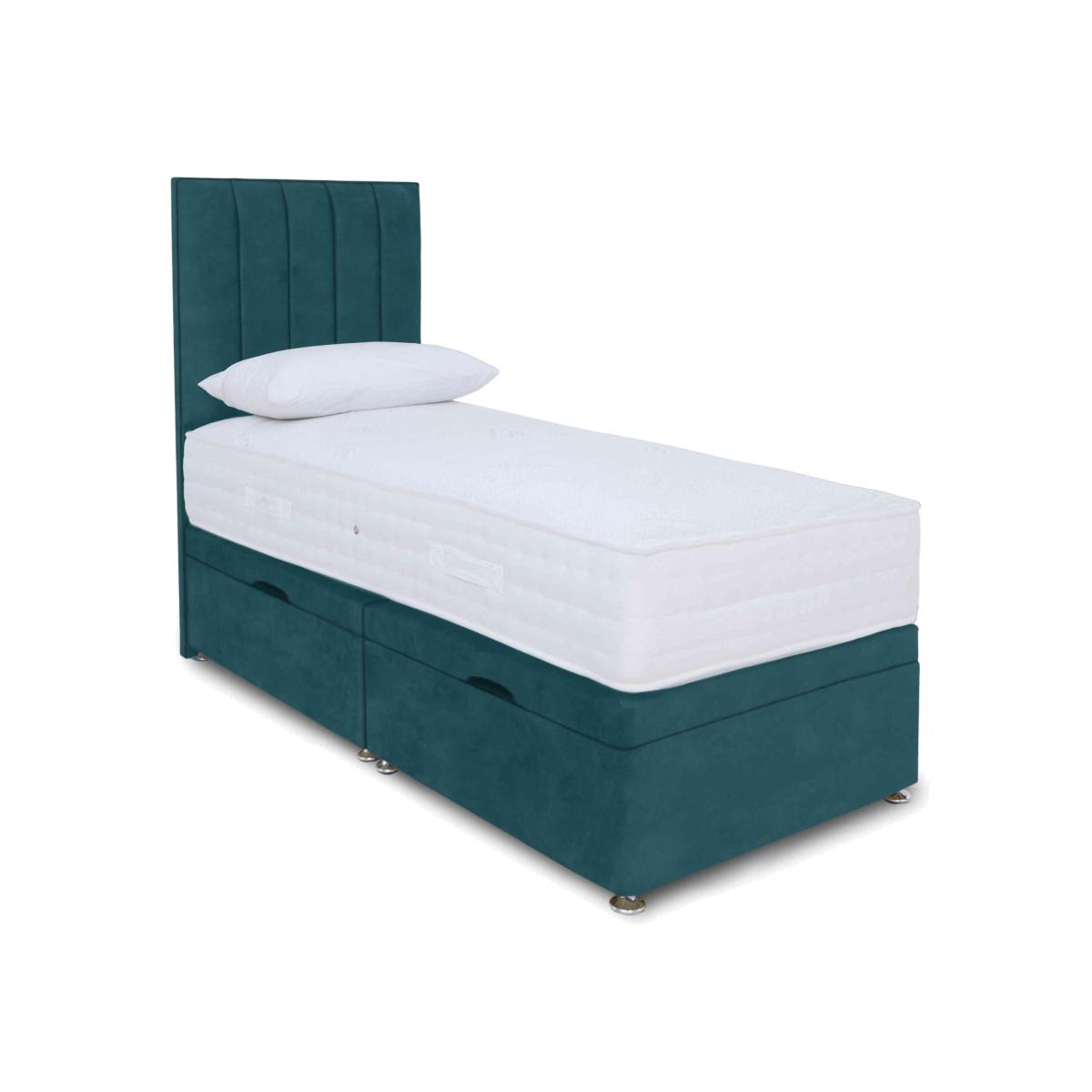 An extra comfortable pocket spring and memory foam mattress plus extra storage in the divan base – this Sleep Story divan set has it all, and at a great price too. Why you'll love it Ottoman divan set with pocket spring and memory foam mattress promises all round better sleep. Get the best of both worlds at a great-value price. AdvantEdge® pocket spring system has 1000 springs in king size. It’s designed to offer total body support across the entire sleep surface. Ensures correct spinal alignment for better quality of sleep. Layer of cushioning memory foam conforms to your body’s shape and weight. Improves pressure relief and reduces aches and pains. Breathable micro-quilted knitted stretch cover made with Tencel®. Hypoallergenic. Divan set includes a platform-top base with space-saving side-opening ottoman storage. Available in a wide selection of stylish upholstery fabrics. Made in the UK by Highgrove and exclusive to Furniture Village. This ottoman divan set is part of the Sleep Story Memory Pocket range. Shop the Sleep Story Memory Pocket range for mattresses, divan sets, electric ottoman beds and more. What you need to know Headboard is an optional extra. Mattress type: Hybrid. Depth: 25 cm. Weight:Small single 15.6 kg, single 18.72 kg, small double 24.96 kg, double 28.08 kg, king 31.2 kg and super king 37.4 kg. Firmness: Medium. Springs: 1000 pocket springs in king size. Pillow top: No. Fillings: Memory foam. Cover: Tencel® knitted stretch cover. Requires turning: No. Base type: Platform top with side-opening ottoman storage. Sizes: Small single, single, small double, double, king and super king. Mattress care:Air for 4 hours before using to remove any odour. Indentations caused by settlement of fillings or body weight are normal and are not considered defects. If used on a slatted bed frame, the space between slats must be no wider than 7.5 cm. Spaces wider than this may cause excess dipping of the mattress and invalidate the guarantee. Always use a mattress protector. Rotate regularly. Divan base care: Clean upholstery weekly using a soft brush or vacuum with the curtain attachment. Professional cleaning advised for oil- and grease-based stains. Be careful care when opening and closing the ottoman base. Ordering a small double, double, king or super king size? Your divan base will be supplied in two halves for easier access.