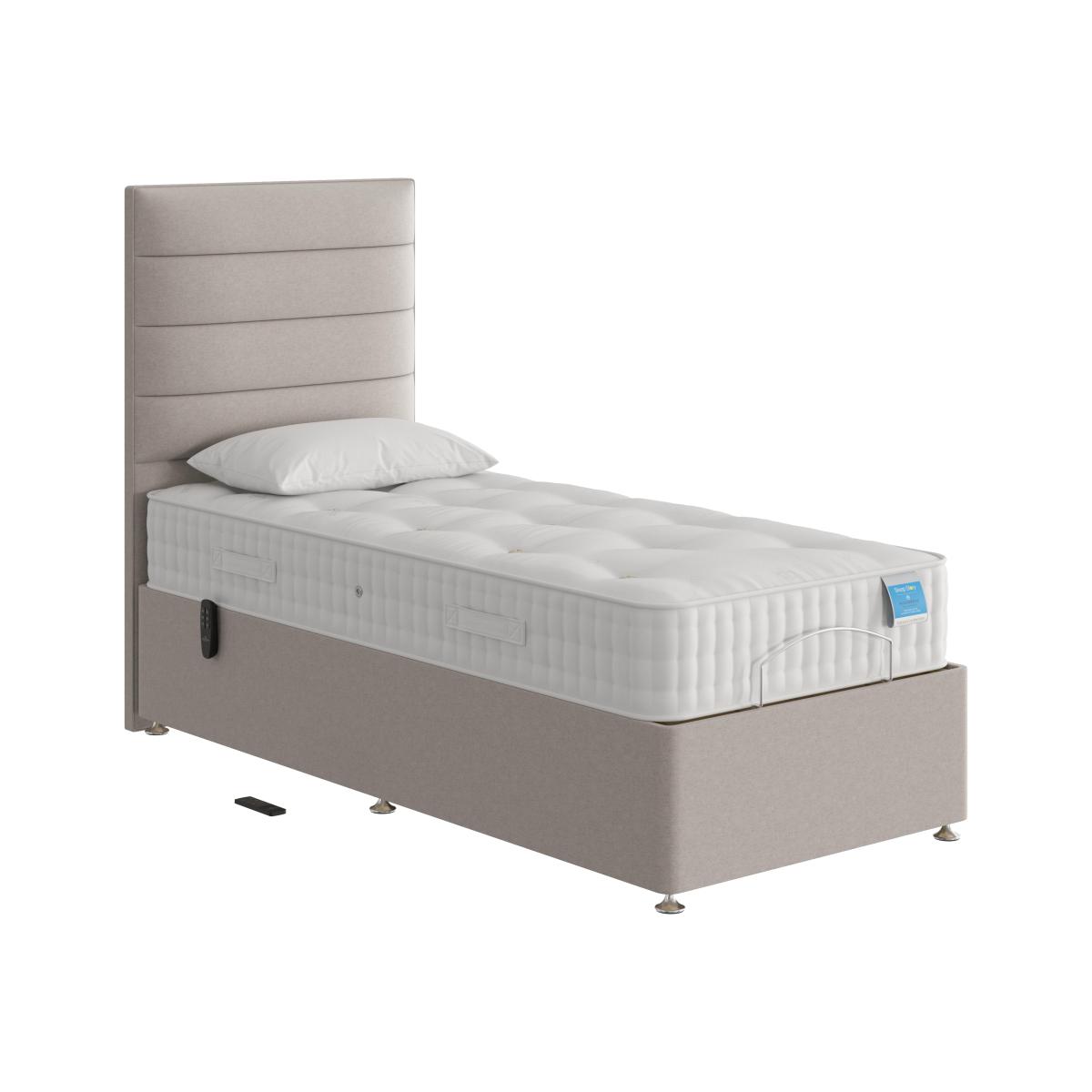 Are you ready to say goodbye to restless nights and say hello to feeling refreshed? Bring home the Sleep Story Natural Comfort Adjustable range and find your optimal sleep position in seconds. Ideal for those with reduced mobility, back pain or joint issues, the fully remote-operated adjustable beds in this range give you total control over your sleep and your comfort. A wireless handset lets you move the bed base and mattress up and down with ease, while you enjoy whole-body support the entire time. With a choice between a soft and firm mattress and a range of sizes, there’s a tailor-made bed for everyone. And it’s a winner for style-lovers too, with a range of beautiful fabrics, colours and drawer storage options. Find your optimum sleep position in seconds with the Sleep Story Natural Comfort Adjustable divan bed. Made for sleepers with joint or mobility issues, it makes falling asleep and waking up easier than ever. Why you'll love it. Adjustable pocket sprung mattress with all-natural fillings that moves with your body. Fully adjustable so you can find your perfect position with ease. Wireless handheld remote gives you full control over your comfort. 1000 pocket springs in king size provide total body comfort. Natural fillings are hypoallergenic. Make the most of your space with optional drawer storage. Contemporary divan available in a range of stylish fabrics and colours. Made in the UK exclusive to Furniture Village. The Sleep Story Natural Comfort Adjustable Mattress also includes divan sets with storage. What you need to know. Mattress type: Pocket spring, reflex foam and natural fillings. Depth: 21 cm. Firmness: Soft or firm. Springs: 1000 pocket springs in king size. Pillow top: No. Fillings: 270 GSM Silk, 270 GSM Polyester, 3" Reflex Soft foam. Cover: Cashmere, viscose. Requires turning: No. Sizes: Small single, single, small double, 2 x small single (75cm) make a king size and 2 xsingle (90cm) make a super king. Mattress care: Air for 4 hours before using to remove any odour. Allow at least 4 hours for springs to settle and for mattress to attain its full size. Indentations caused by settlement of fillings or body weight are normal and are not considered defects. If used on a slatted bed frame, the space between slats must be no wider than 7.5 cm. Spaces wider than this may cause excess dipping of the mattress and invalidate the guarantee. Always use a mattress protector. Rotate regularly.