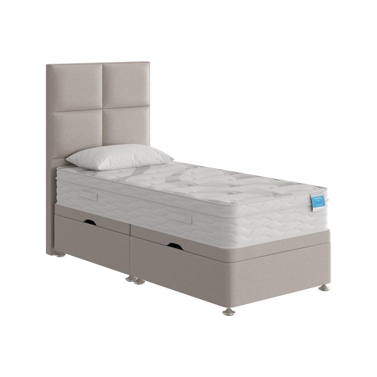 Imagine drifting off to sleep on a beautifully crafted pocket spring mattress layered with natural fillings of cashmere, cotton, wool and silk. The medium-feel Sleep Story Natural Luxury Hybrid mattress combines perfect support with the sumptuous cushioning of natural materials – and it’s hypoallergenic too. Made especially for Furniture Village by Highgrove, the collection includes mattresses in every size from small single to super king as well as a wide choice of divan sets with built-in drawer and ottoman storage upholstered in gorgeous fabrics. The excellent-value Sleep Story Natural Luxury Hybrid range is only available at Furniture Village. With sumptuous layers of cashmere, cotton, wool and silk, this well-crafted pocket spring mattress really does represent affordable luxury. The practical base has roomy side-opening ottoman storage. Only at Furniture Village. Why you'll love it. Exceptional-value ottoman divan set with sumptuous pocket spring and natural fillings mattress. Relax into layers of cashmere, cotton, wool and silk. 1400 pocket springs in king size provide supportive comfort. Hypoallergenic. Made in the UK by Highgrove and exclusive to Furniture Village. Platform-top base has a practical side-opening ottoman storage space. Wide selection of stylish upholstery fabrics. Made in the UK by Highgrove and exclusive to Furniture Village. The Sleep Story Natural Luxury Hybrid range includes a mattress and ottoman divan sets. What you need to know. Headboard is an optional extra. Mattress type: Pocket spring, reflex foam and natural fillings. Depth: 25.5 cm. Firmness: Medium. Springs: 1400 pocket springs in king size. Pillow top: No. Fillings: 5 cm reflex foam, 18 cm fibre, plus cashmere, cotton, wool and silk. Cover: Tencel, Elastance and polyester. Requires turning: No. Base type: Platform top with side-opening ottoman storage. Sizes: Small single, single, small double, double, king and super king. Mattress care: Air for 4 hours before using to remove any odour. Allow at least 4 hours for springs to settle and for mattress to attain its full size. Indentations caused by settlement of fillings or body weight are normal and are not considered defects. If used on a slatted bed frame, the space between slats must be no wider than 7.5 cm. Spaces wider than this may cause excess dipping of the mattress and invalidate the guarantee. Always use a mattress protector. Rotate regularly. Divan base care: Clean upholstery weekly using a soft brush or vacuum with the curtain attachment. Professional cleaning advised for oil- and grease-based stains. Please note: Divan base is supplied in two halves for small double, double, king and super king sizes.