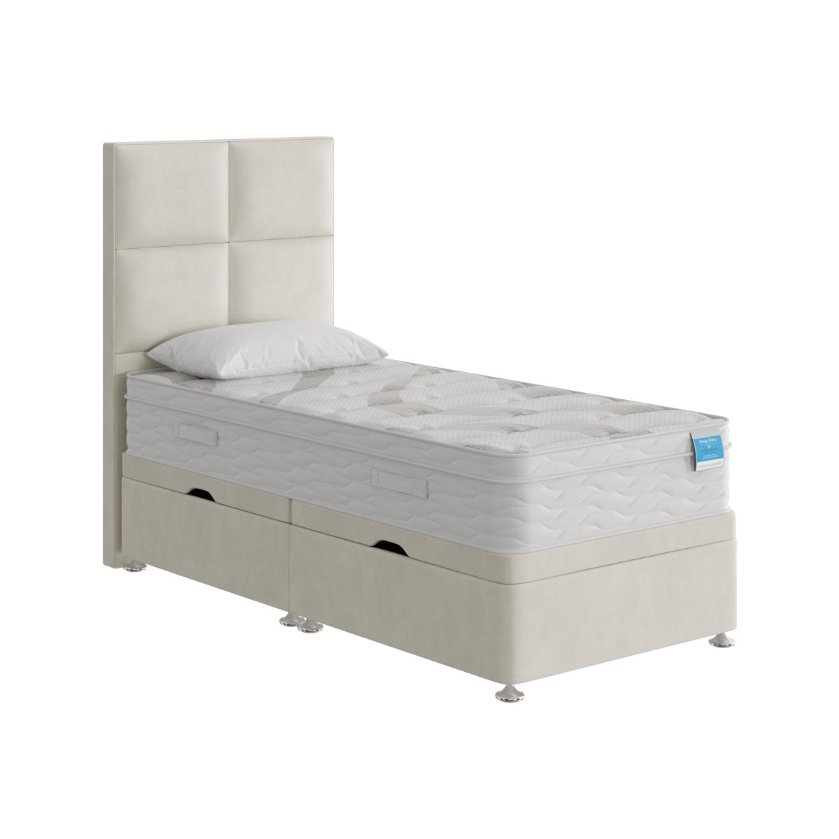 Imagine drifting off to sleep on a beautifully crafted pocket spring mattress layered with natural fillings of cashmere, cotton, wool and silk. The medium-feel Sleep Story Natural Luxury Hybrid mattress combines perfect support with the sumptuous cushioning of natural materials – and it’s hypoallergenic too. Made especially for Furniture Village by Highgrove, the collection includes mattresses in every size from small single to super king as well as a wide choice of divan sets with built-in drawer and ottoman storage upholstered in gorgeous fabrics. The excellent-value Sleep Story Natural Luxury Hybrid range is only available at Furniture Village. With sumptuous layers of cashmere, cotton, wool and silk, this well-crafted pocket spring mattress really does represent affordable luxury. The practical base has roomy side-opening ottoman storage. Only at Furniture Village. Why you'll love it. Exceptional-value ottoman divan set with sumptuous pocket spring and natural fillings mattress. Relax into layers of cashmere, cotton, wool and silk. 1400 pocket springs in king size provide supportive comfort. Hypoallergenic. Made in the UK by Highgrove and exclusive to Furniture Village. Platform-top base has a practical side-opening ottoman storage space. Wide selection of stylish upholstery fabrics. Made in the UK by Highgrove and exclusive to Furniture Village. The Sleep Story Natural Luxury Hybrid range includes a mattress and ottoman divan sets. What you need to know. Headboard is an optional extra. Mattress type: Pocket spring, reflex foam and natural fillings. Depth: 25.5 cm. Firmness: Medium. Springs: 1400 pocket springs in king size. Pillow top: No. Fillings: 5 cm reflex foam, 18 cm fibre, plus cashmere, cotton, wool and silk. Cover: Tencel, Elastance and polyester. Requires turning: No. Base type: Platform top with side-opening ottoman storage. Sizes: Small single, single, small double, double, king and super king. Mattress care: Air for 4 hours before using to remove any odour. Allow at least 4 hours for springs to settle and for mattress to attain its full size. Indentations caused by settlement of fillings or body weight are normal and are not considered defects. If used on a slatted bed frame, the space between slats must be no wider than 7.5 cm. Spaces wider than this may cause excess dipping of the mattress and invalidate the guarantee. Always use a mattress protector. Rotate regularly. Divan base care: Clean upholstery weekly using a soft brush or vacuum with the curtain attachment. Professional cleaning advised for oil- and grease-based stains. Please note: Divan base is supplied in two halves for small double, double, king and super king sizes.