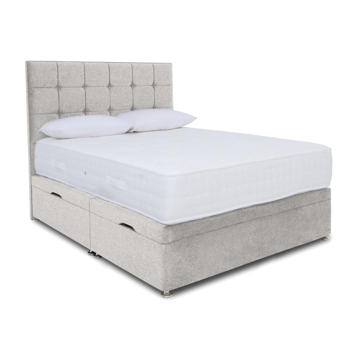 Smaller bedroom? This divan set with side-opening ottoman storage is designed to fit any space. You’ll love the extra-firm pocket spring mattress too. Why you'll love it The mattress in this expertly crafted ottoman divan set has the extra-firm support your body needs. Rejuvenating comfort and superb support at a great-value price. AdvantEdge® pocket spring system has 2000 springs in king size. It’s designed to offer total body support across the entire sleep surface. Ensures correct spinal alignment for better quality of sleep. DynamicEdge active side support maximises the sleep surface and prevents roll off. Stretch damask cover. Hypoallergenic. Divan set includes a platform-top base with space-saving side-opening ottoman storage. Available in a wide selection of stylish upholstery fabrics. Made in the UK by Highgrove and exclusive to Furniture Village. This ottoman divan set is part of the Sleep Story Ortho 2000 range. Shop the Sleep Story Ortho 2000 range for mattresses, divan sets, electric ottoman beds and more. What you need to know Headboard is an optional extra. Mattress type: Pocket spring. Depth: 30 cm. Weight:Small single 26 kg, single 31.2 kg, small double 41.6 kg, double 46.8 kg, king 52 kg and super king 62.4 kg. Firmness: Extra firm. Springs: 2000 pocket springs in king size. Pillow top: No. Fillings: Foam and fibre. Cover: Stretch fabric. Requires turning: Yes. Base type: Platform top with side-opening ottoman storage. Sizes: Small single, single, small double, double, king and super king. Mattress care:Air for 4 hours before using to remove any odour. Indentations caused by settlement of fillings or body weight are normal and are not considered defects. If used on a slatted bed frame, the space between slats must be no wider than 7.5 cm. Spaces wider than this may cause excess dipping of the mattress and invalidate the guarantee. Always use a mattress protector. Rotate regularly. Divan base care: Clean upholstery weekly using a soft brush or vacuum with the curtain attachment. Professional cleaning advised for oil- and grease-based stains. Be careful care when opening and closing the ottoman base. Ordering a small double, double, king or super king size? Your divan base will be supplied in two halves for easier access.