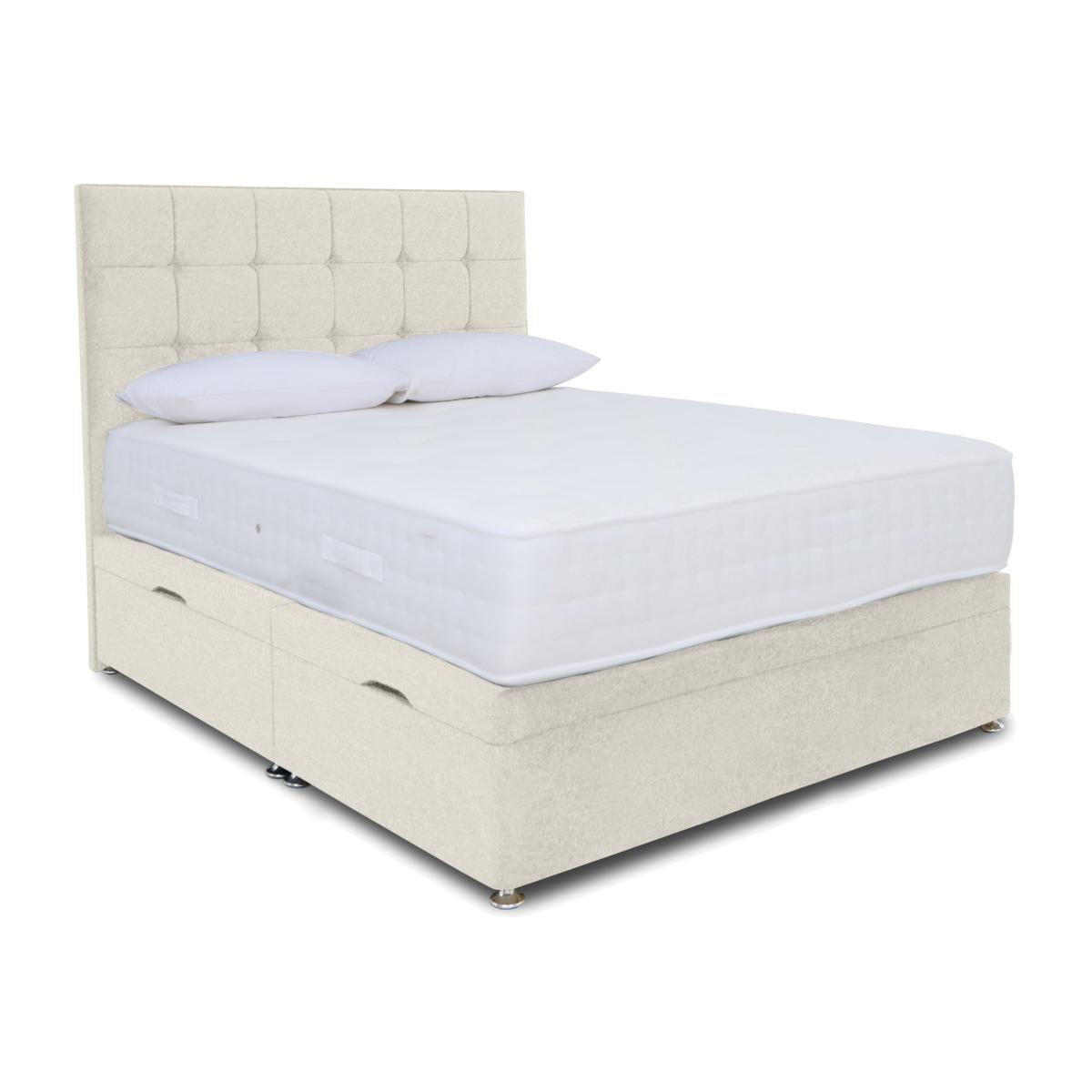 Smaller bedroom? This divan set with side-opening ottoman storage is designed to fit any space. You’ll love the extra-firm pocket spring mattress too. Why you'll love it The mattress in this expertly crafted ottoman divan set has the extra-firm support your body needs. Rejuvenating comfort and superb support at a great-value price. AdvantEdge® pocket spring system has 2000 springs in king size. It’s designed to offer total body support across the entire sleep surface. Ensures correct spinal alignment for better quality of sleep. DynamicEdge active side support maximises the sleep surface and prevents roll off. Stretch damask cover. Hypoallergenic. Divan set includes a platform-top base with space-saving side-opening ottoman storage. Available in a wide selection of stylish upholstery fabrics. Made in the UK by Highgrove and exclusive to Furniture Village. This ottoman divan set is part of the Sleep Story Ortho 2000 range. Shop the Sleep Story Ortho 2000 range for mattresses, divan sets, electric ottoman beds and more. What you need to know Headboard is an optional extra. Mattress type: Pocket spring. Depth: 30 cm. Weight:Small single 26 kg, single 31.2 kg, small double 41.6 kg, double 46.8 kg, king 52 kg and super king 62.4 kg. Firmness: Extra firm. Springs: 2000 pocket springs in king size. Pillow top: No. Fillings: Foam and fibre. Cover: Stretch fabric. Requires turning: Yes. Base type: Platform top with side-opening ottoman storage. Sizes: Small single, single, small double, double, king and super king. Mattress care:Air for 4 hours before using to remove any odour. Indentations caused by settlement of fillings or body weight are normal and are not considered defects. If used on a slatted bed frame, the space between slats must be no wider than 7.5 cm. Spaces wider than this may cause excess dipping of the mattress and invalidate the guarantee. Always use a mattress protector. Rotate regularly. Divan base care: Clean upholstery weekly using a soft brush or vacuum with the curtain attachment. Professional cleaning advised for oil- and grease-based stains. Be careful care when opening and closing the ottoman base. Ordering a small double, double, king or super king size? Your divan base will be supplied in two halves for easier access.