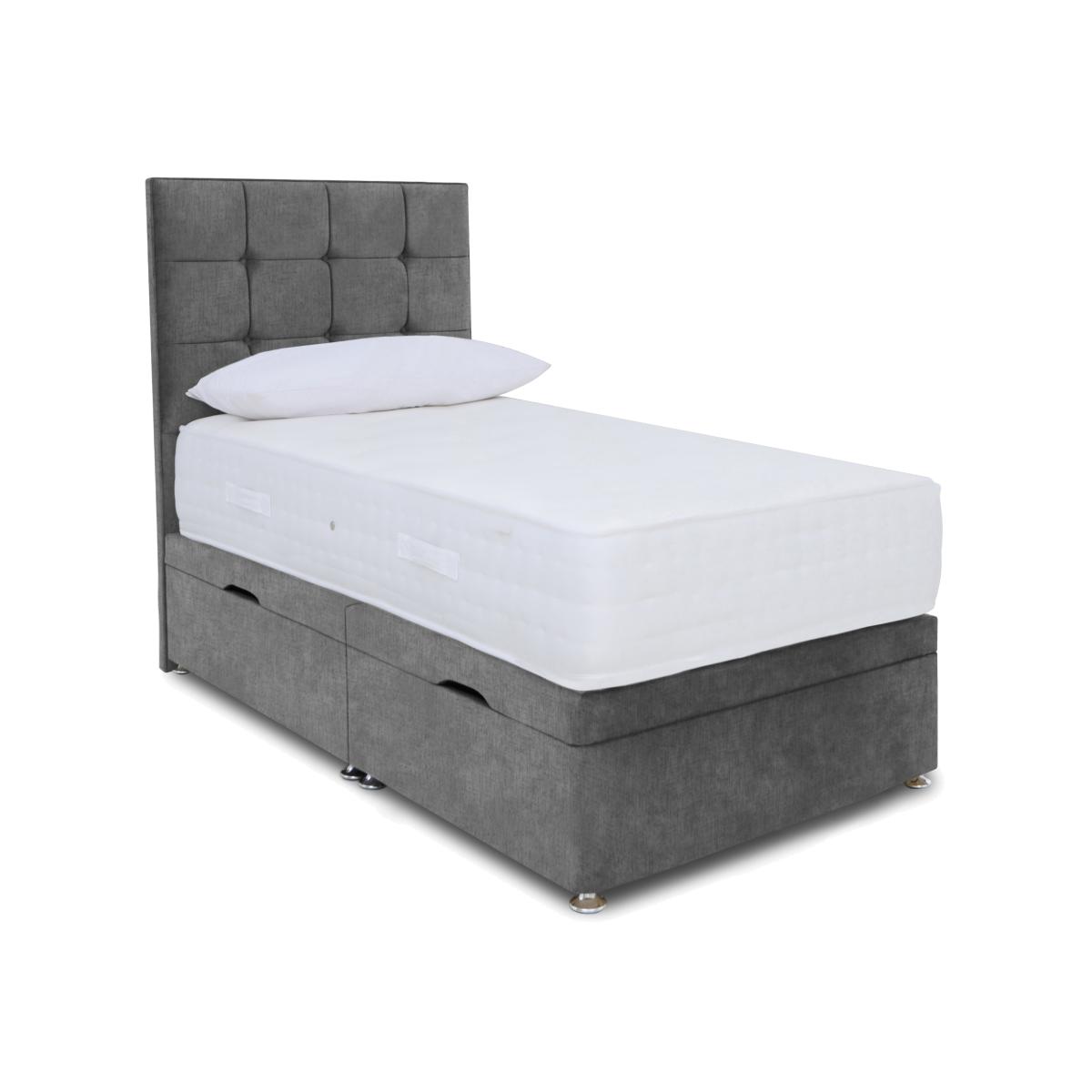Smaller bedroom? This divan set with side-opening ottoman storage is designed to fit any space. You’ll love the extra-firm pocket spring mattress too. Why you'll love it The mattress in this expertly crafted ottoman divan set has the extra-firm support your body needs. Rejuvenating comfort and superb support at a great-value price. AdvantEdge® pocket spring system has 2000 springs in king size. It’s designed to offer total body support across the entire sleep surface. Ensures correct spinal alignment for better quality of sleep. DynamicEdge active side support maximises the sleep surface and prevents roll off. Stretch damask cover. Hypoallergenic. Divan set includes a platform-top base with space-saving side-opening ottoman storage. Available in a wide selection of stylish upholstery fabrics. Made in the UK by Highgrove and exclusive to Furniture Village. This ottoman divan set is part of the Sleep Story Ortho 2000 range. Shop the Sleep Story Ortho 2000 range for mattresses, divan sets, electric ottoman beds and more. What you need to know Headboard is an optional extra. Mattress type: Pocket spring. Depth: 30 cm. Weight:Small single 26 kg, single 31.2 kg, small double 41.6 kg, double 46.8 kg, king 52 kg and super king 62.4 kg. Firmness: Extra firm. Springs: 2000 pocket springs in king size. Pillow top: No. Fillings: Foam and fibre. Cover: Stretch fabric. Requires turning: Yes. Base type: Platform top with side-opening ottoman storage. Sizes: Small single, single, small double, double, king and super king. Mattress care:Air for 4 hours before using to remove any odour. Indentations caused by settlement of fillings or body weight are normal and are not considered defects. If used on a slatted bed frame, the space between slats must be no wider than 7.5 cm. Spaces wider than this may cause excess dipping of the mattress and invalidate the guarantee. Always use a mattress protector. Rotate regularly. Divan base care: Clean upholstery weekly using a soft brush or vacuum with the curtain attachment. Professional cleaning advised for oil- and grease-based stains. Be careful care when opening and closing the ottoman base. Ordering a small double, double, king or super king size? Your divan base will be supplied in two halves for easier access.