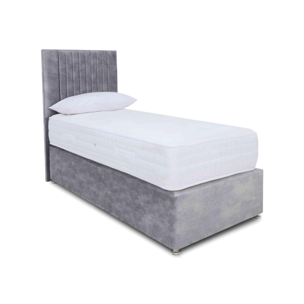 This very affordable divan set includes a luxurious pocket spring mattress with all-natural fillings and a divan base with optional storage drawers. Why you'll love it Divan set with pocket spring mattress layered with wool, silk, cashmere and cotton. The sumptuous feel of all-natural matress fillings at a great-value price. AdvantEdge® pocket spring system has 1000 springs in king size. It’s designed to offer total body support across the entire sleep surface. Ensures correct spinal alignment for better quality of sleep. DynamicEdge active side support maximises the sleep surface and prevents roll off. Breathable stretch fabric cover made with Tencel®. Hypoallergenic. Divan set includes a platform-top base with optional storage drawers. Available in a wide selection of stylish upholstery fabrics. Made in the UK by Highgrove and exclusive to Furniture Village. This divan set is part of the Sleep Story Pocket Luxury range. Shop the Sleep Story Pocket Luxury range for mattresses, divan sets, electric ottoman beds and more. What you need to know Headboard is an optional extra. Mattress type: Pocket spring. Depth: 28 cm. Weight:Small single 21.1 kg, single 25.32 kg, small double 33.76 kg, double 37.98 kg, king 42.2 kg and super king 50.64 kg. Firmness: Medium. Springs: 1000 pocket springs in king size. Pillow top: No. Fillings: Wool, cotton, silk, cashmere, foam and polyester. Cover: Tencel® knitted stretch fabric cover. Requires turning: Yes. Base type: Platform top with optional storage drawers. Sizes: Small single, single, small double, double, king and super king. Mattress care:Air for 4 hours before using to remove any odour. Indentations caused by settlement of fillings or body weight are normal and are not considered defects. If used on a slatted bed frame, the space between slats must be no wider than 7.5 cm. Spaces wider than this may cause excess dipping of the mattress and invalidate the guarantee. Always use a mattress protector. Rotate regularly. Divan base care: Clean upholstery weekly using a soft brush or vacuum with the curtain attachment. Professional cleaning advised for oil- and grease-based stains. Ordering a small double, double, king or super king size? Your divan base will be supplied in two halves for easier access.