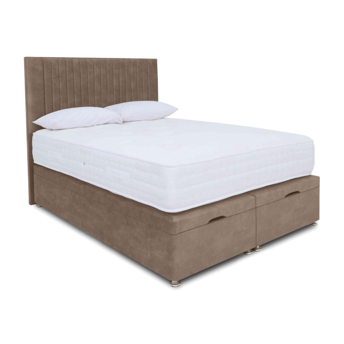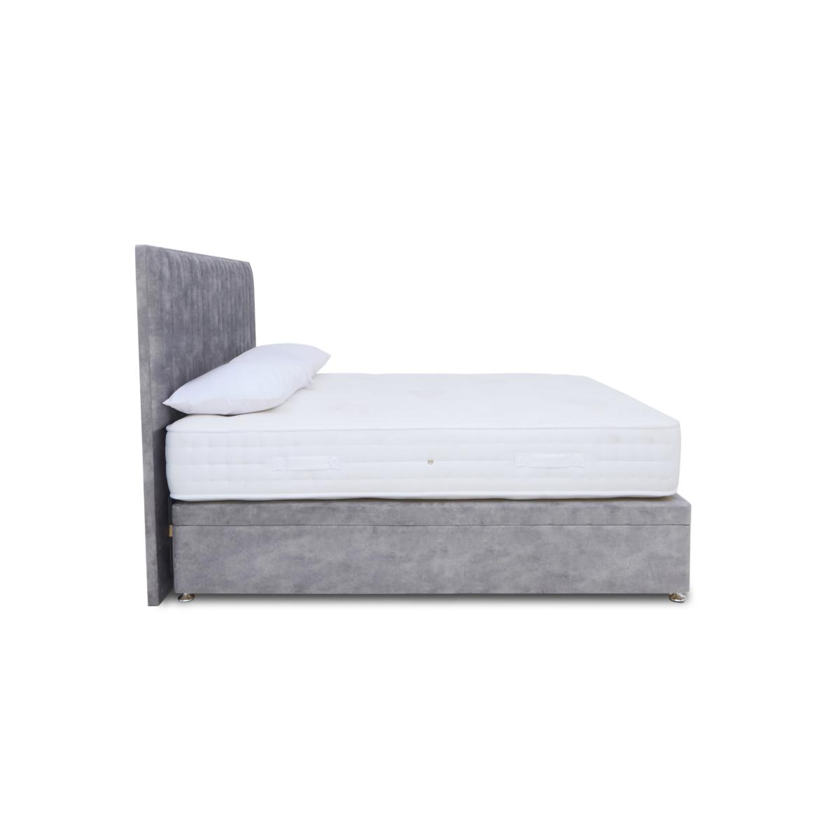 Enjoy extra bedroom storage space and extra luxurious mattress comfort with the Sleep Story Pocket Luxury ottoman divan set. Why you'll love it Ottoman divan set with pocket spring mattress layered with wool, silk, cashmere and cotton. The sumptuous feel of all-natural matress fillings at a great-value price. AdvantEdge® pocket spring system has 1000 springs in king size. It’s designed to offer total body support across the entire sleep surface. Ensures correct spinal alignment for better quality of sleep. DynamicEdge active side support maximises the sleep surface and prevents roll off. Breathable stretch fabric cover made with Tencel®. Hypoallergenic. Divan set includes a platform-top base with end-opening ottoman storage. Available in a wide selection of stylish upholstery fabrics. Made in the UK by Highgrove and exclusive to Furniture Village. This ottoman divan set is part of the Sleep Story Pocket Luxury range. Shop the Sleep Story Pocket Luxury range for mattresses, divan sets, electric ottoman beds and more. What you need to know Headboard is an optional extra. Mattress type: Pocket spring. Depth: 28 cm. Weight:Small single 21.1 kg, single 25.32 kg, small double 33.76 kg, double 37.98 kg, king 42.2 kg and super king 50.64 kg. Firmness: Medium. Springs: 1000 pocket springs in king size. Pillow top: No. Fillings: Wool, cotton, silk, cashmere, foam and polyester. Cover: Tencel® knitted stretch fabric cover. Requires turning: Yes. Base type: Platform top with end-opening ottoman storage. Sizes: Small single, single, small double, double, king and super king. Mattress care:Air for 4 hours before using to remove any odour. Indentations caused by settlement of fillings or body weight are normal and are not considered defects. If used on a slatted bed frame, the space between slats must be no wider than 7.5 cm. Spaces wider than this may cause excess dipping of the mattress and invalidate the guarantee. Always use a mattress protector. Rotate regularly. Divan base care: Clean upholstery weekly using a soft brush or vacuum with the curtain attachment. Professional cleaning advised for oil- and grease-based stains. Be careful care when opening and closing the ottoman base. Ordering a small double, double, king or super king size? Your divan base will be supplied in two halves for easier access.