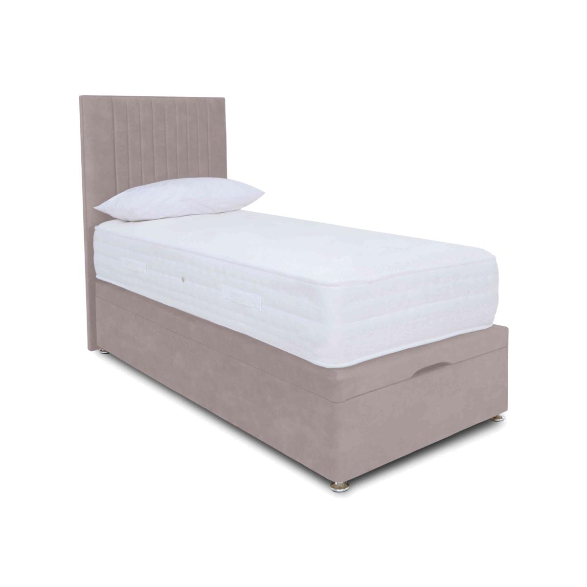 Enjoy extra bedroom storage space and extra luxurious mattress comfort with the Sleep Story Pocket Luxury ottoman divan set. Why you'll love it Ottoman divan set with pocket spring mattress layered with wool, silk, cashmere and cotton. The sumptuous feel of all-natural matress fillings at a great-value price. AdvantEdge® pocket spring system has 1000 springs in king size. It’s designed to offer total body support across the entire sleep surface. Ensures correct spinal alignment for better quality of sleep. DynamicEdge active side support maximises the sleep surface and prevents roll off. Breathable stretch fabric cover made with Tencel®. Hypoallergenic. Divan set includes a platform-top base with end-opening ottoman storage. Available in a wide selection of stylish upholstery fabrics. Made in the UK by Highgrove and exclusive to Furniture Village. This ottoman divan set is part of the Sleep Story Pocket Luxury range. Shop the Sleep Story Pocket Luxury range for mattresses, divan sets, electric ottoman beds and more. What you need to know Headboard is an optional extra. Mattress type: Pocket spring. Depth: 28 cm. Weight:Small single 21.1 kg, single 25.32 kg, small double 33.76 kg, double 37.98 kg, king 42.2 kg and super king 50.64 kg. Firmness: Medium. Springs: 1000 pocket springs in king size. Pillow top: No. Fillings: Wool, cotton, silk, cashmere, foam and polyester. Cover: Tencel® knitted stretch fabric cover. Requires turning: Yes. Base type: Platform top with end-opening ottoman storage. Sizes: Small single, single, small double, double, king and super king. Mattress care:Air for 4 hours before using to remove any odour. Indentations caused by settlement of fillings or body weight are normal and are not considered defects. If used on a slatted bed frame, the space between slats must be no wider than 7.5 cm. Spaces wider than this may cause excess dipping of the mattress and invalidate the guarantee. Always use a mattress protector. Rotate regularly. Divan base care: Clean upholstery weekly using a soft brush or vacuum with the curtain attachment. Professional cleaning advised for oil- and grease-based stains. Be careful care when opening and closing the ottoman base. Ordering a small double, double, king or super king size? Your divan base will be supplied in two halves for easier access.