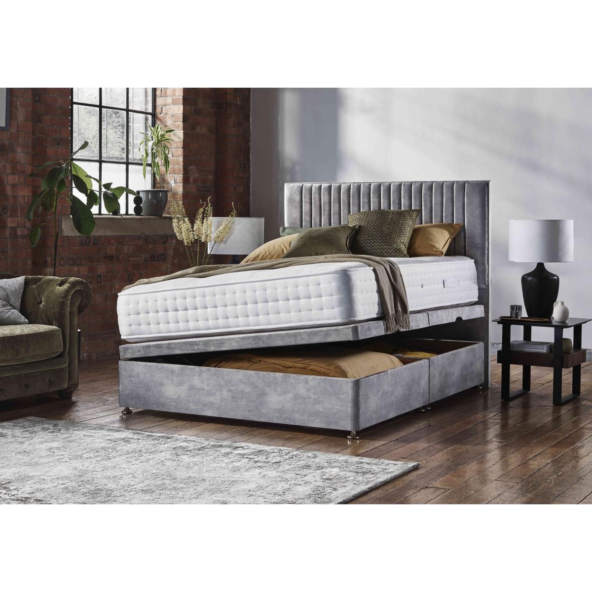 This space-saving ottoman divan set – it opens at the side – also includes a wonderfully luxurious mattress with all-natural fillings. Incredible value. Why you'll love it With soft natural fillings and pocket spring support, this is a truly luxurious mattress. The sumptuous feel of all-natural matress fillings at a great-value price. AdvantEdge® pocket spring system has 1000 springs in king size. It’s designed to offer total body support across the entire sleep surface. Ensures correct spinal alignment for better quality of sleep. DynamicEdge active side support maximises the sleep surface and prevents roll off. Breathable stretch fabric cover made with Tencel®. Hypoallergenic. Divan set includes a platform-top base with space-saving side-opening ottoman storage. Available in a wide selection of stylish upholstery fabrics. Made in the UK by Highgrove and exclusive to Furniture Village. This ottoman divan set is part of the Sleep Story Pocket Luxury range. Shop the Sleep Story Pocket Luxury range for mattresses, divan sets, electric ottoman beds and more. What you need to know Headboard is an optional extra. Mattress type: Pocket spring. Depth: 28 cm. Weight:Small single 21.1 kg, single 25.32 kg, small double 33.76 kg, double 37.98 kg, king 42.2 kg and super king 50.64 kg. Firmness: Medium. Springs: 1000 pocket springs in king size. Pillow top: No. Fillings: Wool, cotton, silk, cashmere, foam and polyester. Cover: Tencel® knitted stretch fabric cover. Requires turning: Yes. Base type: Platform top with electric-powered end-opening ottoman storage. Sizes: Small single, single, small double, double, king and super king. Mattress care:Air for 4 hours before using to remove any odour. Indentations caused by settlement of fillings or body weight are normal and are not considered defects. If used on a slatted bed frame, the space between slats must be no wider than 7.5 cm. Spaces wider than this may cause excess dipping of the mattress and invalidate the guarantee. Always use a mattress protector. Rotate regularly. Divan base care: Clean upholstery weekly using a soft brush or vacuum with the curtain attachment. Professional cleaning advised for oil- and grease-based stains. Be careful care when opening and closing the ottoman base. Ordering a small double, double, king or super king size? Your divan base will be supplied in two halves for easier access.