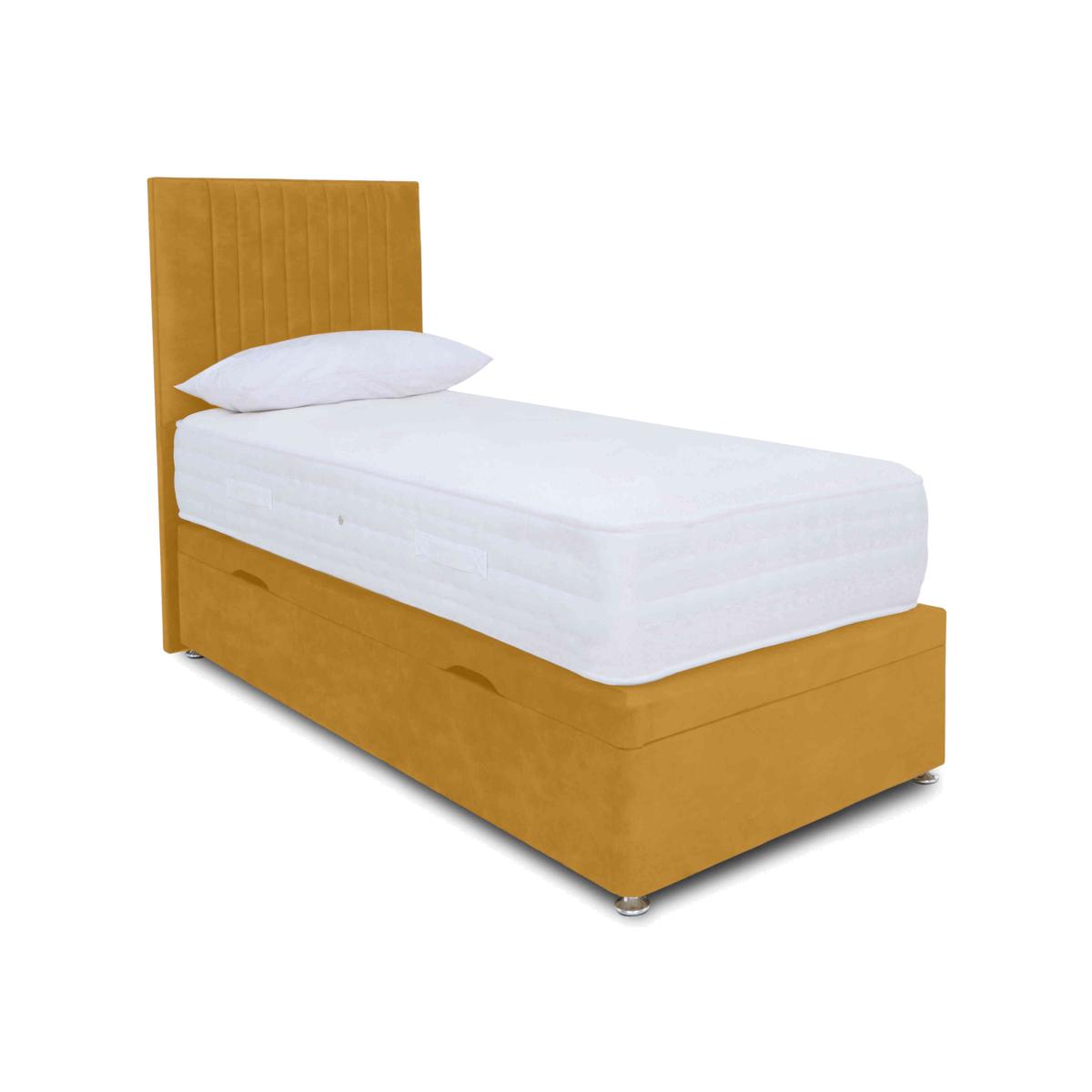 This space-saving ottoman divan set – it opens at the side – also includes a wonderfully luxurious mattress with all-natural fillings. Incredible value. Why you'll love it With soft natural fillings and pocket spring support, this is a truly luxurious mattress. The sumptuous feel of all-natural matress fillings at a great-value price. AdvantEdge® pocket spring system has 1000 springs in king size. It’s designed to offer total body support across the entire sleep surface. Ensures correct spinal alignment for better quality of sleep. DynamicEdge active side support maximises the sleep surface and prevents roll off. Breathable stretch fabric cover made with Tencel®. Hypoallergenic. Divan set includes a platform-top base with space-saving side-opening ottoman storage. Available in a wide selection of stylish upholstery fabrics. Made in the UK by Highgrove and exclusive to Furniture Village. This ottoman divan set is part of the Sleep Story Pocket Luxury range. Shop the Sleep Story Pocket Luxury range for mattresses, divan sets, electric ottoman beds and more. What you need to know Headboard is an optional extra. Mattress type: Pocket spring. Depth: 28 cm. Weight:Small single 21.1 kg, single 25.32 kg, small double 33.76 kg, double 37.98 kg, king 42.2 kg and super king 50.64 kg. Firmness: Medium. Springs: 1000 pocket springs in king size. Pillow top: No. Fillings: Wool, cotton, silk, cashmere, foam and polyester. Cover: Tencel® knitted stretch fabric cover. Requires turning: Yes. Base type: Platform top with electric-powered end-opening ottoman storage. Sizes: Small single, single, small double, double, king and super king. Mattress care:Air for 4 hours before using to remove any odour. Indentations caused by settlement of fillings or body weight are normal and are not considered defects. If used on a slatted bed frame, the space between slats must be no wider than 7.5 cm. Spaces wider than this may cause excess dipping of the mattress and invalidate the guarantee. Always use a mattress protector. Rotate regularly. Divan base care: Clean upholstery weekly using a soft brush or vacuum with the curtain attachment. Professional cleaning advised for oil- and grease-based stains. Be careful care when opening and closing the ottoman base. Ordering a small double, double, king or super king size? Your divan base will be supplied in two halves for easier access.